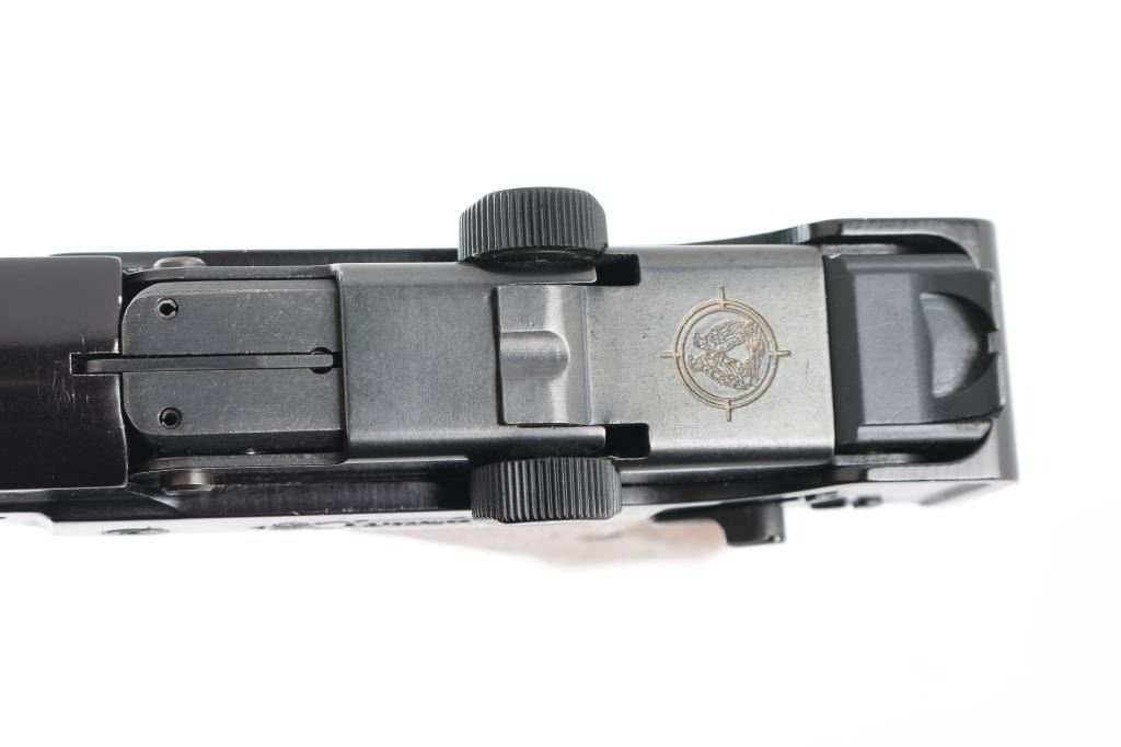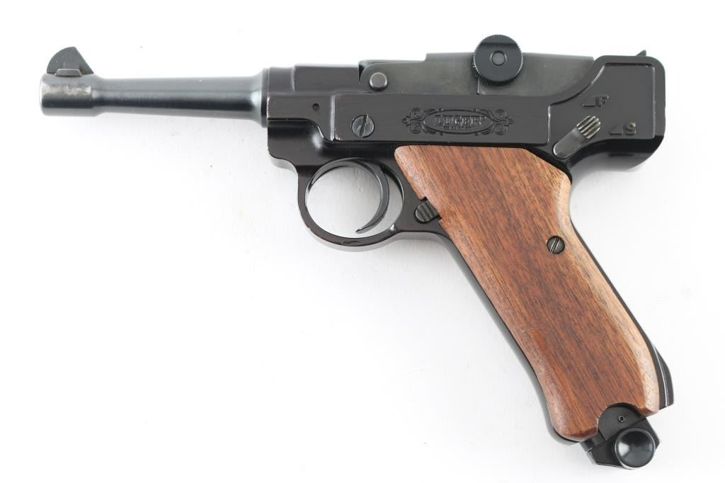 ***SOLD FOR PARTS OR REPAIR ONLY *** Toggle action semi-automatic rimfire pistol modeled after the iconic DWM Parabellum-Pistole, manufactured in S. Hackensack, NJ circa 1969-1980. Features a blued 4.5" tapered barrel, dovetailed blade front sight, fixed rear sight with square notch, smooth crescent trigger, manual safety on the left side of the frame, push button magazine release, 10 round magazine, black finished aluminum frame and checkered two-piece faux-wood synthetic grips. Pistol retains approximately 95% of its original finish showing edge losses & holster wear. Action is smooth, the bore is excellent and the wood grips are fine. *****WARNING***** Safety lever does not function correctly. Condition is NRA Poor (Safety Needs Repair) *** Modern Firearm ***