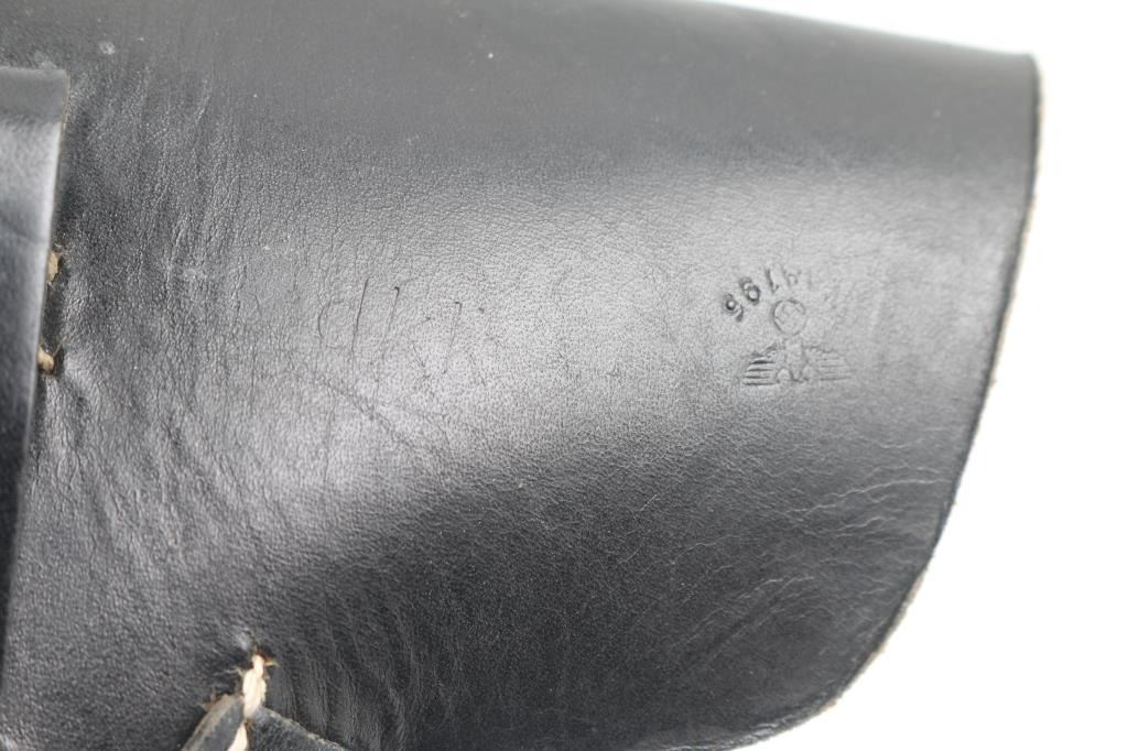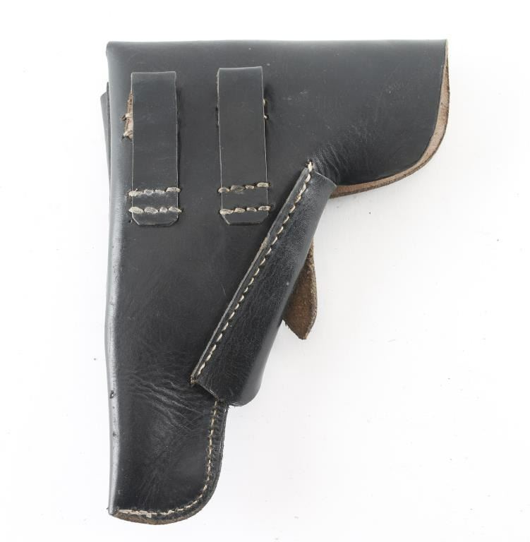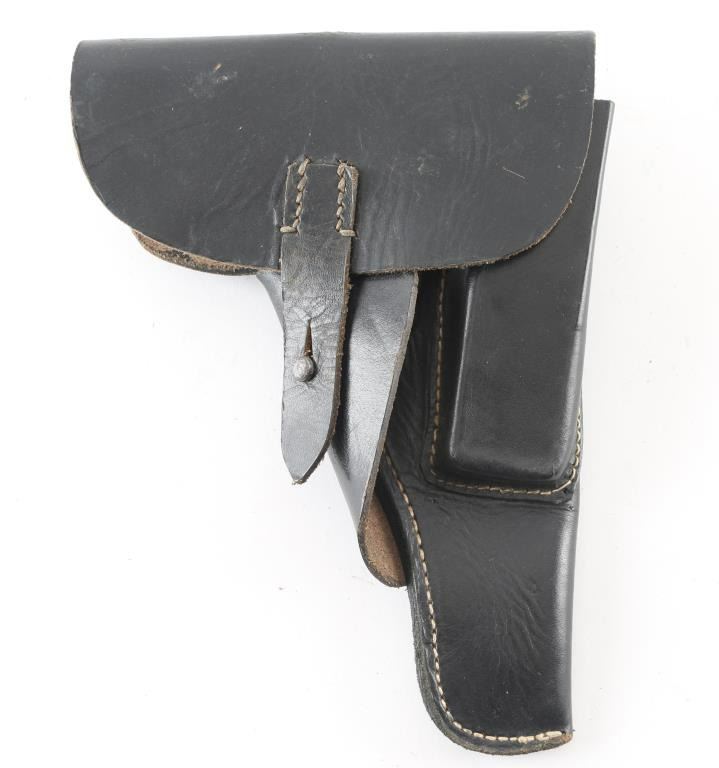 Third Reich era German Military/Police holster for the P-38 Pistol. Soft shell. Black leather construction. Makers code dkk, dated 1944, Waffenamt Eagle/WaW195. Intact, very good condition.