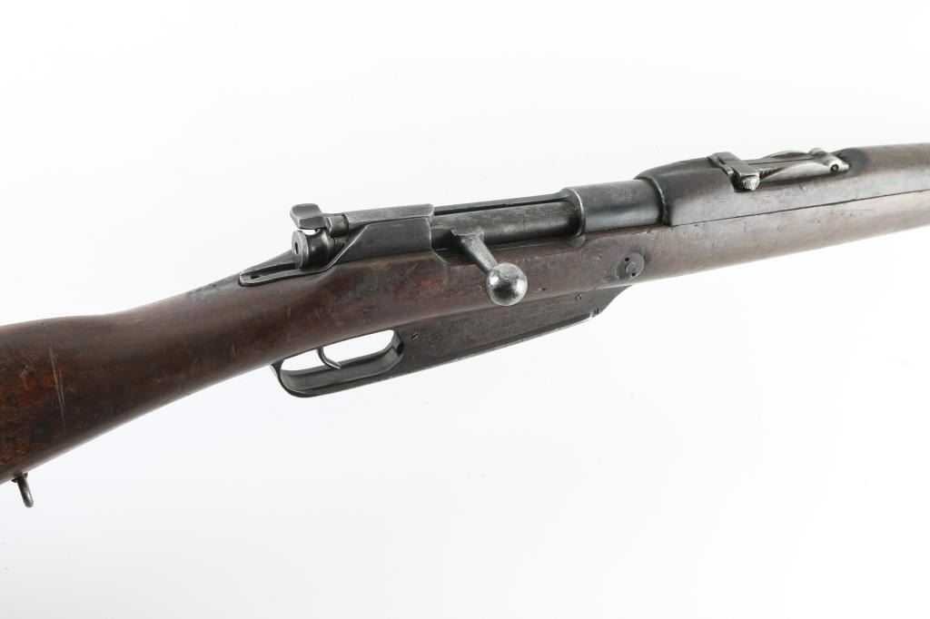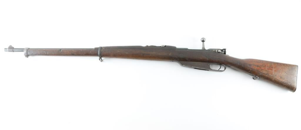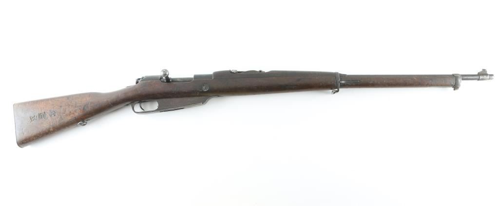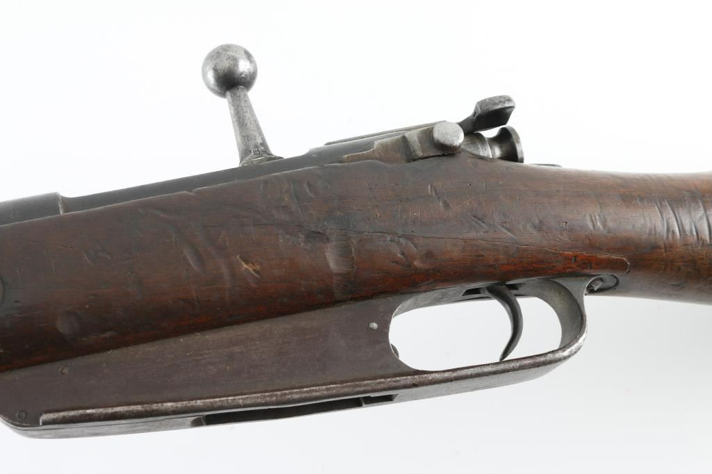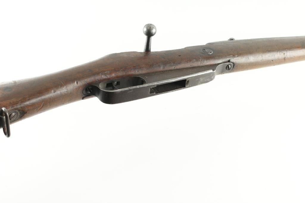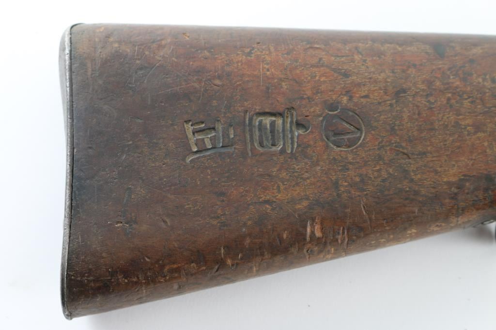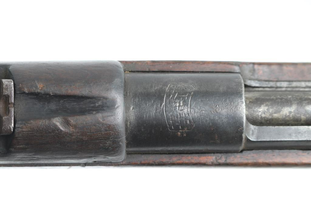 "Hanyang" copy of the German Commission Rifle (Gewehr 1888) with several changes. Features 29" barrel, blade front & tangent rear sights, straight wristed wood stock, wood handguard, Mannlicher type action with straight bolt handle, two position flag safety, uses en-block clips, sling swivels, steel buttplate. Missing screw from rear sight, possibly other small parts. Bore plugged with steel object, not inspected, possibly removable, possibly permanent. Metal mostly an even patina brown with some light rust. Wood is fair to good, cracked handguard, some areas with erosion or chips missing. Chinese characters on receiver ring and butt. Condition is NRA Fair *** PLUUGED BORE - CAN NOT FIRE AS-IS*** *** C&R Firearm ***