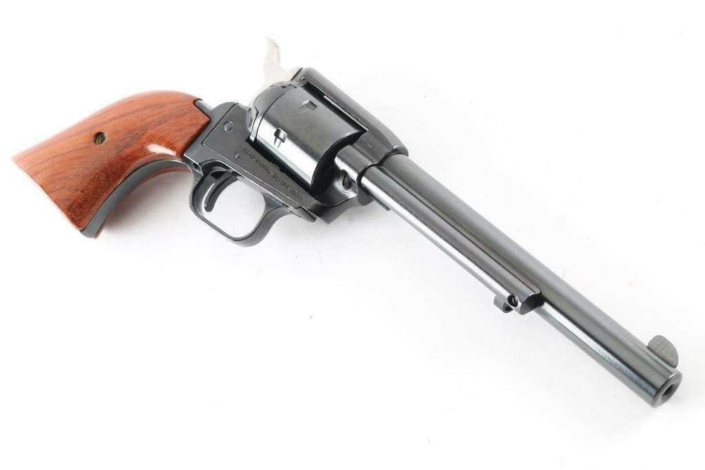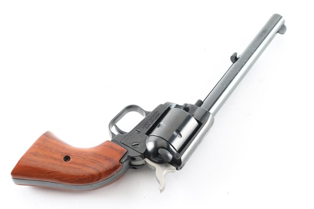 Blued steel single action revolver features a 6.5 inch barrel, fixed sights, manual safety. Bore is very good condition. Wood grips are in excellent condition. Comes with original cardboard box, owners manual and both cylinders (.22 LR & .22 Mag). Condition is NRA Excellent *Modern Firearm*