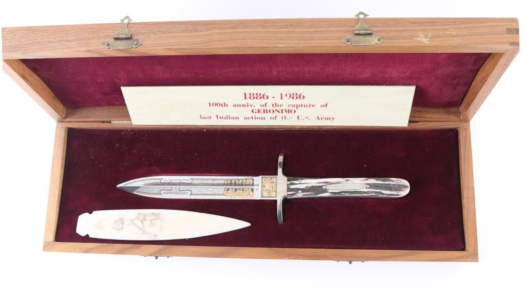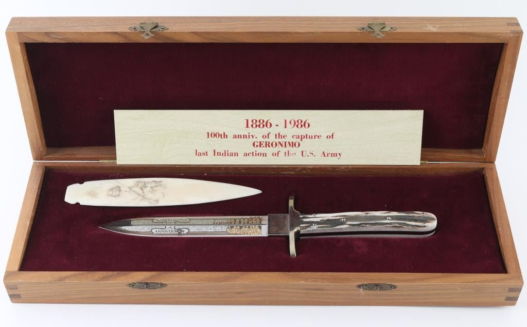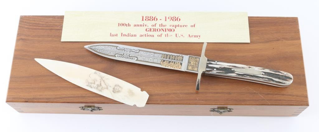 Commemorative of the Hundredth anniversary of the capture of Geronimo, fancy etched blade with antler handle, measuring 11" overall, 6" blade. In beautiful red velvet lined case. Includes a etched bone point with picture of Geronimo.