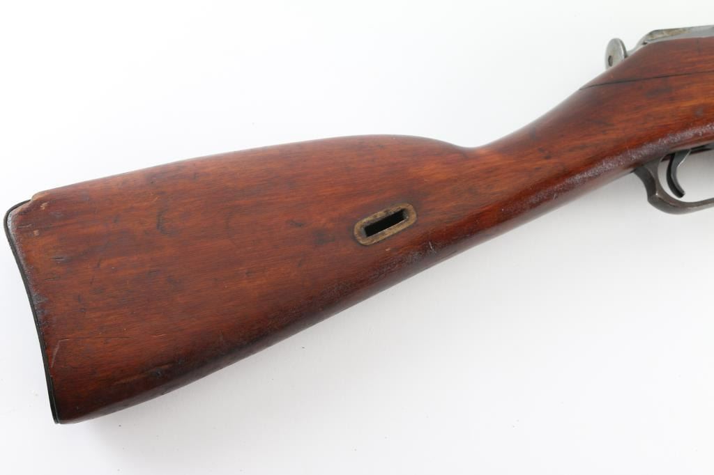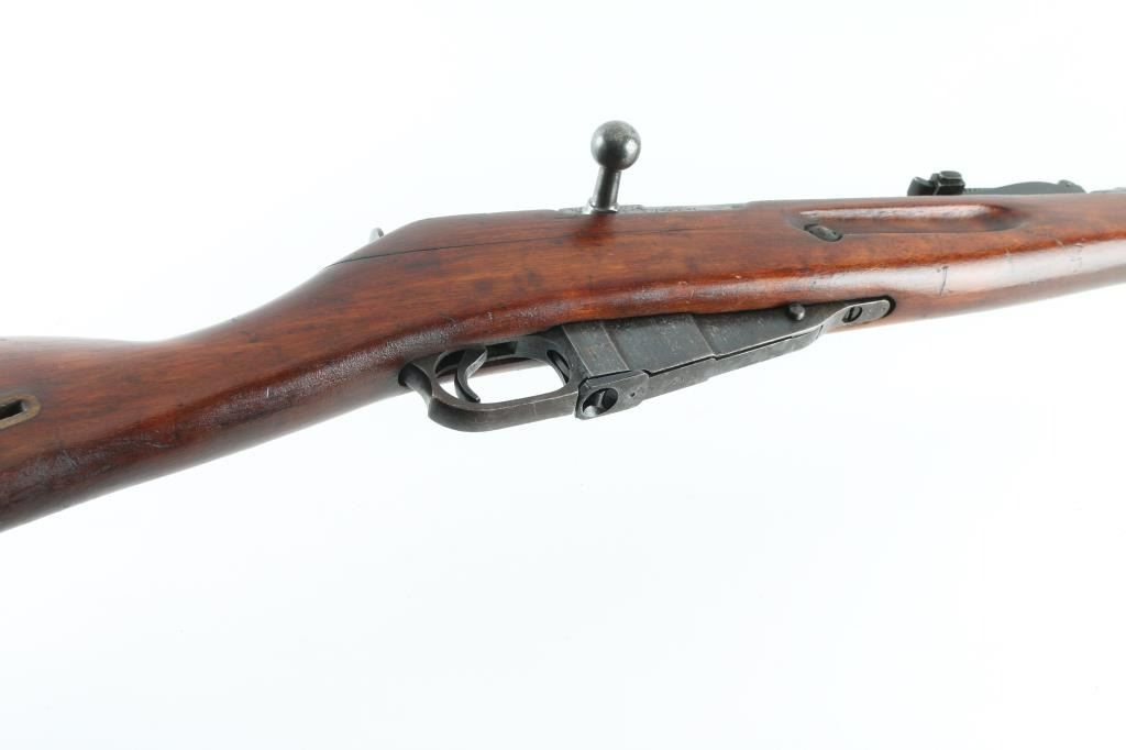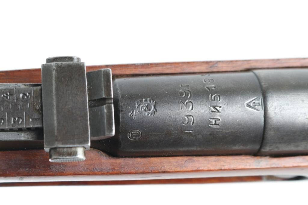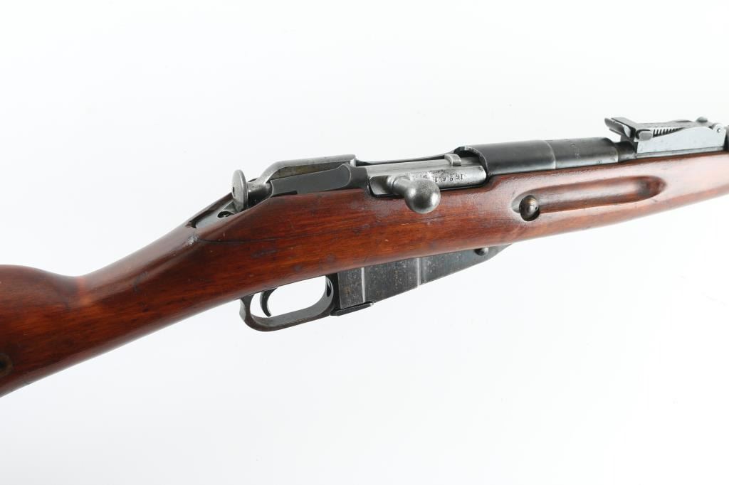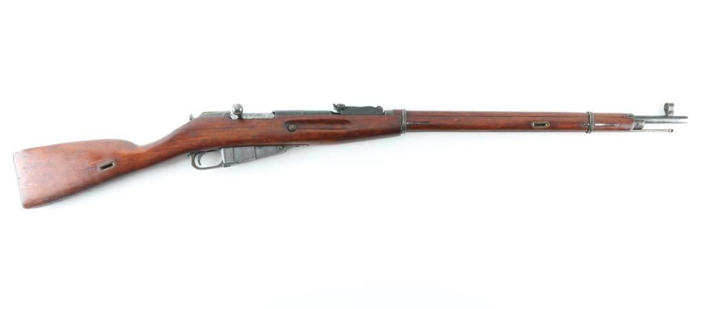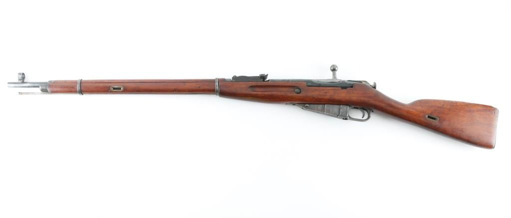 Russian (Soviet Union) military bolt action rifle dated 1939. No importer marks observed. Features 29" barrel, post-in-ring front sight, tangent style rear sight, manual safety, straight bolt handle, round receiver, sling slots, cleaning rod under barrel. Bore is good condition, some darkness in grooves, with strong rifling. Metal parts retain 60% finish, thinning and turning gray throughout, several areas appear cleaned of patina (especially sides of magazine), bare metal on bands, pitting below stock line. Bolt is fair to good condition bare metal with some patina and little pitting. Some rust on cleaning rod. Stock is very good condition, has large section cut out on left of receiver to accommodate a PU scope mount. No holes drilled in receiver. Numbers on other parts do not match receiver. Condition is NRA Good+ *** C&R Firearm ***
