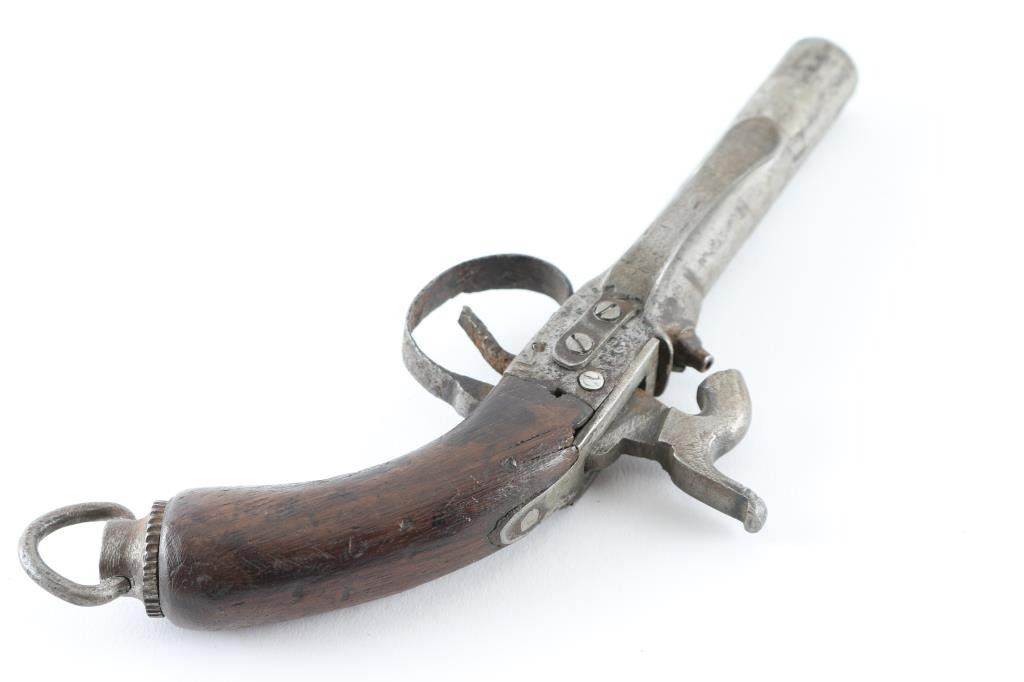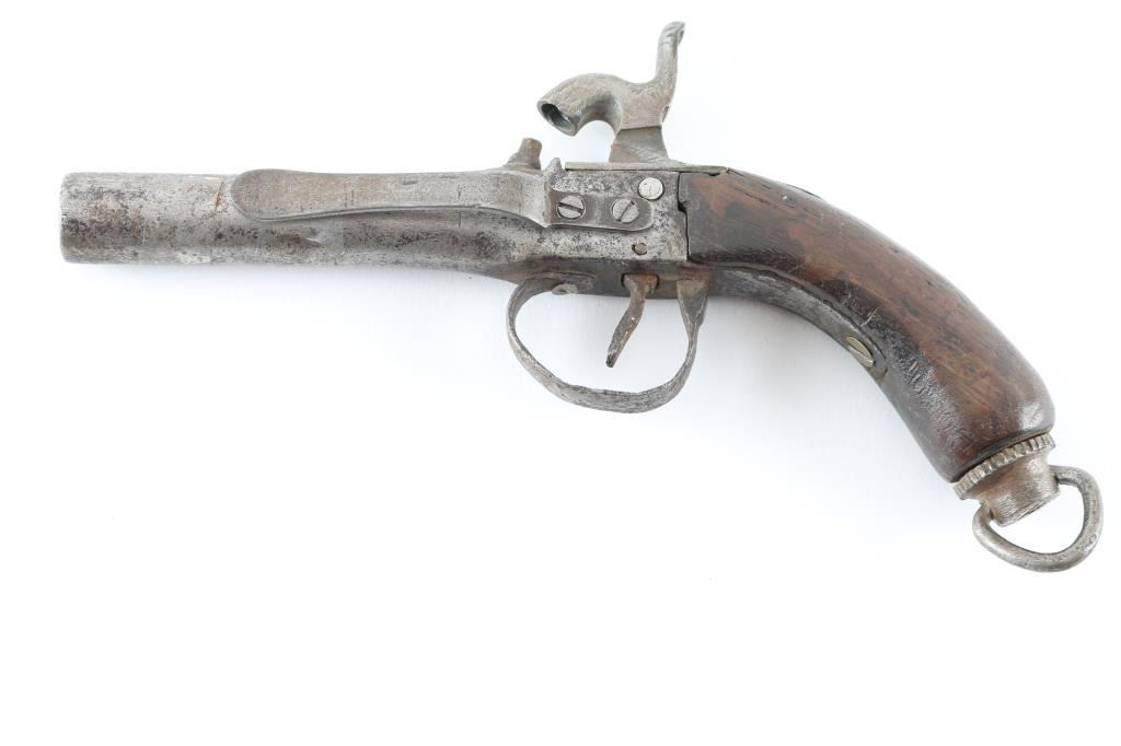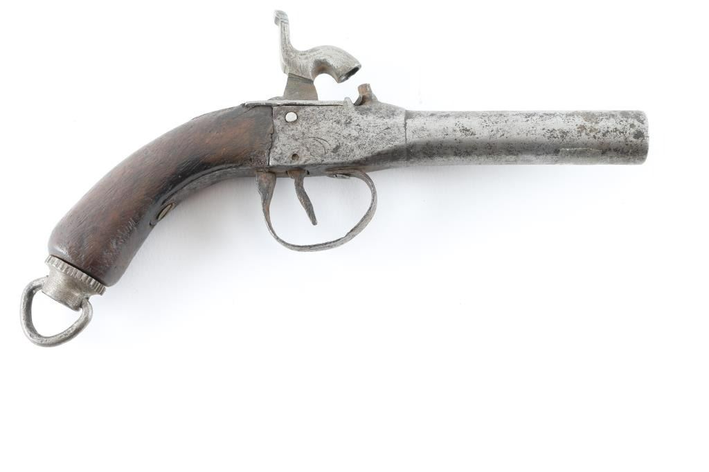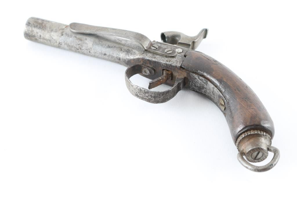 unmarked, features 3.5" round barrel, no sights, one piece wood grip, lanyard ring, belt clip on left side, centerline hammer. Bore shows thin rust, external surfaces are mottled dull gray with patina brown. Hammer does not have a full cock notch. Grip is fair to good condition. Condition is NRA Fair *** Antique Firearm ***