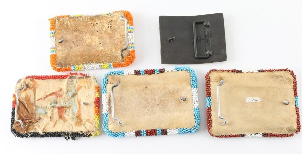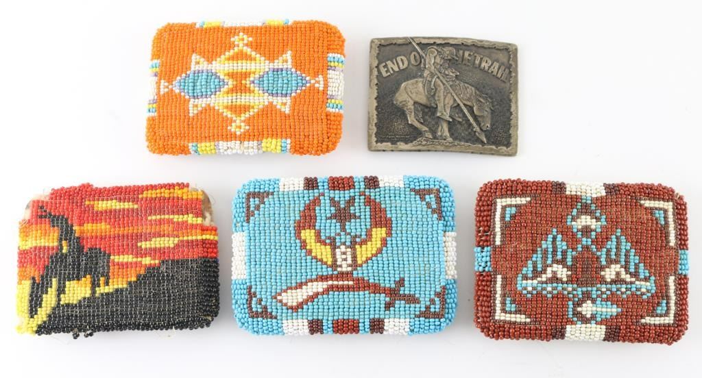 4 Fully beaded belt buckles and one metal "End of the Trail" Buckle.