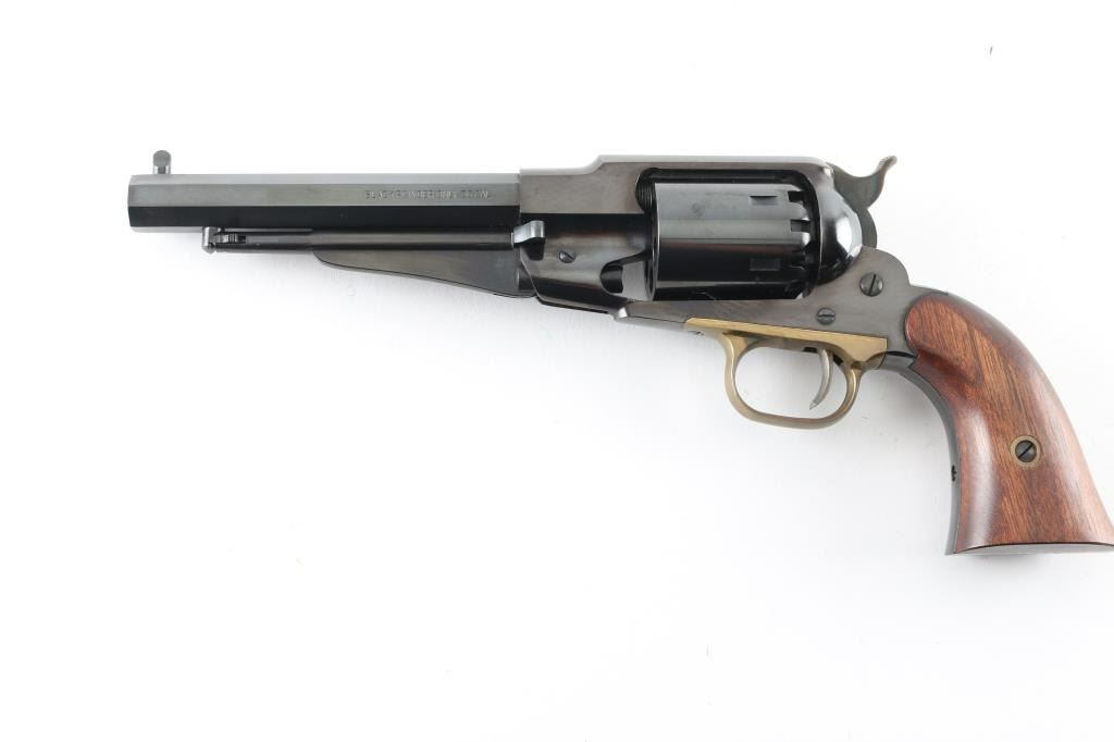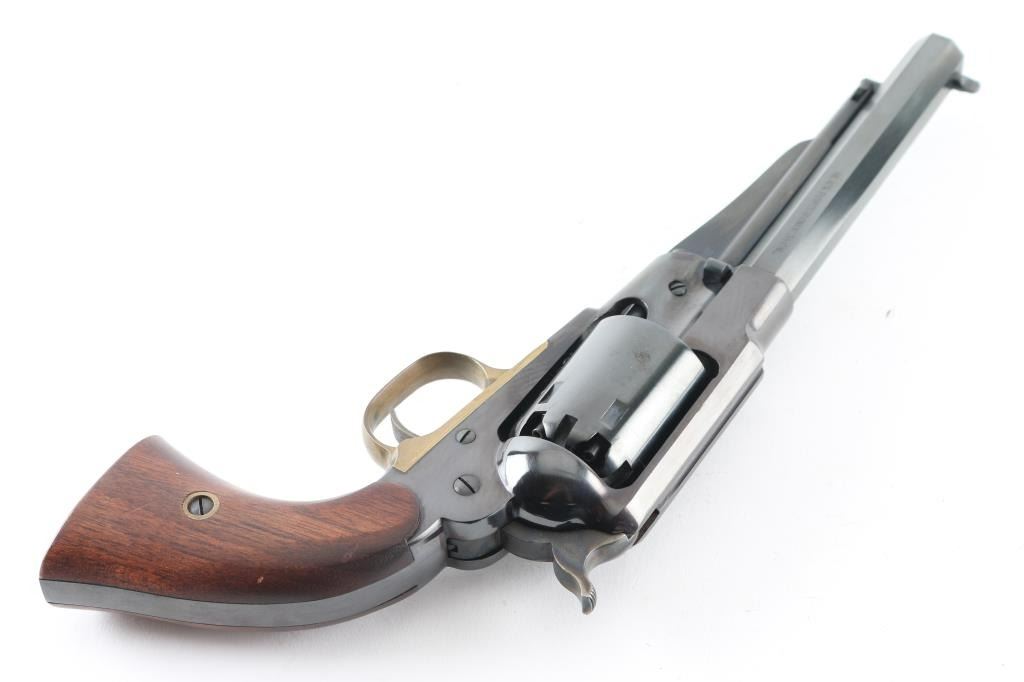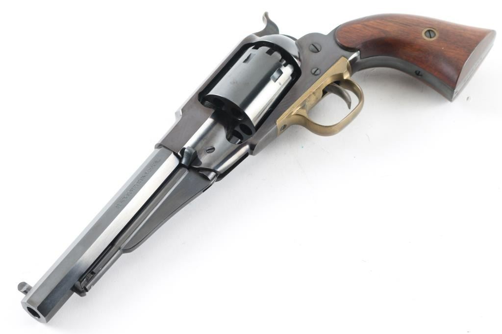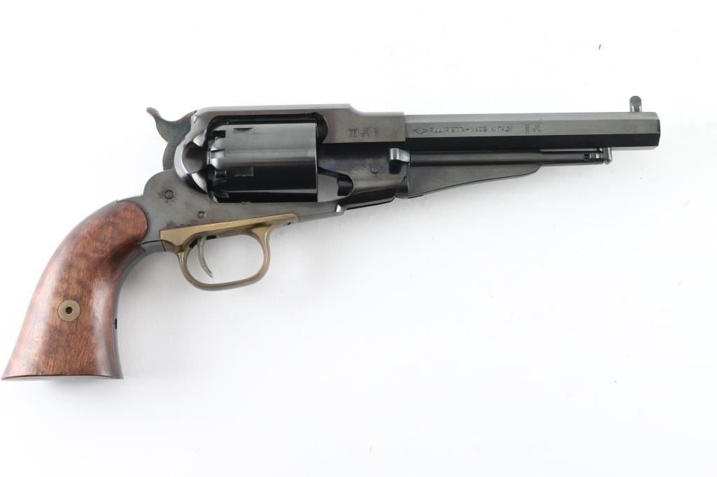 Italian replica of the Remington design black powder "Cap 'n' Ball" single action revolver. Features blued finish, brass trigger guard, two piece smooth walnut grips, 6.5" octagon barrel, loading lever, blade front & fixed notch rear sights. Appears unfired, with very good condition bore & charge holes. Finish is excellent with minor handling marks, some mellow color and a few small spots of patina on brass, excellent grips. Condition is near NRA Excellent *** Antique Firearm ***
