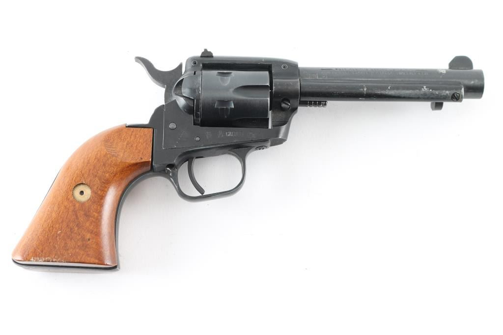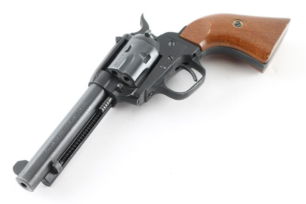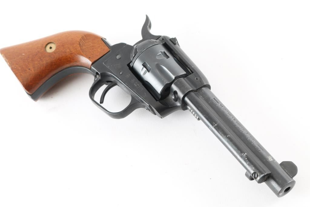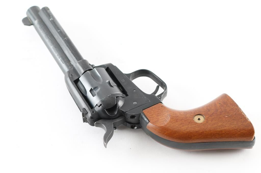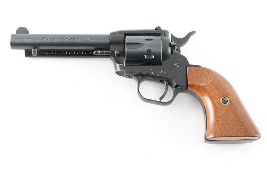 Made in Italy this is a 6 shot single action only revolver. It has a 4.75" blued barrel, frame and receiver. It has a fixed blade front sight and a dovetailed rear sight and two piece smooth wood grips. It also includes a manual hammer block safety. There is a loss of metal finish in and around the trigger guard, a couple of dings on the left side and a few on the right and a loss of finish on the ejector rod housing. Wood grips are fine with minor scuffing at base on right side. Bore and cylinder needs cleaned. Condition is NRA Good *Modern Firearm*