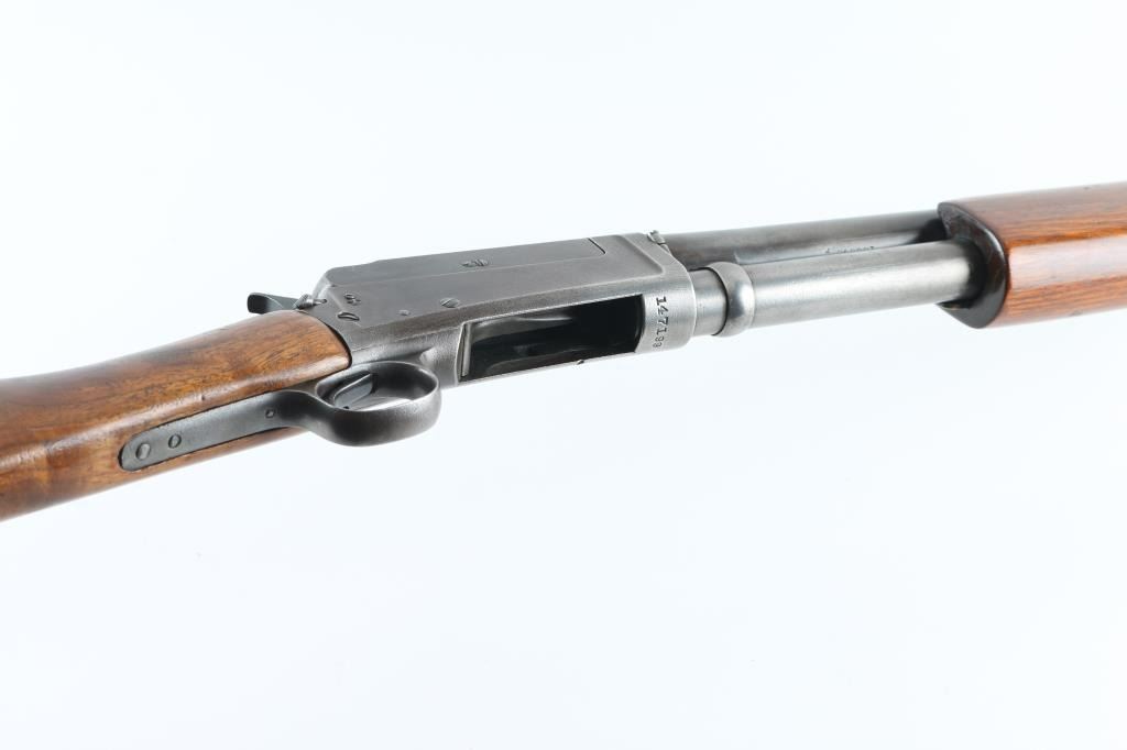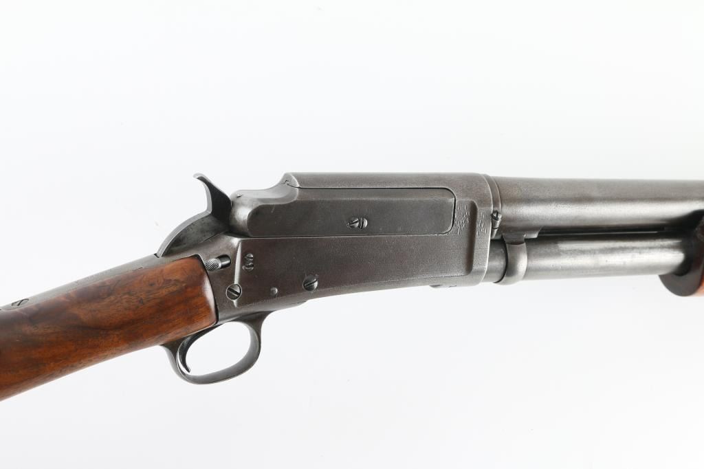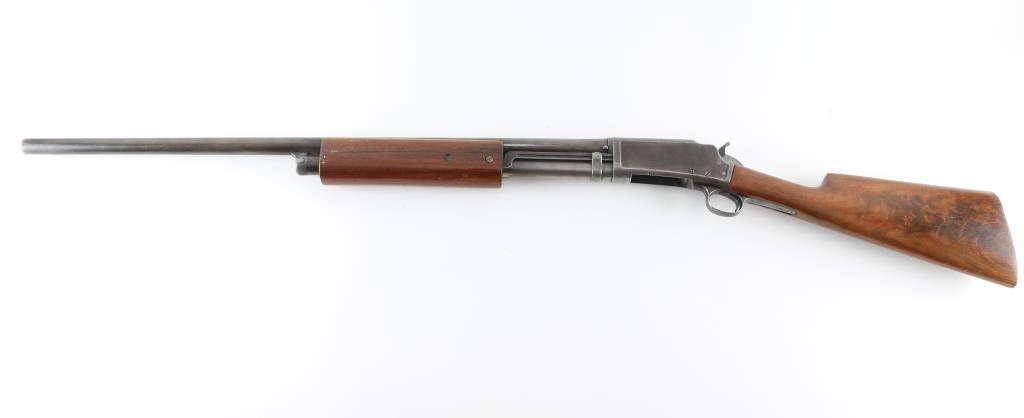 Trade-name Marlin (Model 21 or 24?) shotgun made for Sears and others in the early 1900's. It sports a 30" blued barrel and receiver with a metal bead front sight which looks to have been peened down almost flat. It has a half length magazine tube and knurled hammer spur with two piece smooth wood stocks. Bore looks good, needs cleaned. Metal finish is either gone or in patina. Machining marks and pitting are very visible on the receiver. What appears to be the safety does not work. Wood forearm looks ok but plain. The shoulder stock has nice grain but has a 2" crack in the middle of the right side and no butt plate or pad. Condition is NRA Fair **C&R Firearm**