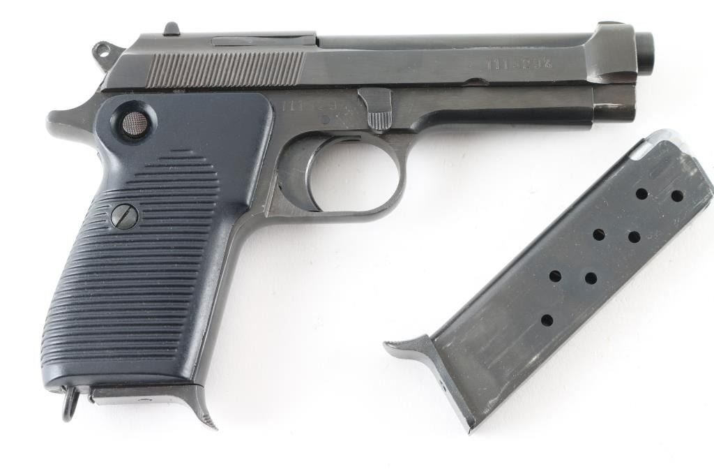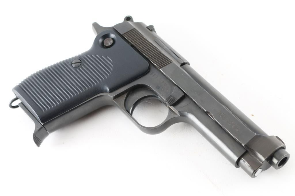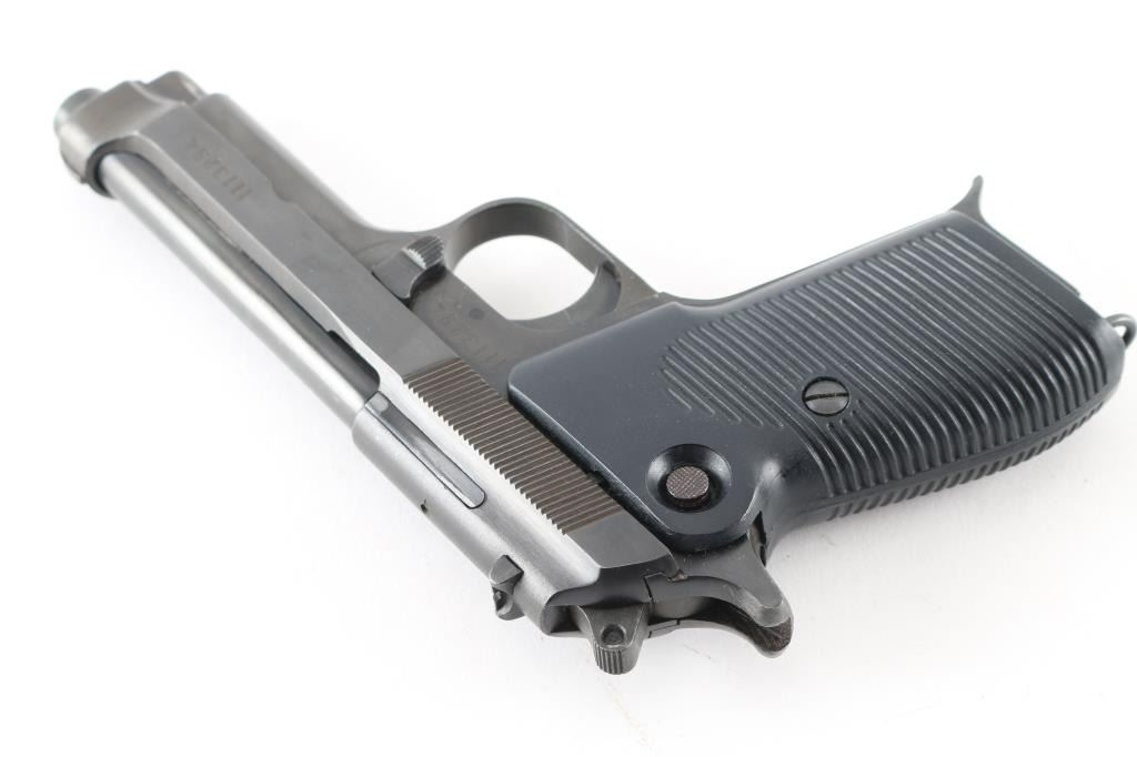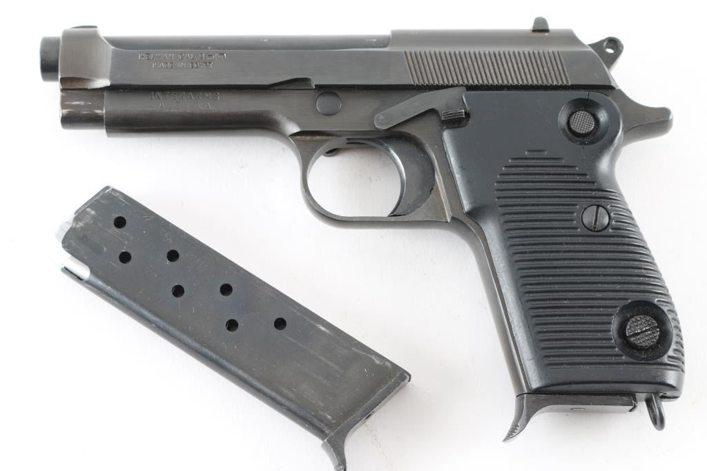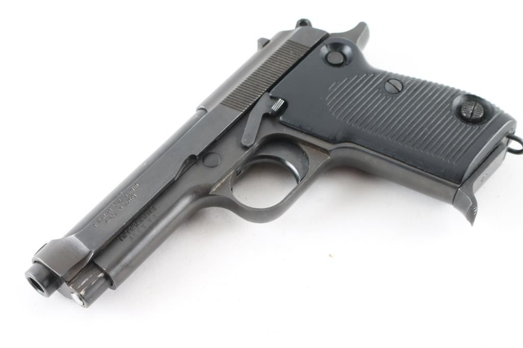 Egyptian made copy of the Beretta 1951 'Brigadier' single action semi-automatic pistol. Imported by Interarms of Alexandria, VA with import marks on the frame. Features a blued finish, 4.6" barrel, fixed front sight, dovetailed rear sight, smooth trigger, push button safety, serrated round hammer spur, push button magazine release low on grip, 8 round magazine, lanyard loop and two-piece grooved black plastic wrap-around grips. Bore is very good condition. Retains 95% finish with minor handling marks, rubbing on slide. Grips are good condition, crack in left panel by the safety. Slide numbered to frame. Includes a spare magazine & cleaning rod & brush in factory styrofoam box, with fair condition cardboard outer sleeve. Condition is NRA Excellent *** Modern Firearm ***