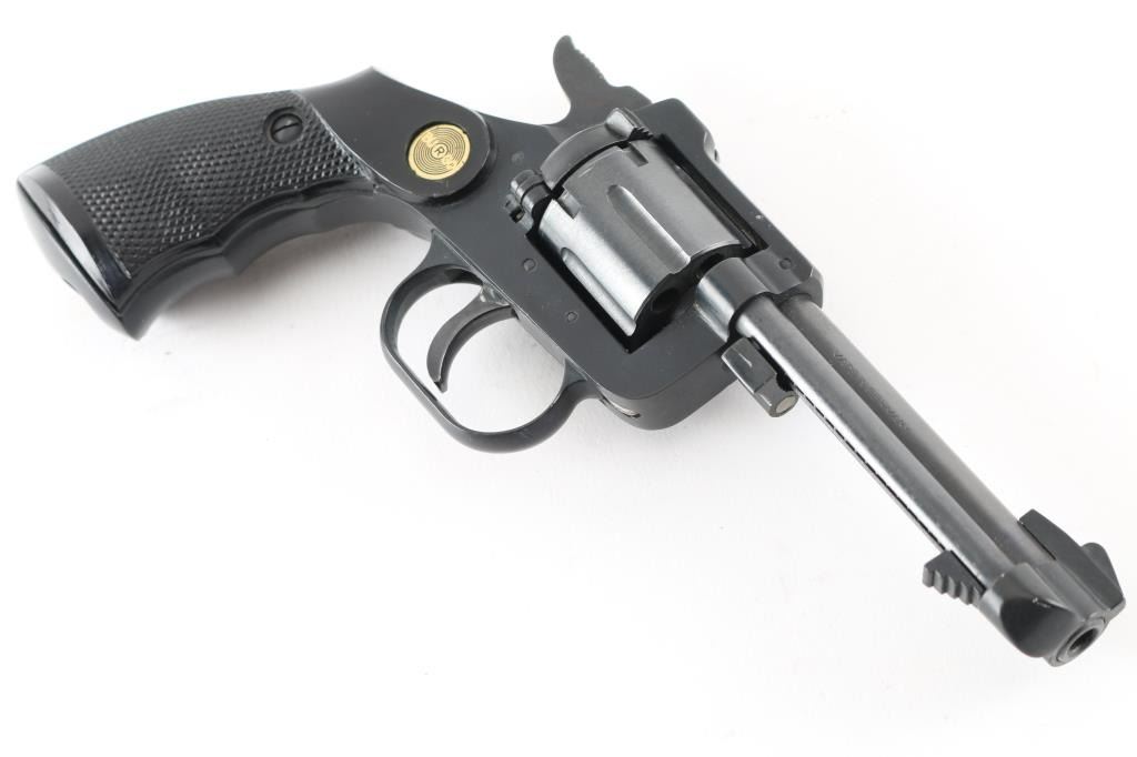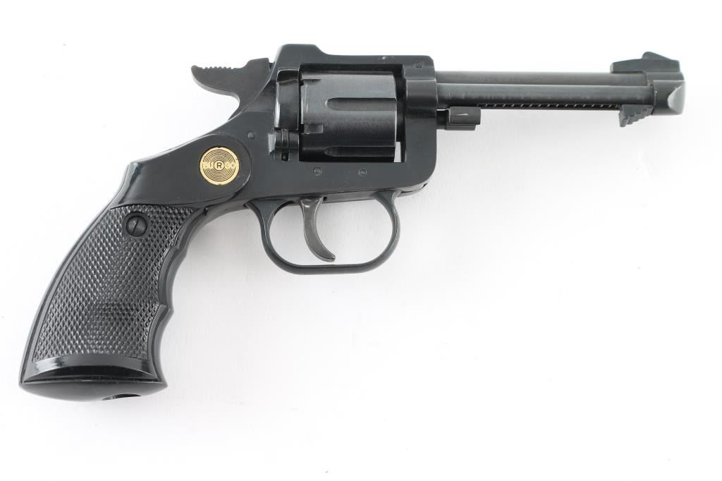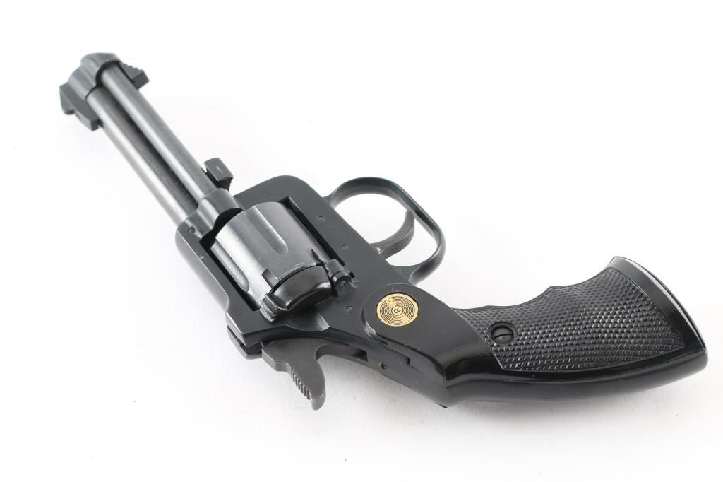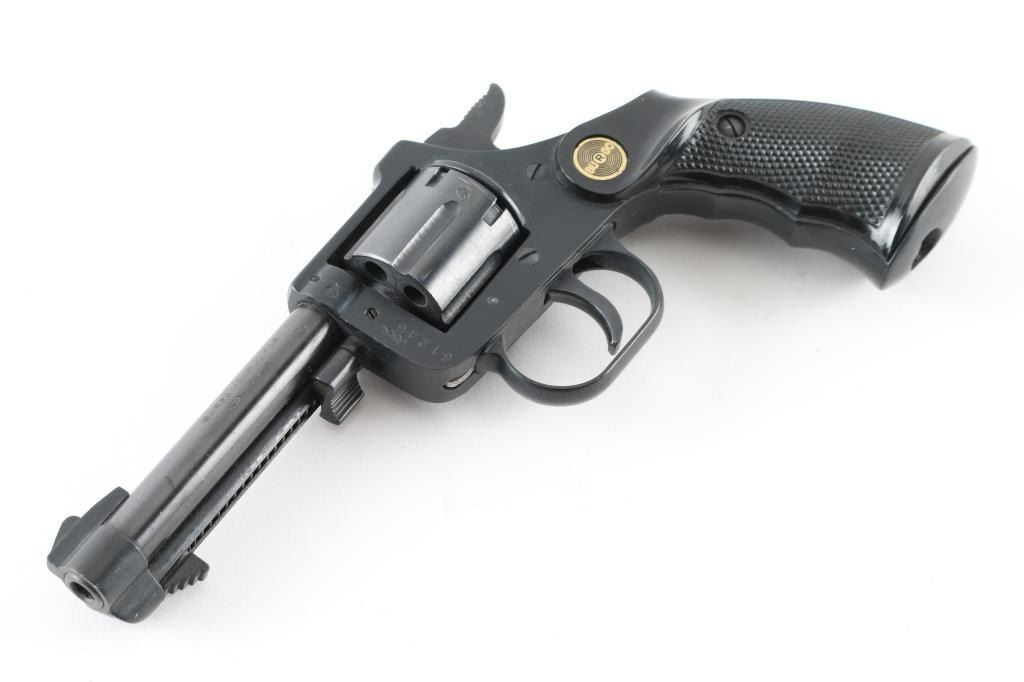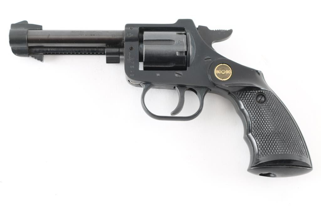 Made in Germany this is a 6 shot DA/SA revolver chambered for .22 LR ammunition only. It has a 3.5" blued barrel and frame with two piece textured finger groove grips with Burgo medallions. It has a fixed ramp front sight and a notch cut rear sight. The metal finish looks good and the rips are near perfect. The bore looks good but dirty. Condition is NRA Very Good *Modern Firearm*