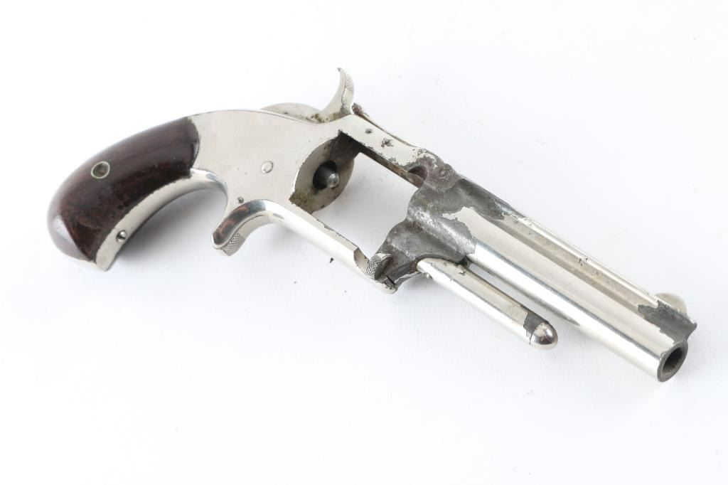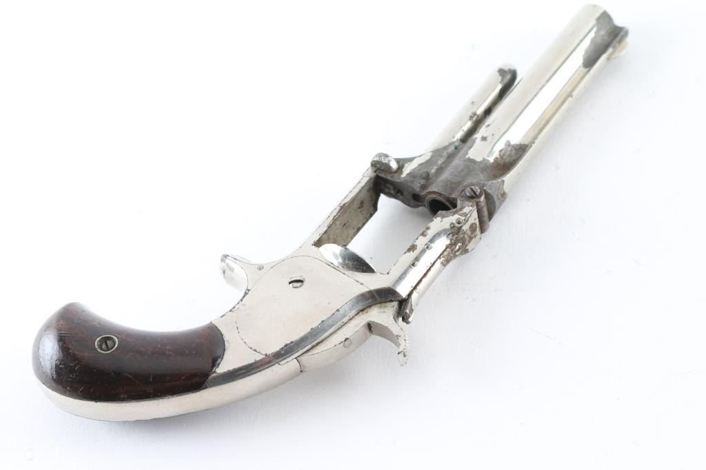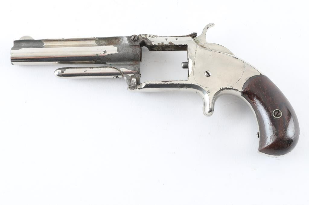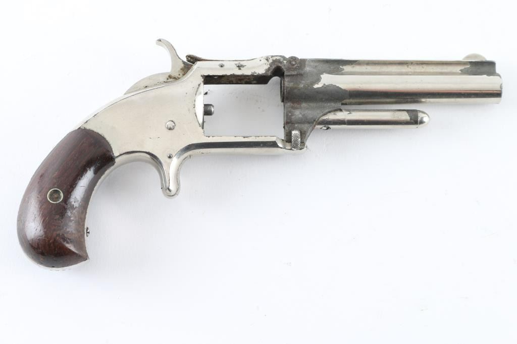 SN: 105693 **For Parts Only** Antique single action revolver circa 1868-1875. Features hinged frame with tip-up opening, 3.5" barrel, fixed sights, spur trigger, bird's head grip frame, smooth walnut grips, nickel finish. Missing Cylinder. Bore is poor, dark with little rifling remaining. Retains 50% finish with large areas of losses, showing patina or bare metal. Grips are very good. Action is stiff, internals show rust inside. Condition is NRA Poor (Missing Cylinder) *** Antique Firearm ***