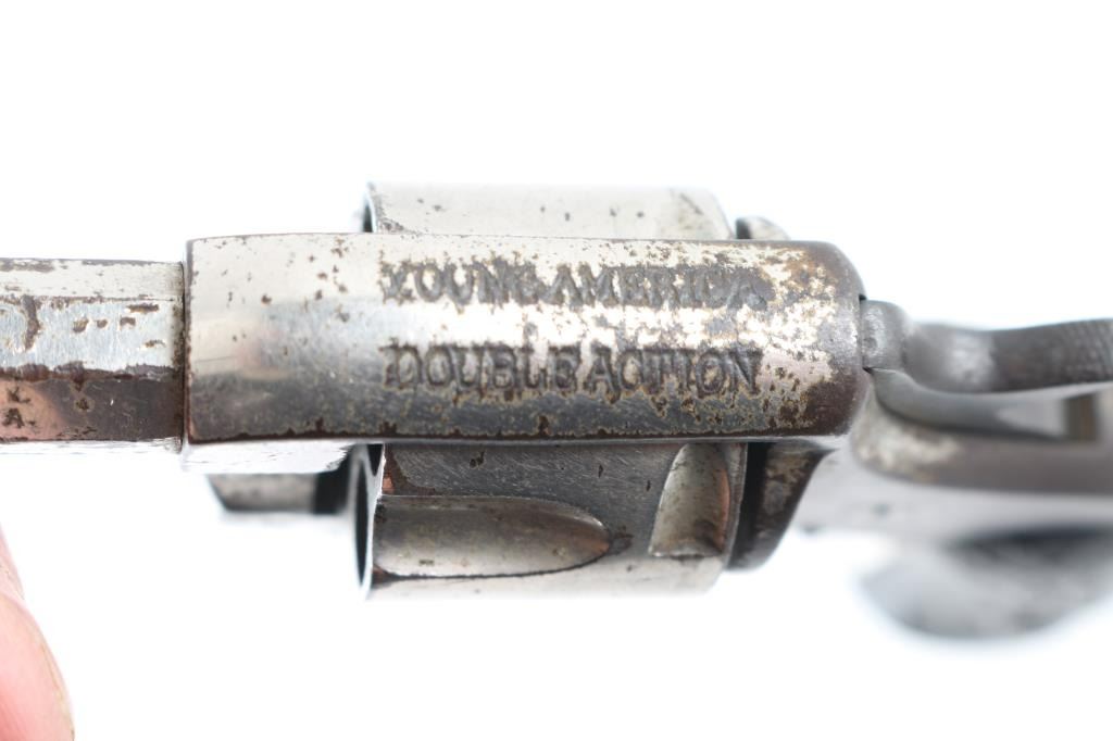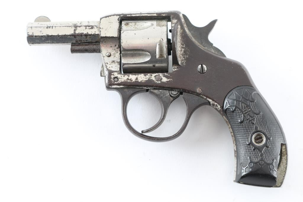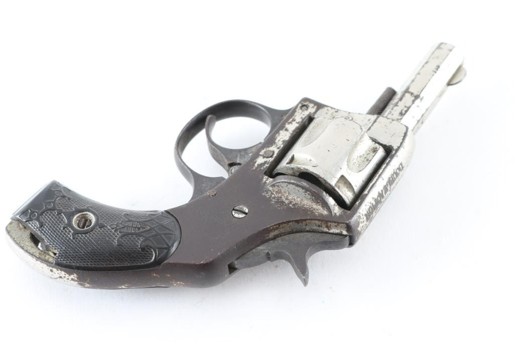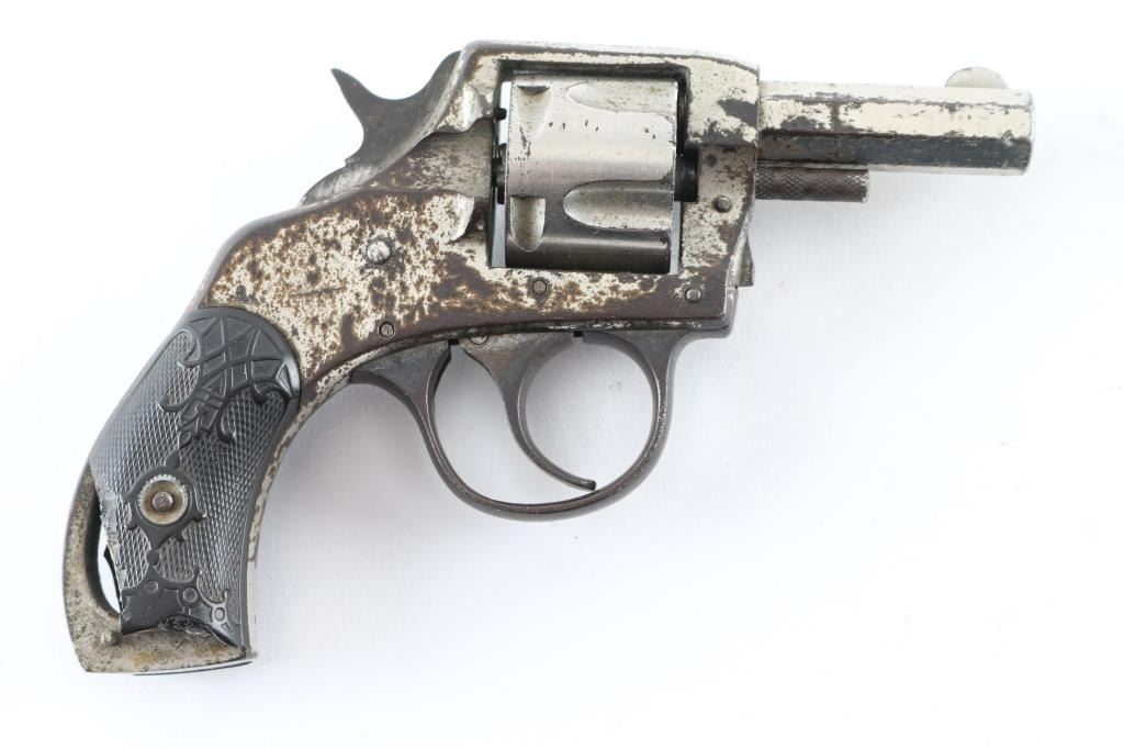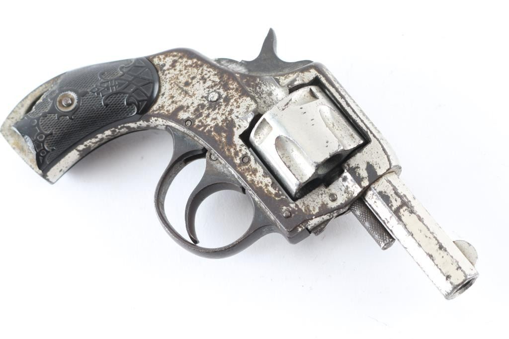 SN: 4602 Vintage double action revolver features nickel finish, checkered black hard rubber grips, 2" octagon barrel, fixed sights, 5 shot fluted cylinder. Poor condition bore shows rust & traces of rifling. Retains 20% nickel with large areas of brown patina. Grips are chipped, missing small pieces. Action is non functional. Condition is NRA Poor *** C&R Firearm ***