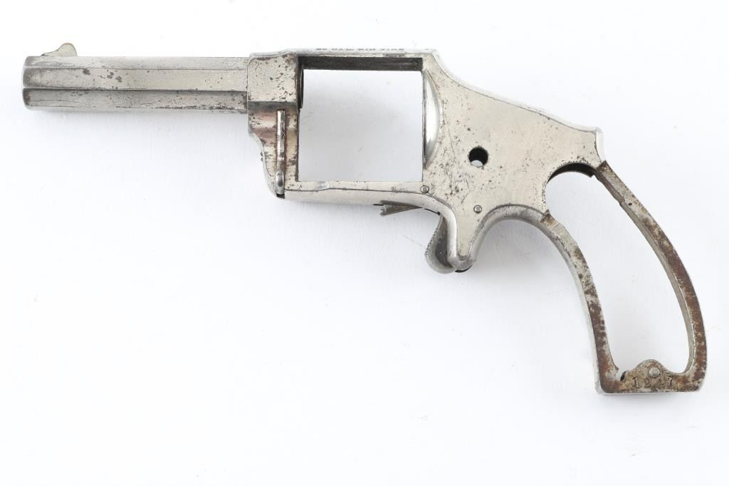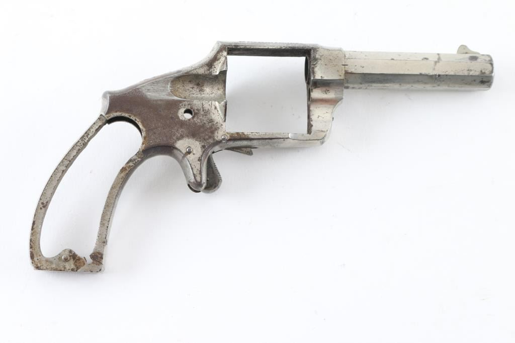 *** FRAME & BARREL ONLY *** with a few other small parts. Features 3" octagon barrel, spur trigger, round butt, nickel finish. Bore is poor, rust brown with little visible rifling. Retains about 40% finish, many areas showing brown patina, some peeling or flaking at edges. Condition is NRA Poor (Barreled Frame Only) *** Antique Firearm ***
