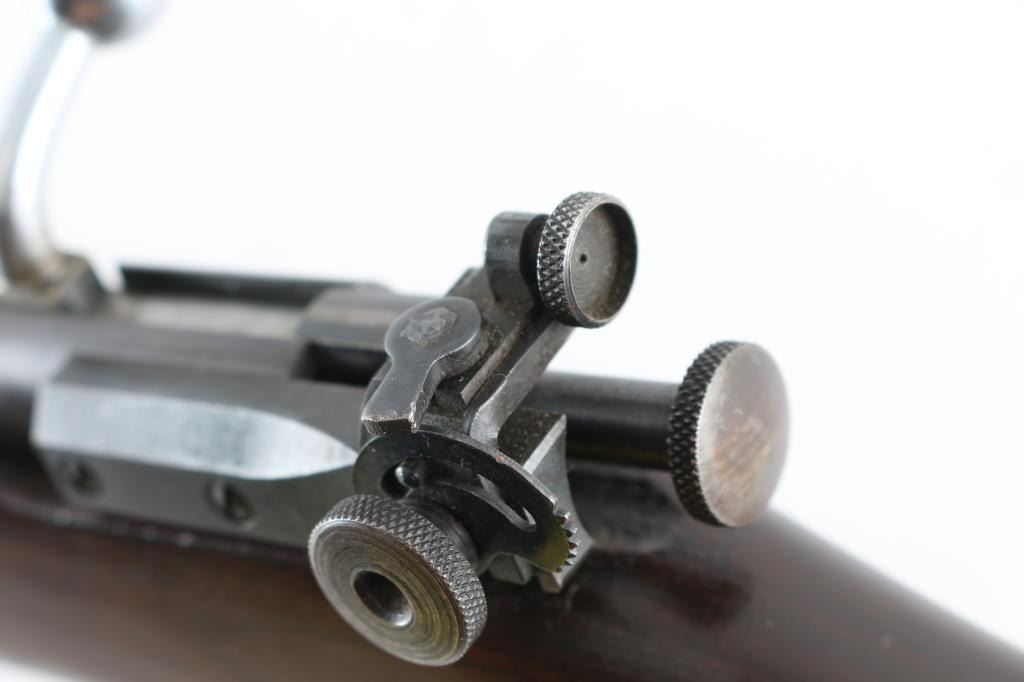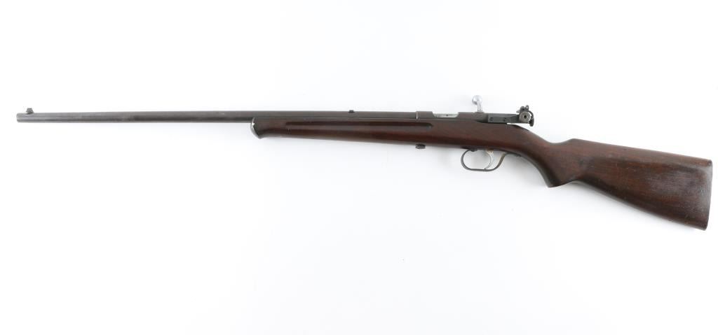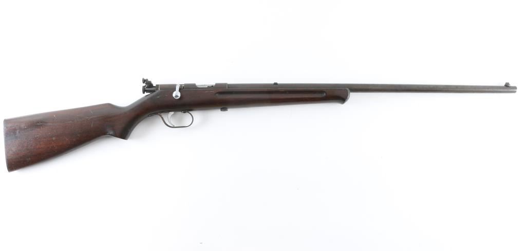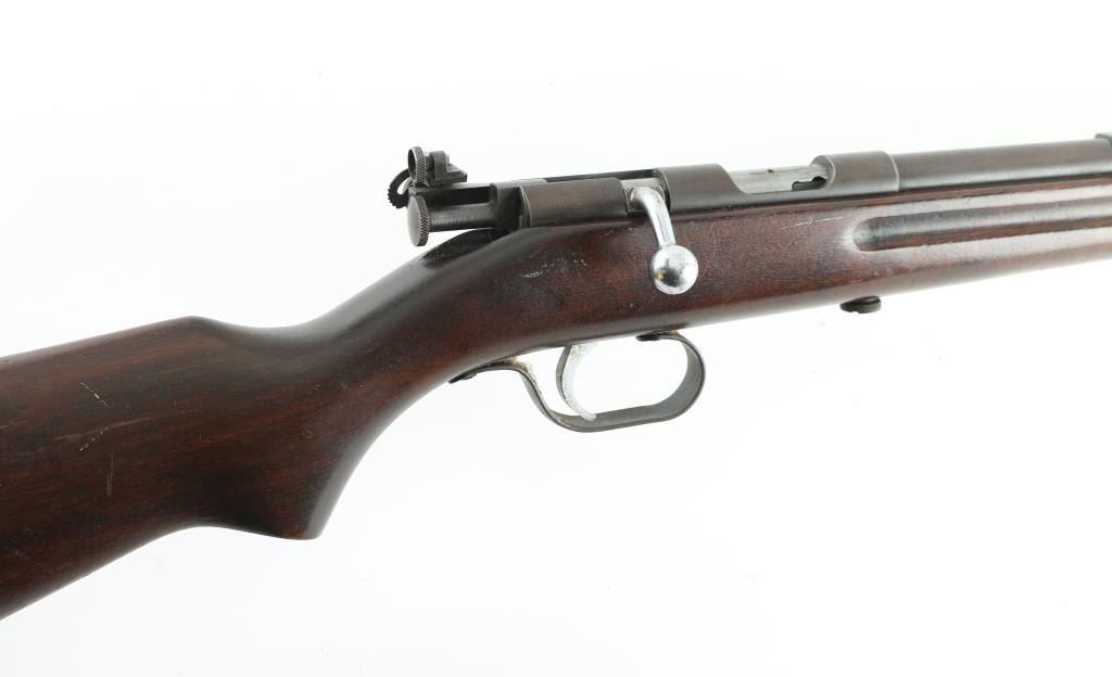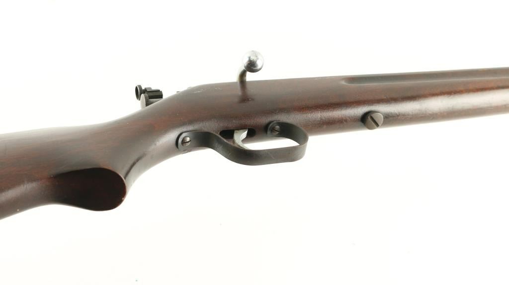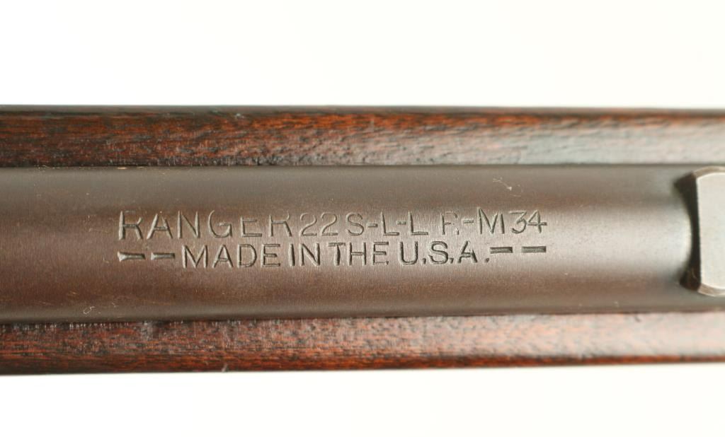 Rifle. Single-Shot, bolt-action.The ranger model 34 (Marlin model 65E) is somewhat rare, being made from 1935 to 1937. Sold by Sears. 24" barrel with front post/bead sight, and unmarked adjustable rear peep sight. barrel marked " Ranger .22 S, L. LR M34 Made in the U.S.A," Walnut stock was finger-grooved , schnabel forend, Steel buttplate. Polished bolt. Bore appears very good, needs cleaning, most of the blued finish has turned a brown/plum patina, with some scattered spots of rust. Nothing serious. Action works well. Wood is very good. NRA condition-Near very good. C&R firearm.