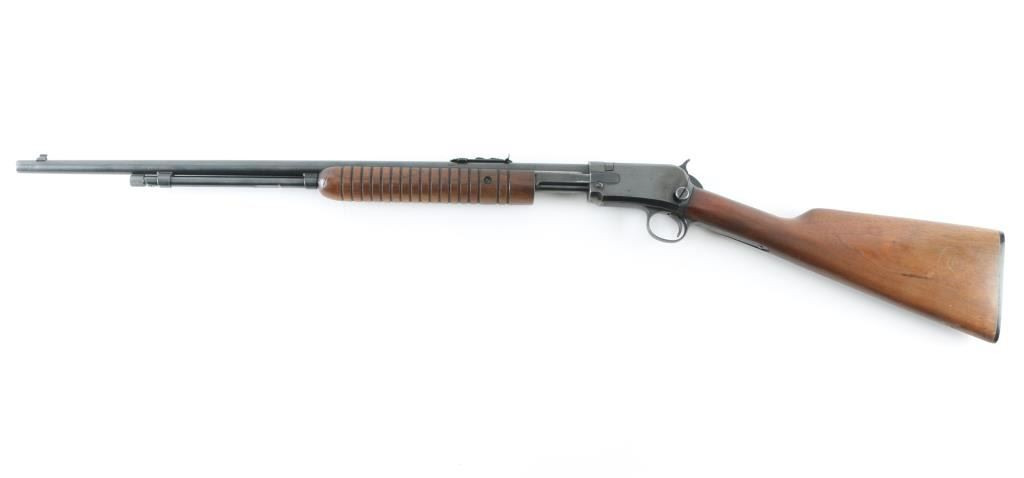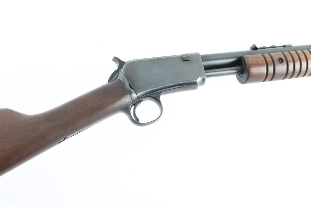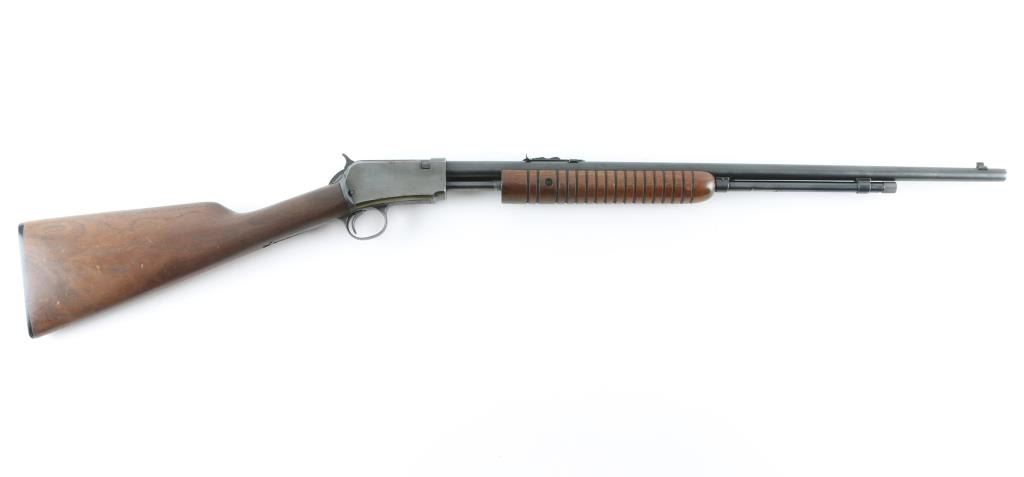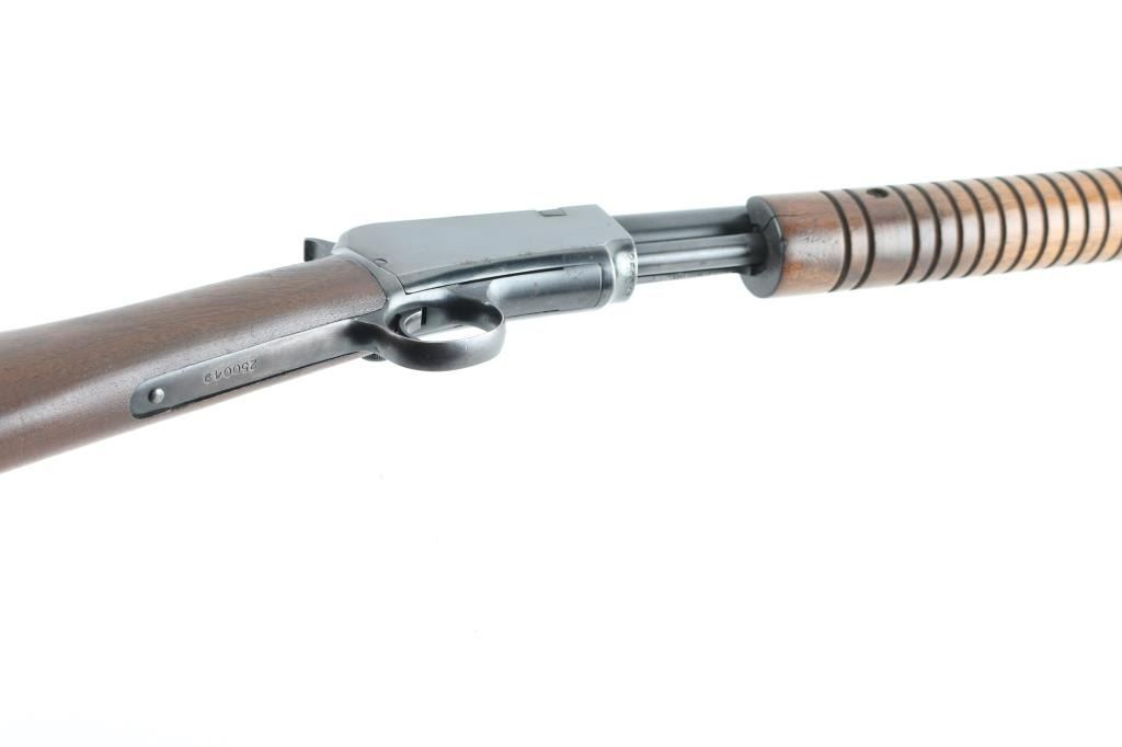 Pump action rimfire rifle manufactured circa 1948. Chambered for .22 S, L. LR. Features blued finish, grooved wood pump handle, wood butt with straight grip area, checkered plastic factory buttplate, 23" barrel, blade front & sporting rear sights, magazine tube under barrel, external hammer, take down screw in receiver. Bore is very good condition. Retains 85% blue with bare metal on edges & corners and where pump handle rubs on mag tube, handling loss on the tangs. Letters on barrel retain sharp edges. Wood is very good+ with some minor scratches. Numbers match on receiver cover & lower tang. A fine example for its age. NRA Condition-Near excellent. C&R Firearm.