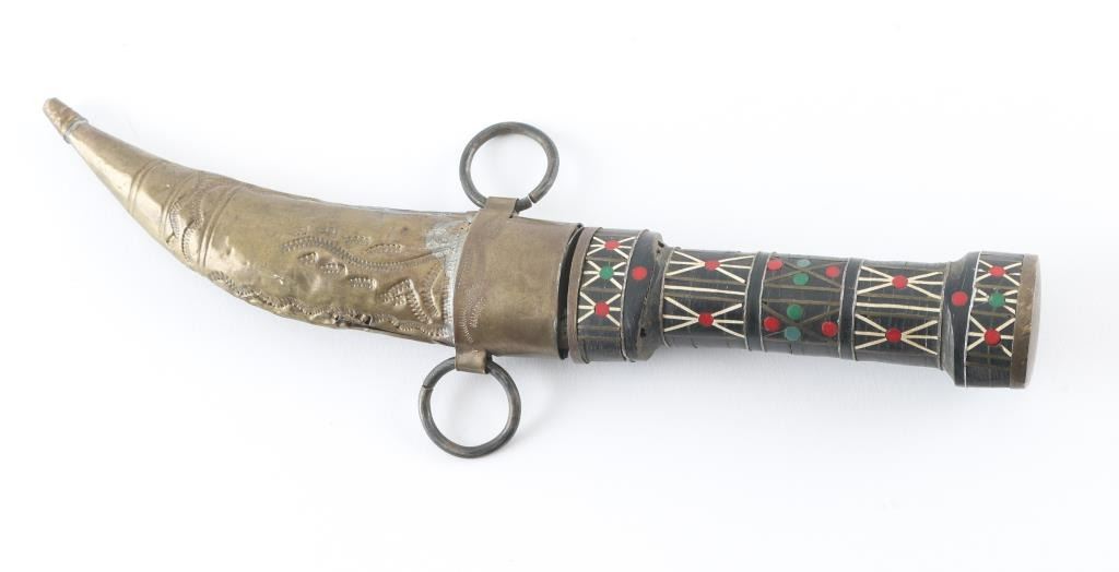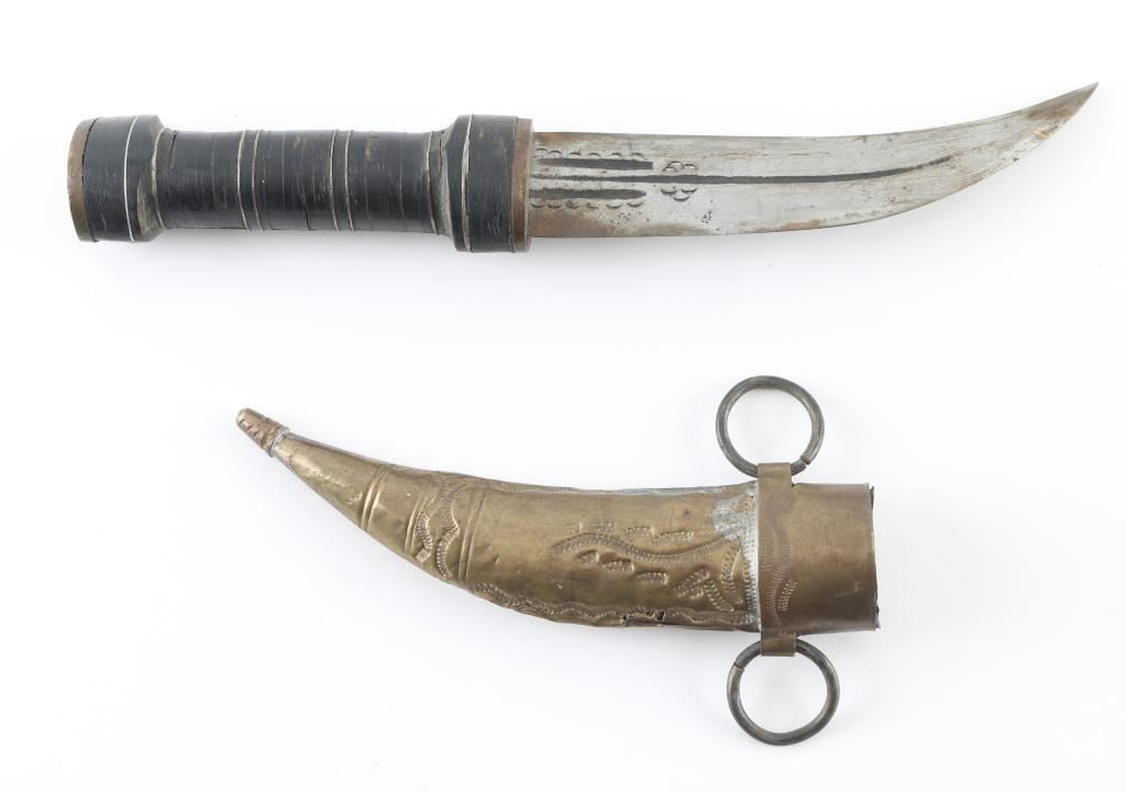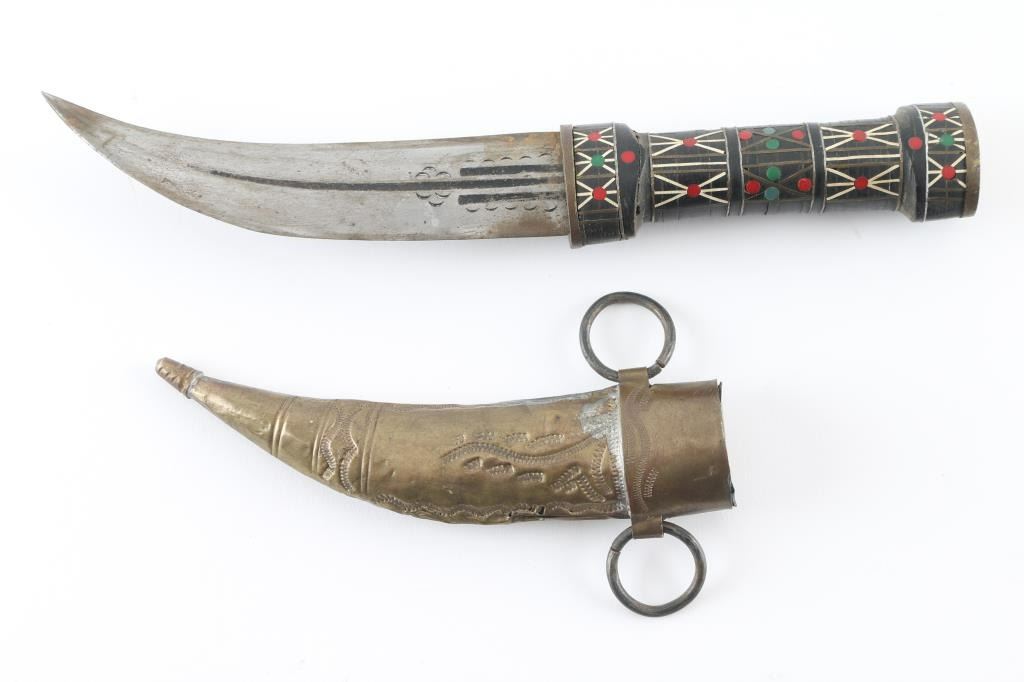 in good condition, circa 19th-20th Century, with brass scabbard. Approx 4.5" blade, 8.5" overall. Decorative designs on one side of handle.