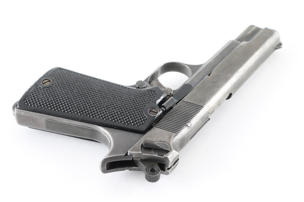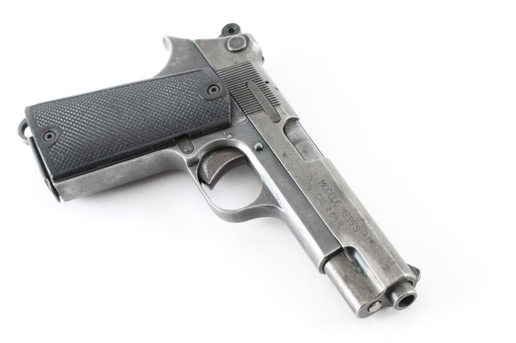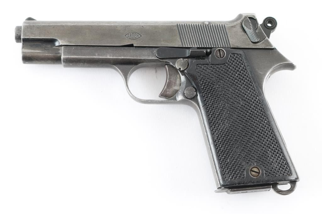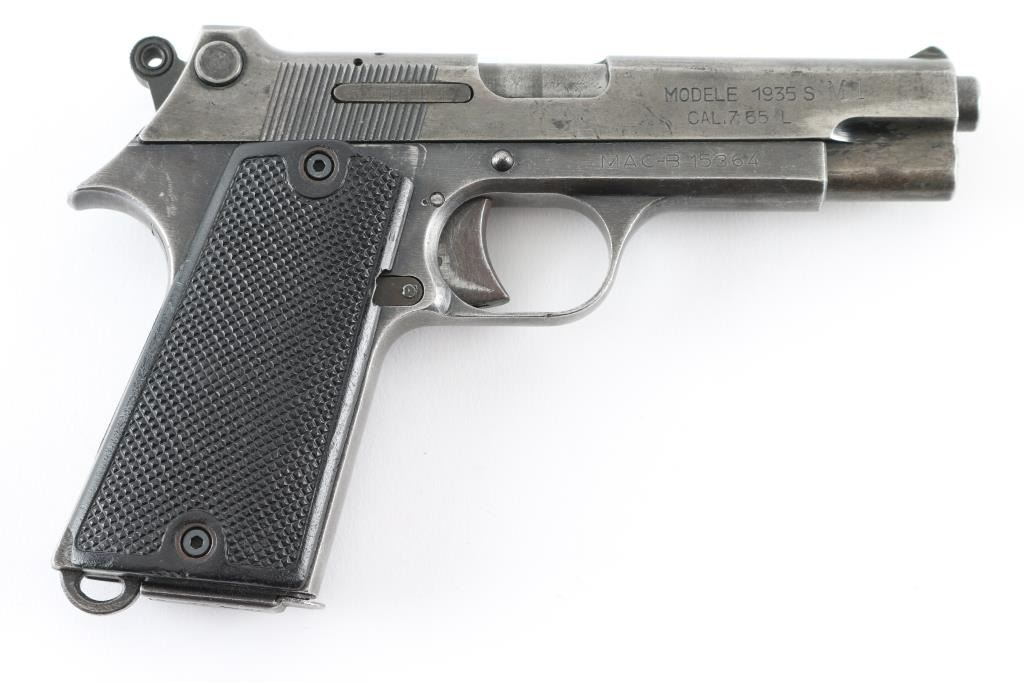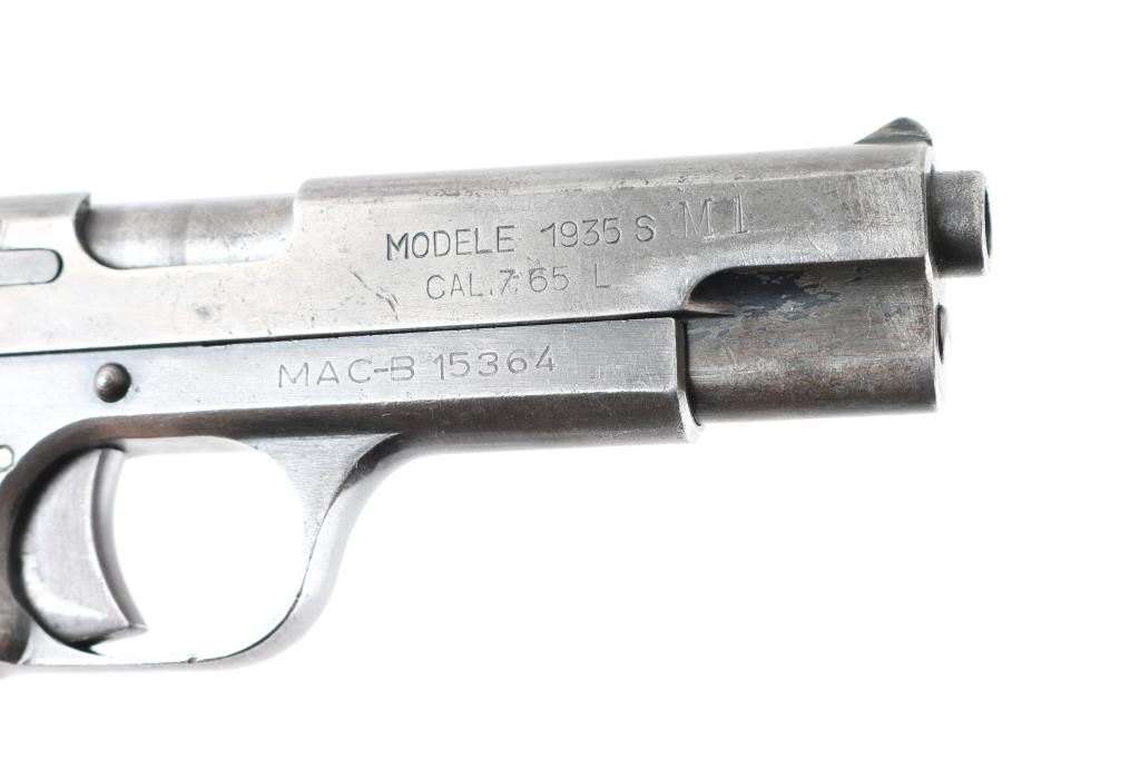 French military single-action semi automatic service pistol chambered in 7.65mm French Long, Features a blued finish, 4.3" barrel, blade front sight, notched rear window sight, smooth trigger, serrated round hammer spur, thumb safety, magazine safety, steel frame, push button magazine release, 8 round magazine, lanyard loop and two-piece checkered black hard rubber grips. No import marks. Markings: Slide - "SAGEM.", "MODELE 1935 S M1/ CAL.7,65 L". Frame - "MAC-B 15364". Magazine - "1935-S". Pistol exhibits approximately 30% of it's blued finish, with handling loss. Action is a little stiff, needs oil, bore is fair with light areas of pitting. Grips are very good. NRA Condition-Fair to Good as C&R firearm.