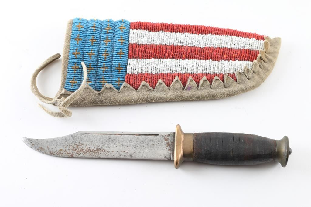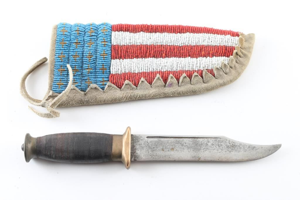 Ka-Bar style knife with stacked leather handle, 10 inches overall with 6inch blade. Includes beautiful leather sheath with fully beaded motif.