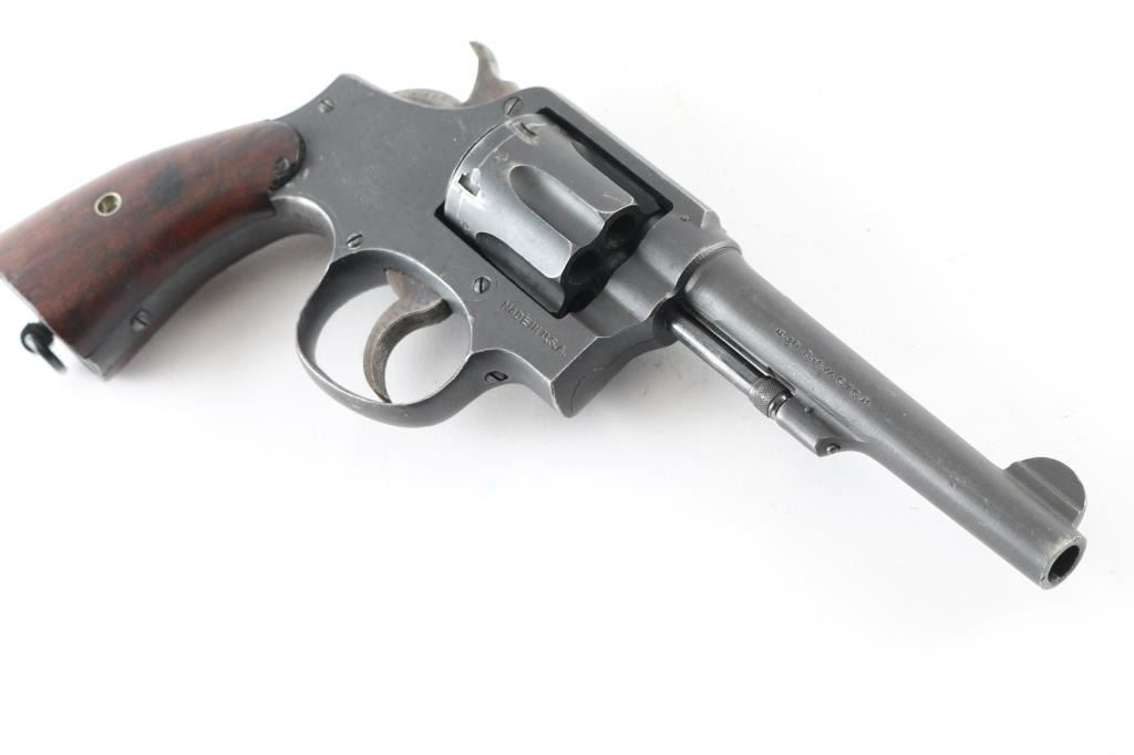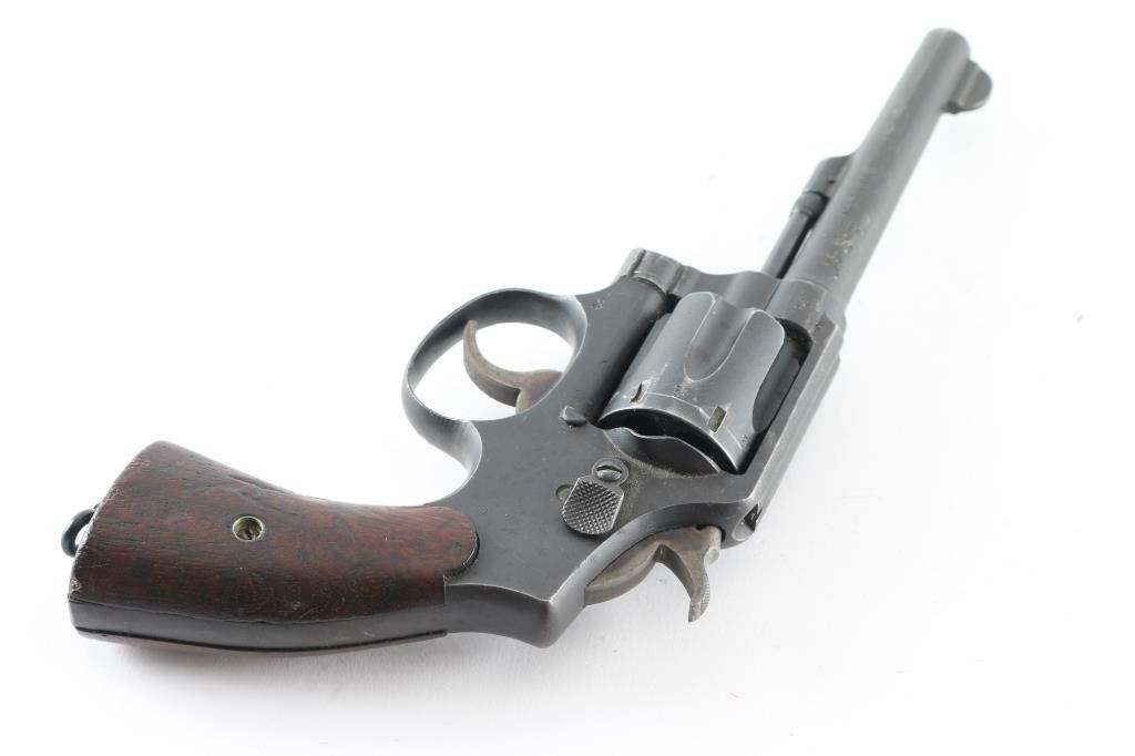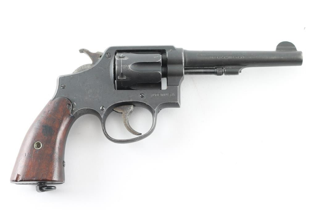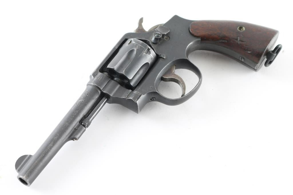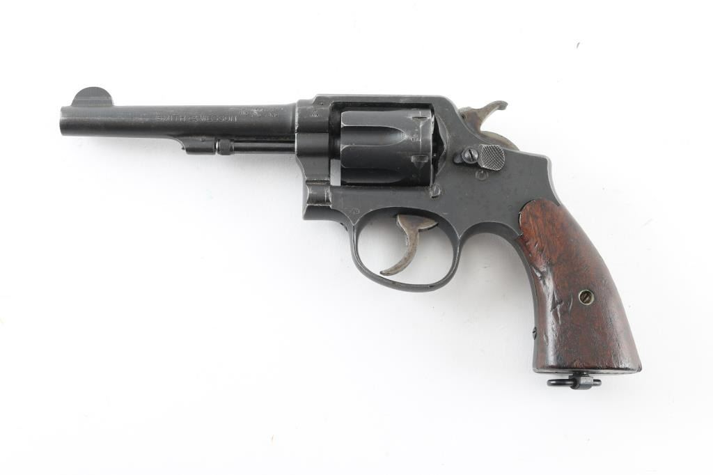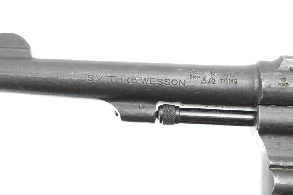 US WWII era military revolver manufactured circa 1942-1945, provided under "Lend Lease" to British or UK Commonwealth militaries. Features 4" barrel, fixed sights, fluted 6 shot cylinder, single/double action, lanyard ring in butt. Wartime "Victory Model" based on five screw K frame Military & Police. Bore and charge holes are very good condition. Metal is refinished, bead blast matte finish, appears parkerized brownish toned gray, 90% coverage with bare metal at muzzle, along edges, cross high spots. S&W frame logo is almost completely erased, under the current finish. Trigger and hammer retain dull case color, with bright metal rub marks from operation. Grips are smooth walnut in good condition with dents & small chips. Action is smooth with tight lock up. Barrel & cylinder numbered "365623". British proofed on left side of barrel & frame. Condition is NRA Very Good (Arsenal Reworked) *** C&R Firearm ***