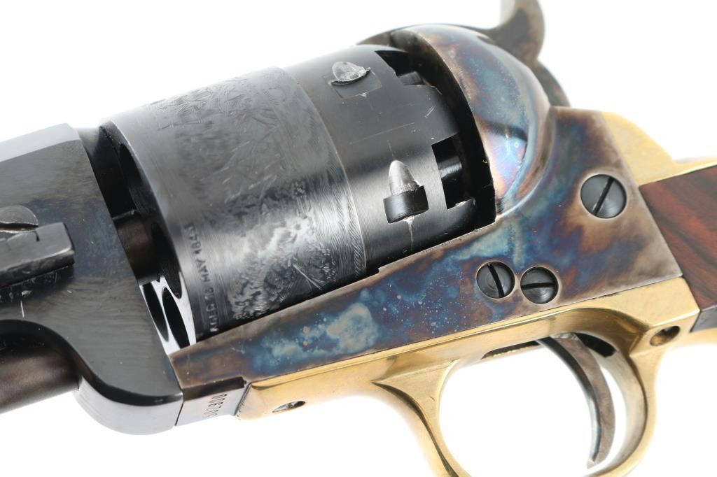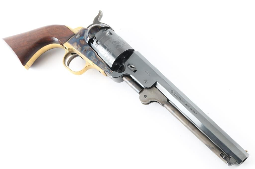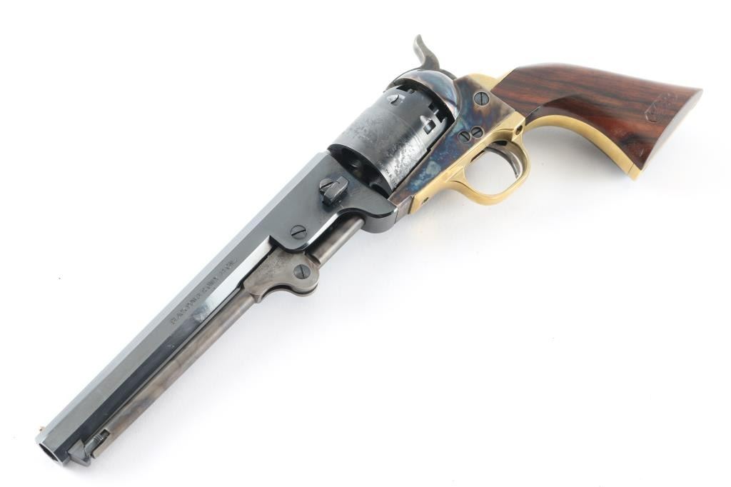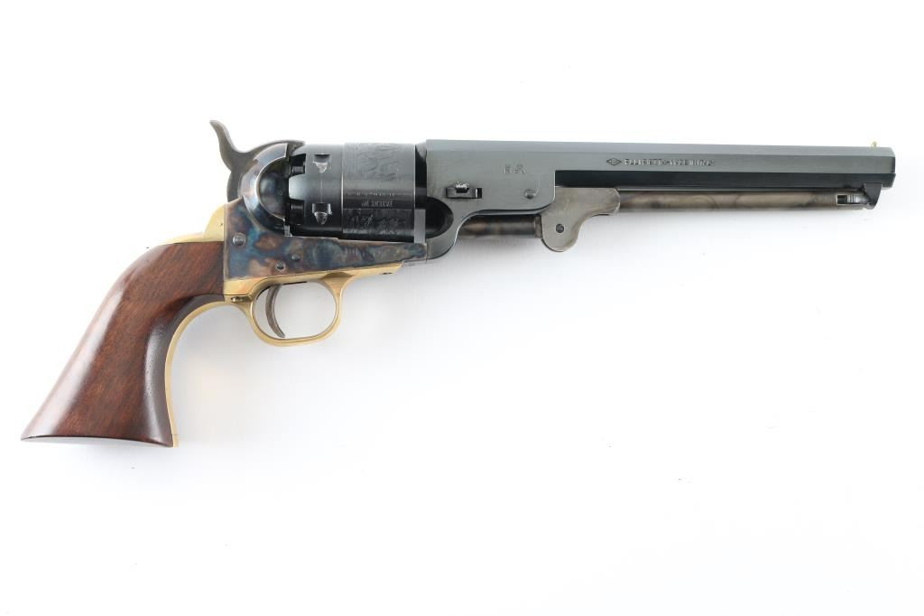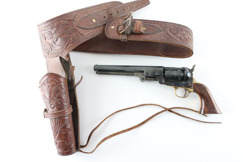 'Hartford' model Italian made replica of a Colt 1851 Navy black powder revolver, in 44 caliber, which is more properly the "Army" caliber. Features blued/case colored finish, 7.5" octagon barrel, loading lever under barrel, brass post front sight, rear sight notch in hammer nose, brass grip straps, round brass triggerguard, rebated cylinder with naval battle scene roll engraving. Bore is very good condition, appears unfired. Barrel & cylinder retain 95% blue, with handling marks, scratching around barrel wedge. Case colors are very good, with mottled bright colors. Brass surfaces show a slight mellowing. Walnut grip is very good condition, oval cartouche ("JLH" ?) on butt. Includes a poor condition (stitches coming undone) gun belt rig, 'Buscadero' style with 38 cal cartridge loops on belt, floral carved brown leather, about 40" long, holster length best fits an approx 5" barrel. Condition is NRA Very Good++ *** Antique Firearm ***