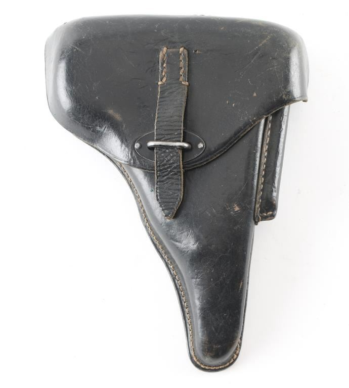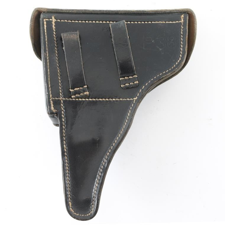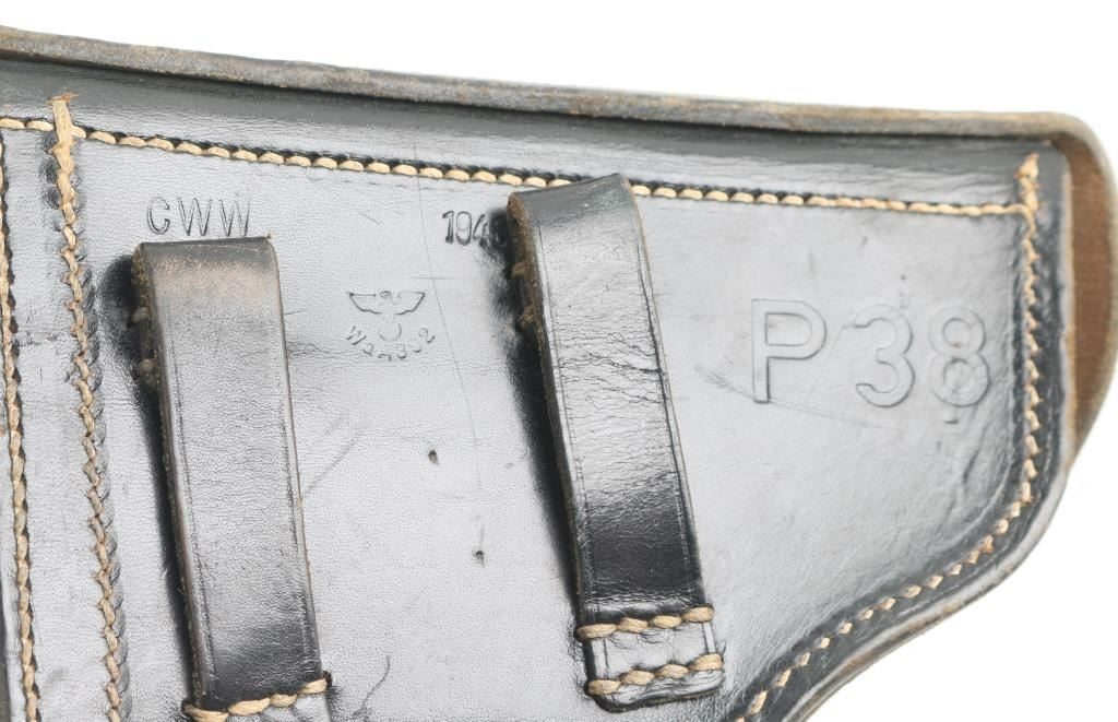 Third Reich era German Military/Police holster for the P-38 Pistol. Soft shell. Black leather construction. Large "P.38" stamped on back, along makers code cww, dated 1943, Waffenamt Eagle/WaW392. Intact, very good condition.