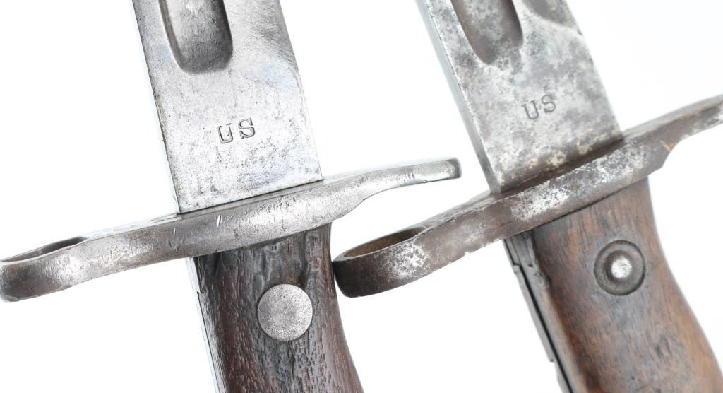 1) U.S. 1899 marked with scabbard. Fair condition with pitting to the scabbard, and some minor chips out of the grips. 2) U.S. 1900 marked. No scabbard. Has rust/pitting.