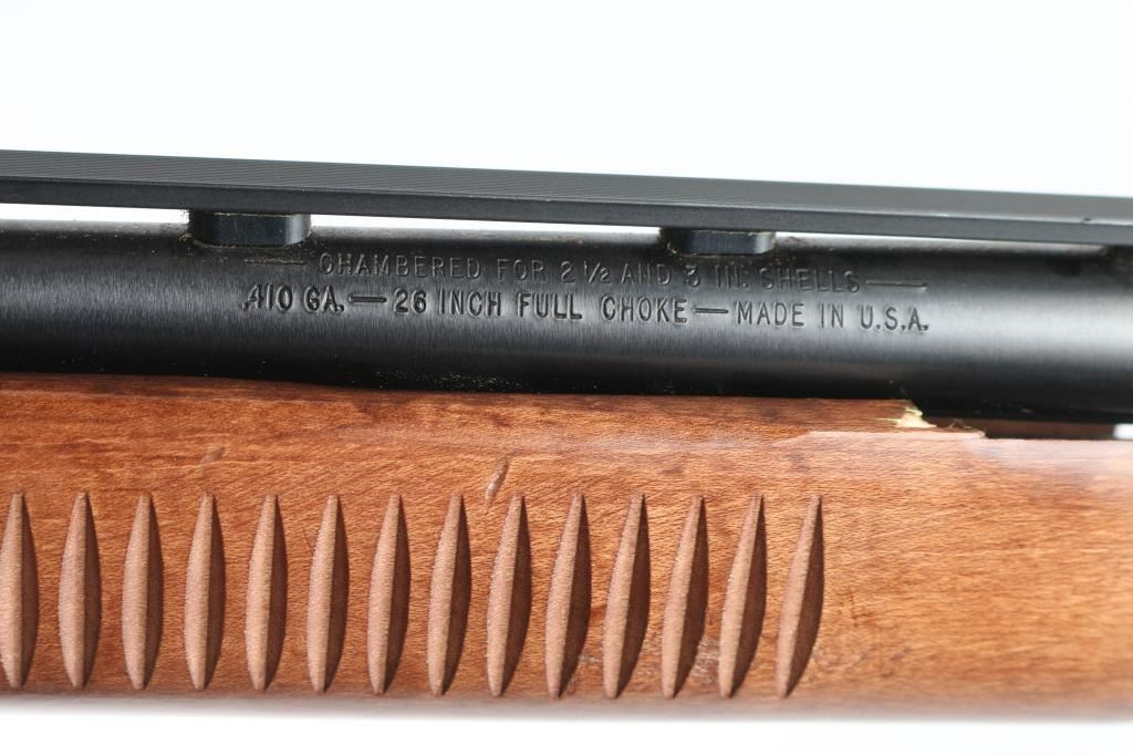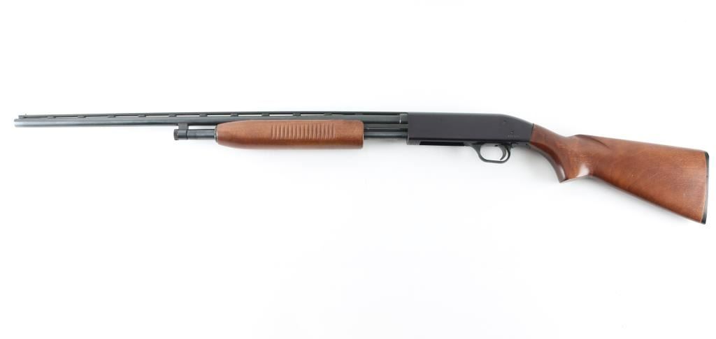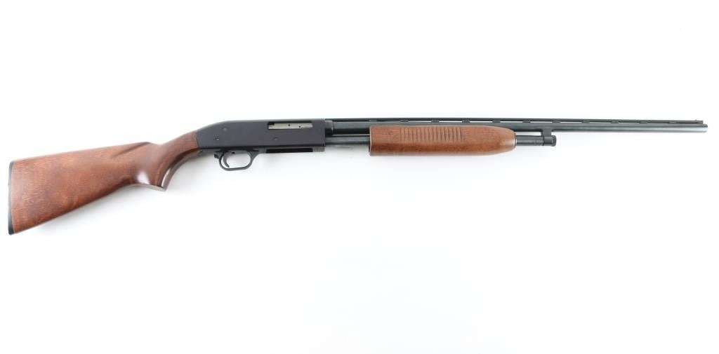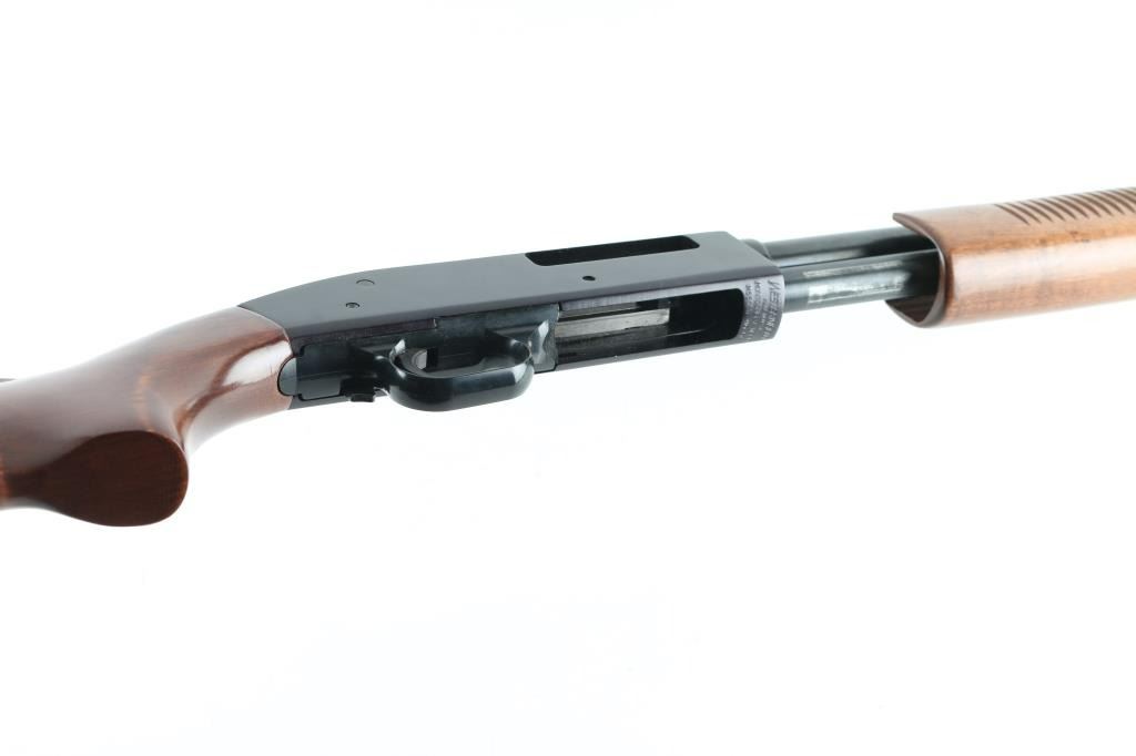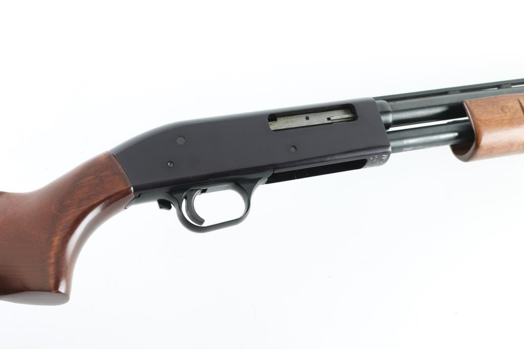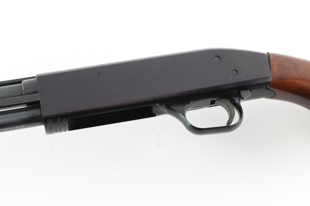 Montgomery Ward Western field pump-action shotgun in .410 Ga, features a 26" barrel with ventilated sighting rib with brass sighting bead, full choke, chambered for 2 1/2" and 3" shells. manufactured by Mossberg for the Montgomery Ward western Field brand. Bore appears excellent/bright. Action is smooth/tight. Wood is excellent with a couple of very minor scratches. Blued finish is about 98%. The issue id the tang safety lever is missing, plate and screw are there, and is still operable. NRA condition-Very good. Modern Firearm.
