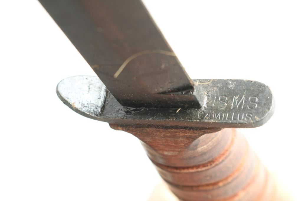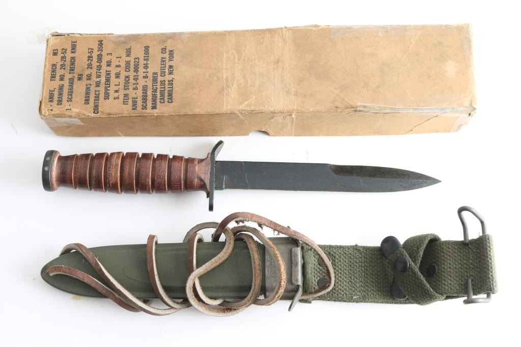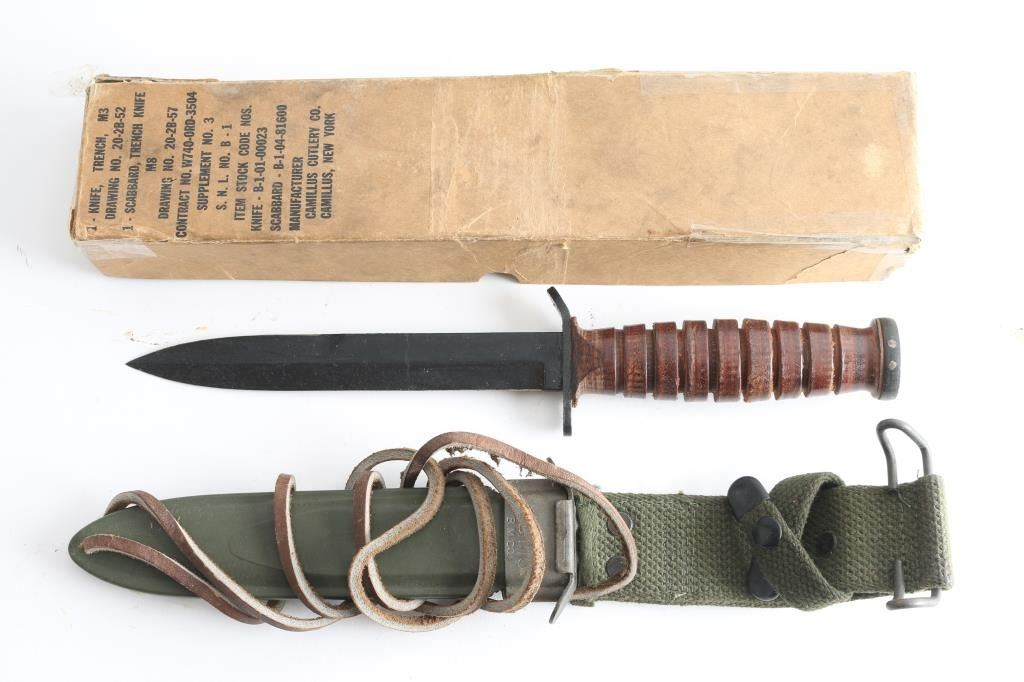 WW2 U.S. M3 Trench knife made by Camillus. Produced March 43- August 44. 6.75" narrow blade. Stacked leather grips. Underside of guard stamped U.S. M3 Camillus. This knife comes in the original Camillus box (corners separated / taped) Comes with its original US M8 scabbard made by B.M. Co with leather tie. Knife and scabbard are in unissued condition. Still in the original wax wrapping paper with cosmoline. Rare to find a WW2 like new M3.