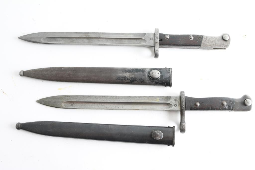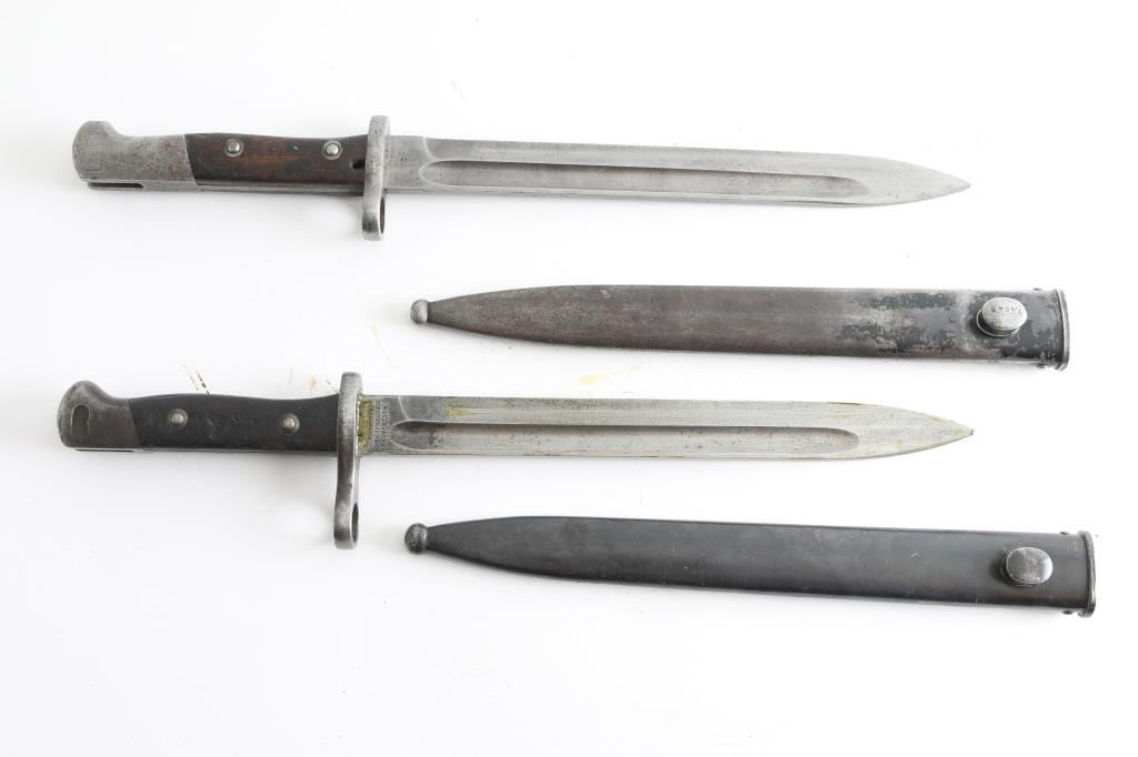 for M1895 Mauser. 9-3/4" blades. Steel Scabbards. 1) German made contract by Weyersberg Kirschbaum & Co. Ricasso stamped with Chilean crest and Krupp steel proof. 2) Chilean crest and "CE WG stamped on ricasso (Austrian State Weapons Manufacturing Co). Both in good condition.