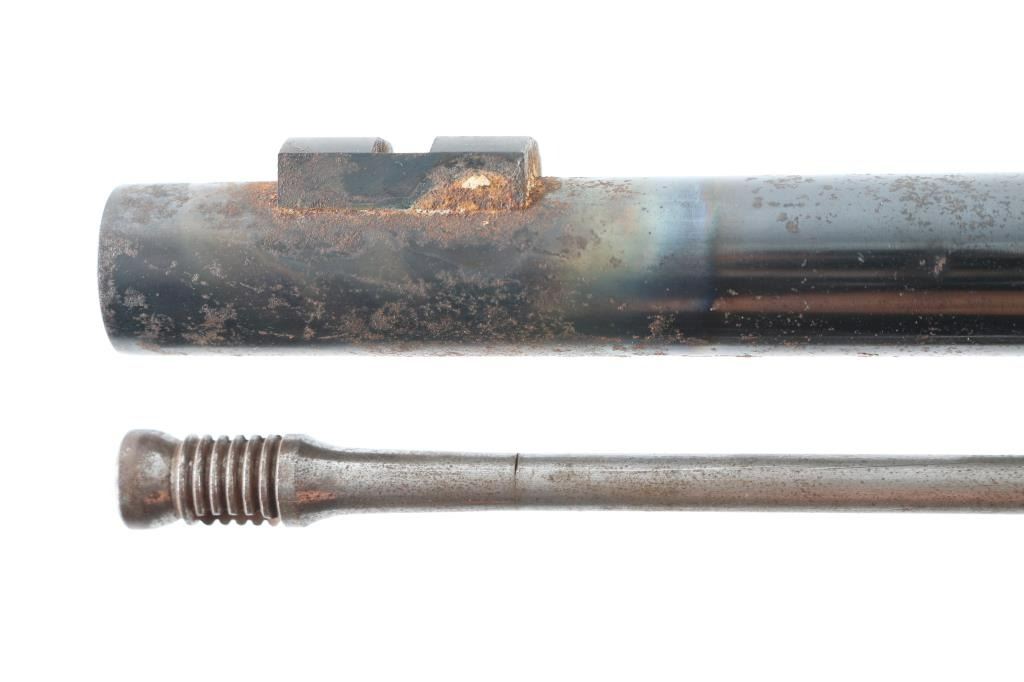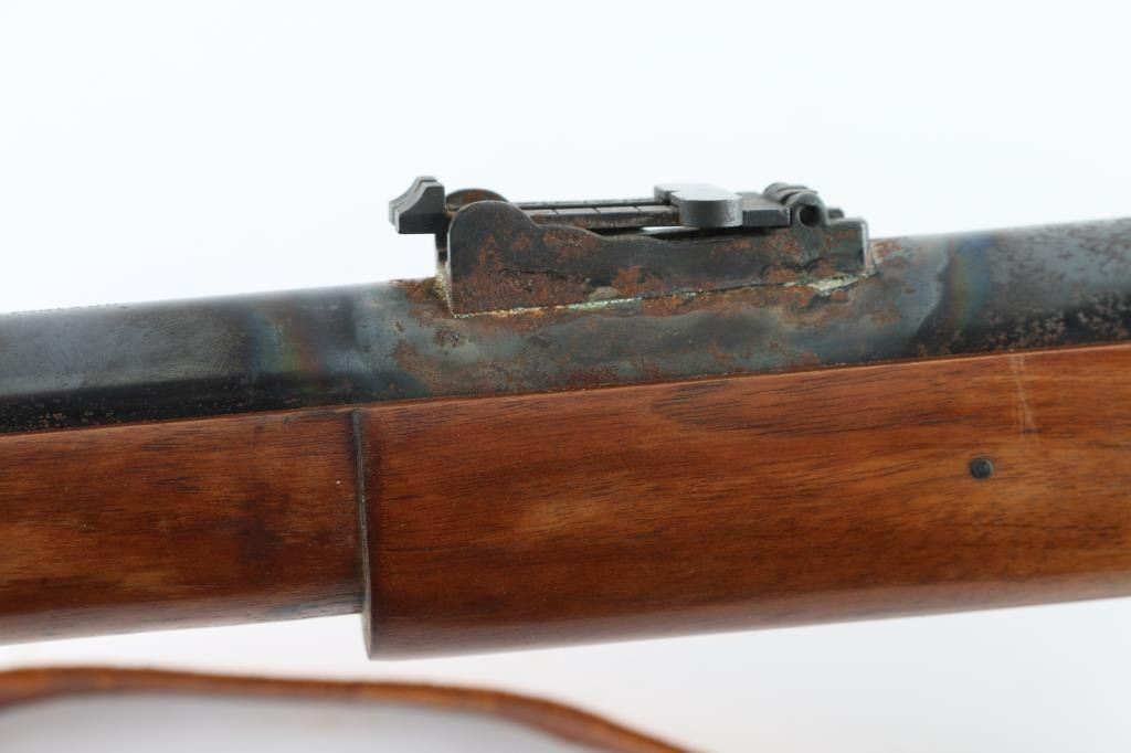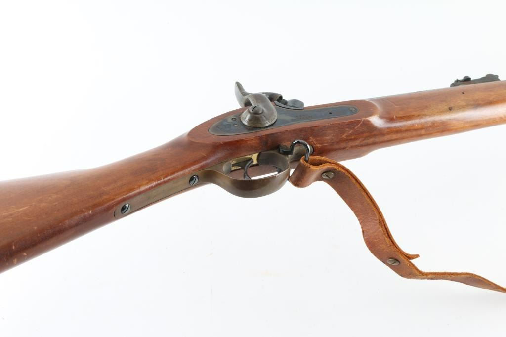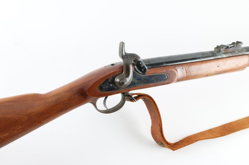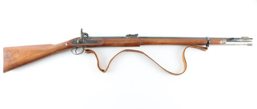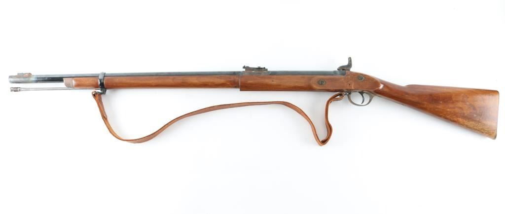 SN: 1106 English made percussion musket. 33" blued barrel, bayonet lug. Case-hardened lock plate and hammer. One piece stock with brass plated furniture. Action is crisp/tight. Missing lower barrel band, front sight blade, and tang screw. Finish loss to the hammer, Scattered areas of pitting on the barrel. Around both sight bases are areas of rust/pitting and finish loss. Wood is good with scratches/dings. Bore has light surface rust. Cleaning rod present. Brown leather sling attached. A restoration project. NRA Condition-Fair-Missing Parts Antique firearm.