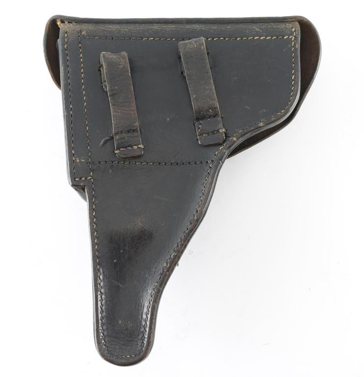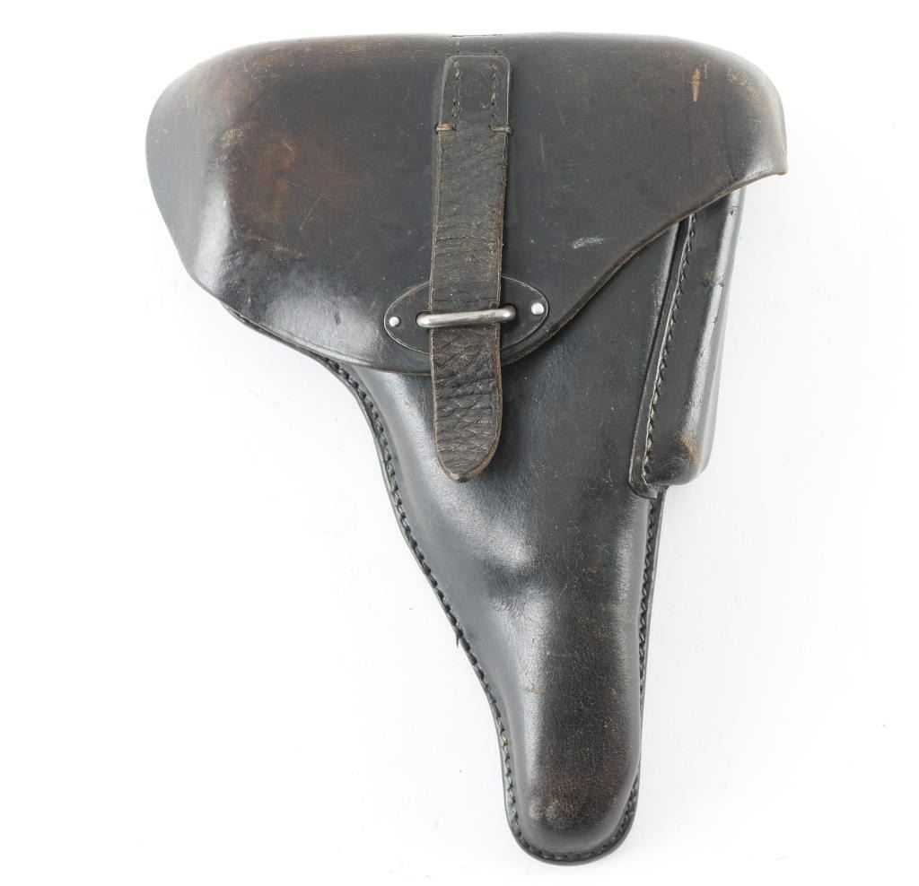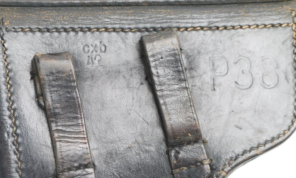 Third Reich era German Military holster for the P-38 Pistol. Hard shell. Black leather construction. Large "P.38" stamped on back, along makers code cxb dated 1942, no waffenamt. Intact, very good condition.