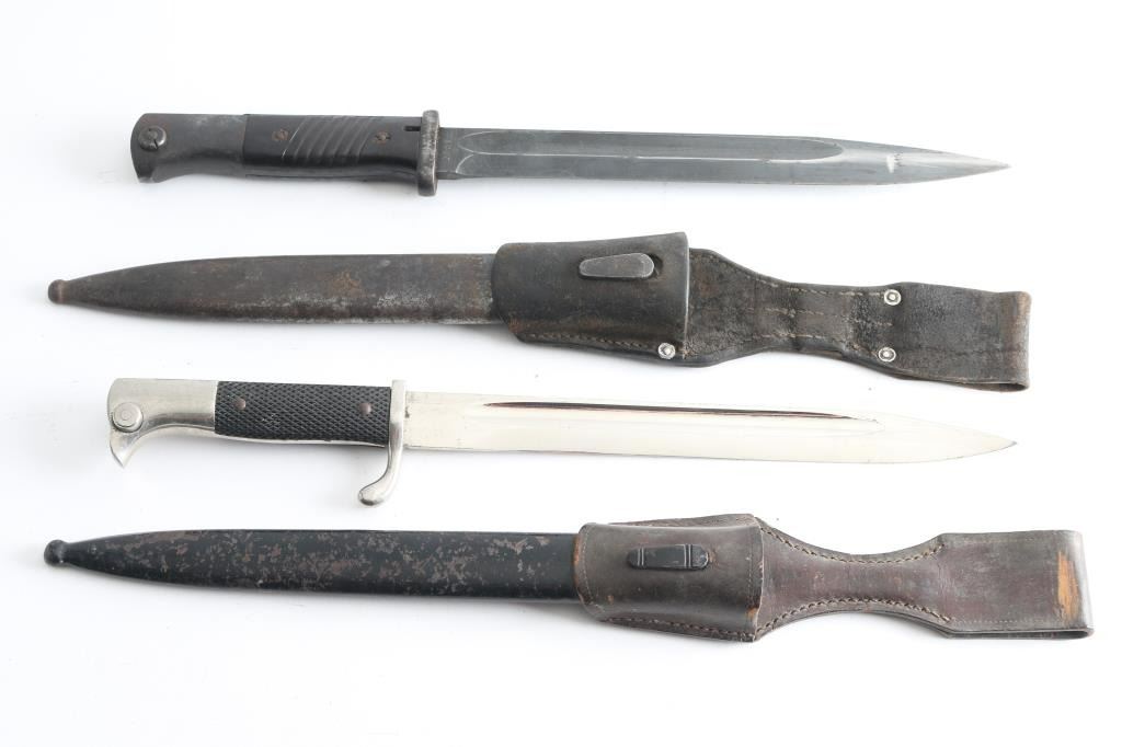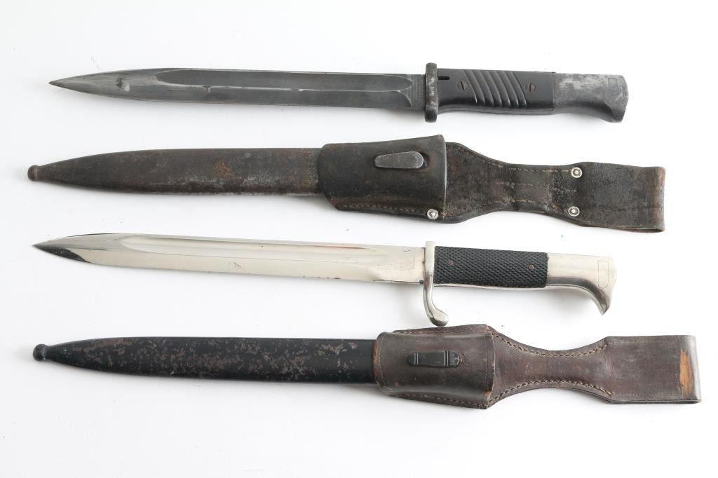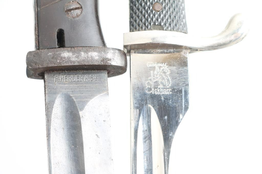 1) German WW2 Army dress bayonet. made by Eickhorn with the squirrel logo on blade. Birds head pommel. Bayonet is very good with bright blade. Scabbard has chips to the paint with small spots of rust. Comes with correct leather frog. 2) K98 Mauser bayonet. Ricasso stamped " F. Herdera.Sn" Blade is very good with most of the original blue. The rest of the exposed metal has rust spots with some light pitting in places. Comes with correct leather scabbard.