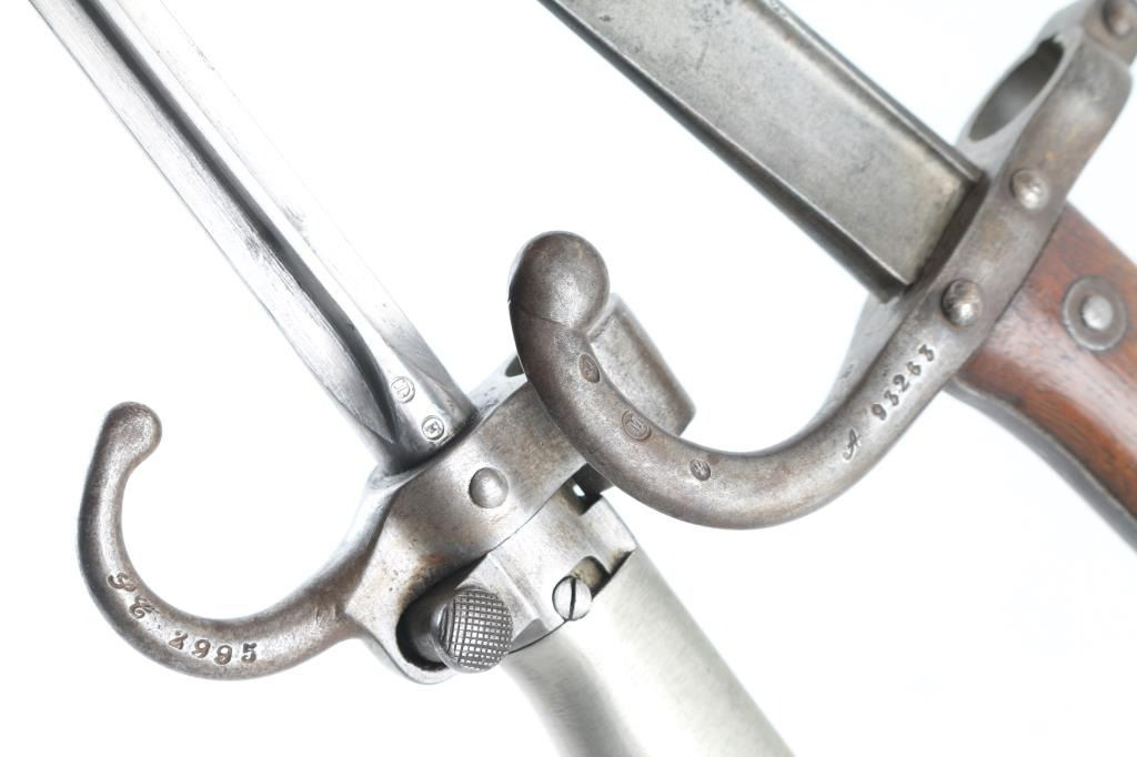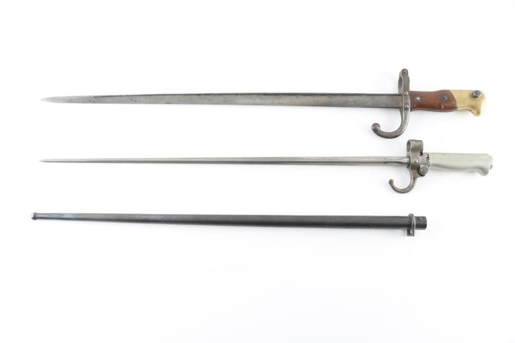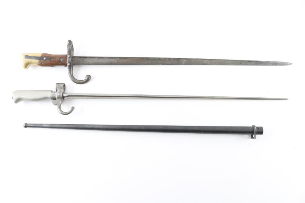 1) M74 Gras infantry rifle bayonet. St. Etienne, dated 1876. 20" blade. No scabbard. 2) M1886 Lebel. 20.5" cruciform blade. White metal. Hooked quillon. Checkered push button.