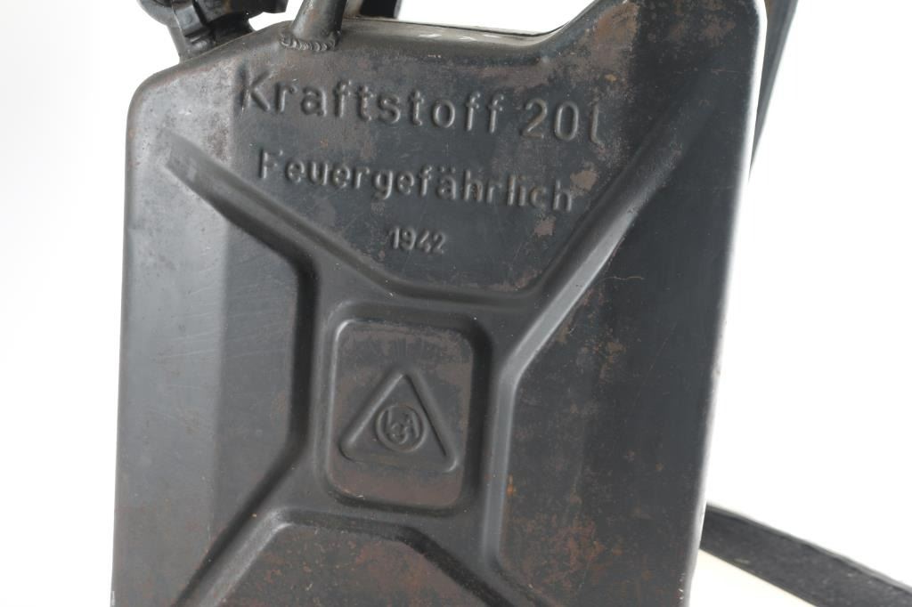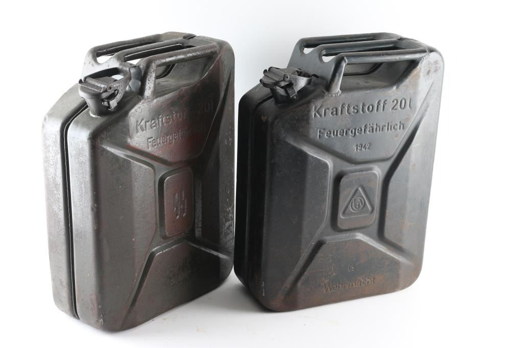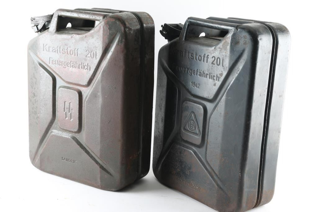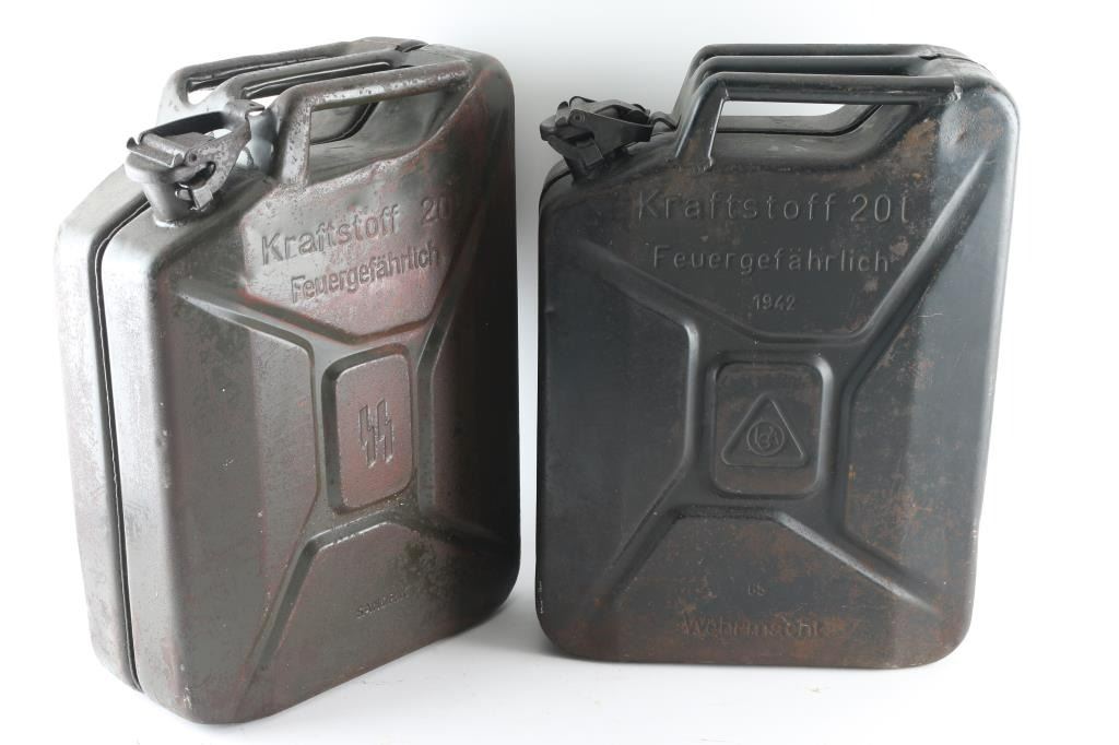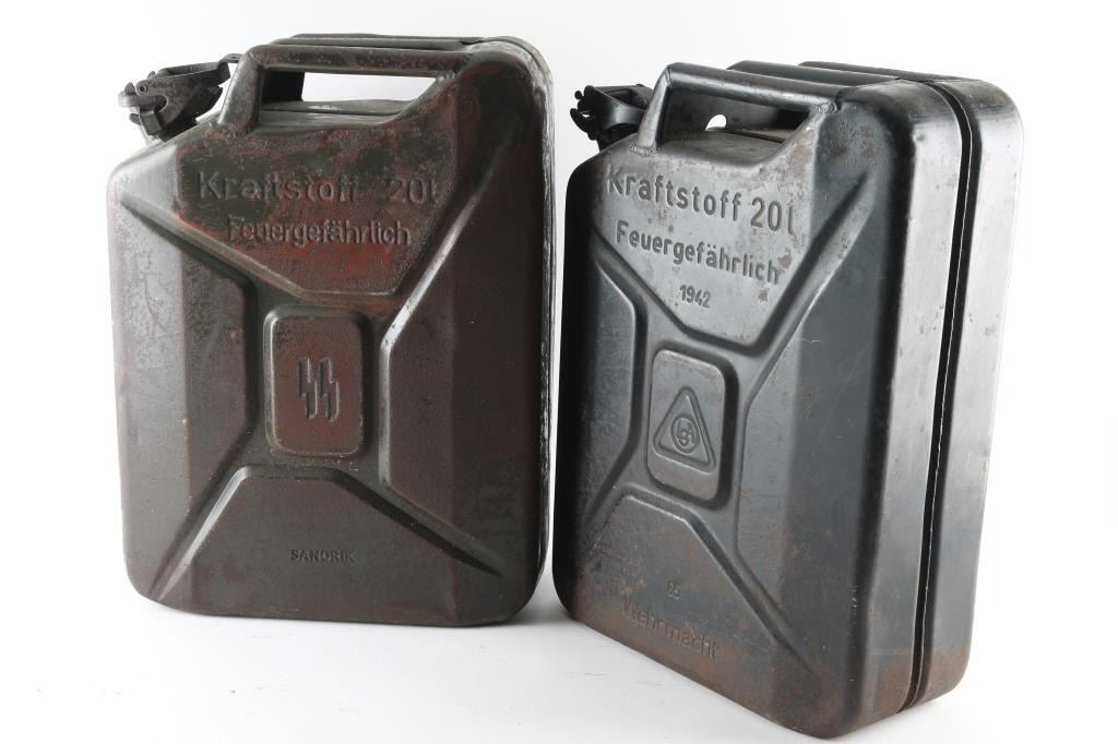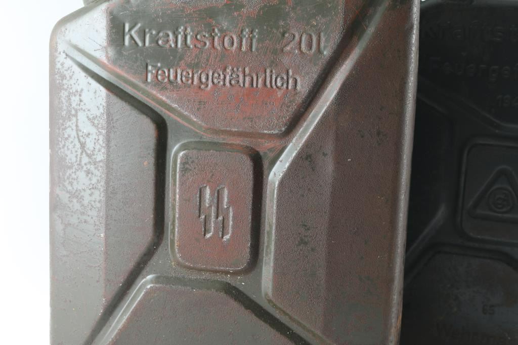 1) 20 liter Waffen SS gas can. Original, not one of the Sandrik copies with the flower on the lid. Marked "Kraftstoff 20L, Feuergefahrrlich, SS Runes in the middle, and Sandrik". Complete, the rear of the can is dented with some reddish coloring that appears to be fire damage. About 9 lbs. 2) 20 Liter German WW2 "Jerry" can. Has most of the original paint with some rust spots. Marked "Kraftstoff 20L, Feuergefahrlich, 1942, 65 Wehrmacht" Maker appears to be "LCA" in circle. About 9 lbs. A nice set.