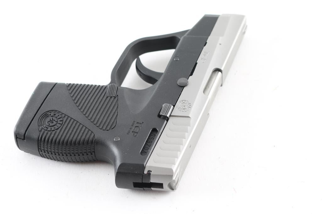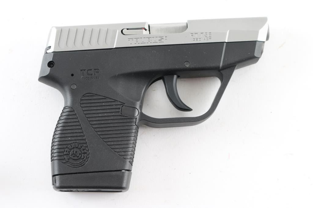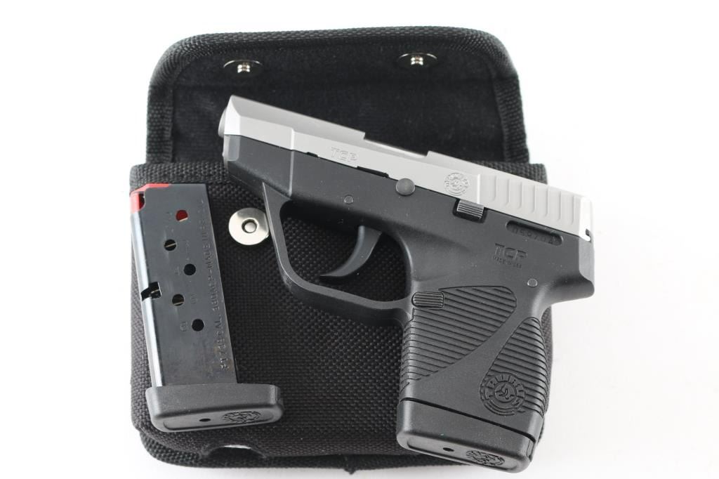 Made in the U.S.A. this is a Taurus TCP Model 'PT 738' Sub-compact double action only semi-automatic pistol chambered in .380 Auto. Features a stainless steel slide, 2.84" barrel, fixed sights, smooth trigger, push button magazine release, concealed hammer, 6 round factory magazine and black polymer frame with integral serrated grips. Includes a Bulldog black nylon holster, 2 magazines, keys for the built in trigger lock and original owners manual. Slide and frame look great. Bore looks good needs cleaned. Condition is NRA Excellent **Modern Firearm**