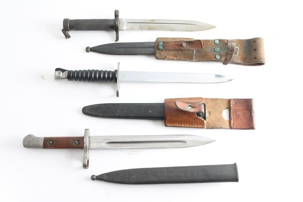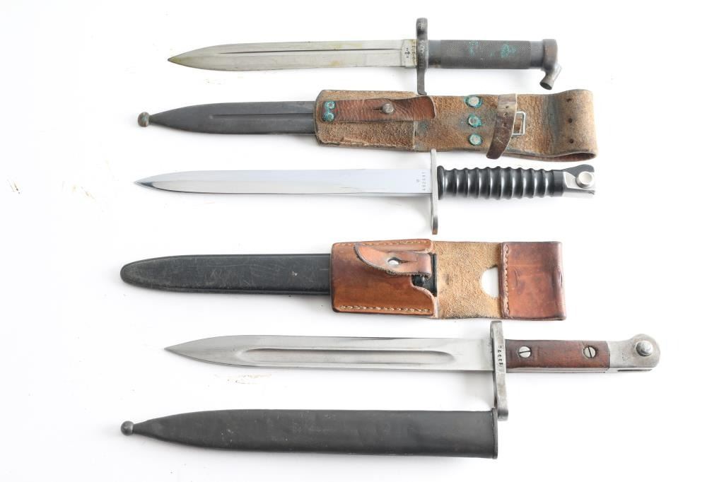 Three total. 1) Turkish M35 Mauser bayonet 9 1/2" blade. Pommel marked AS.FA (faint) 2) Swiss M57 made by Waffenfabeik Bern, with logo on ricasso, Brown leather scabbard maker marked, dated 1986. 3) Swedish M96 Bayonet "EJ AB' marked. Later manufacture with conical stud. Steel scabbard, Brown leather frog. All in good condition.
