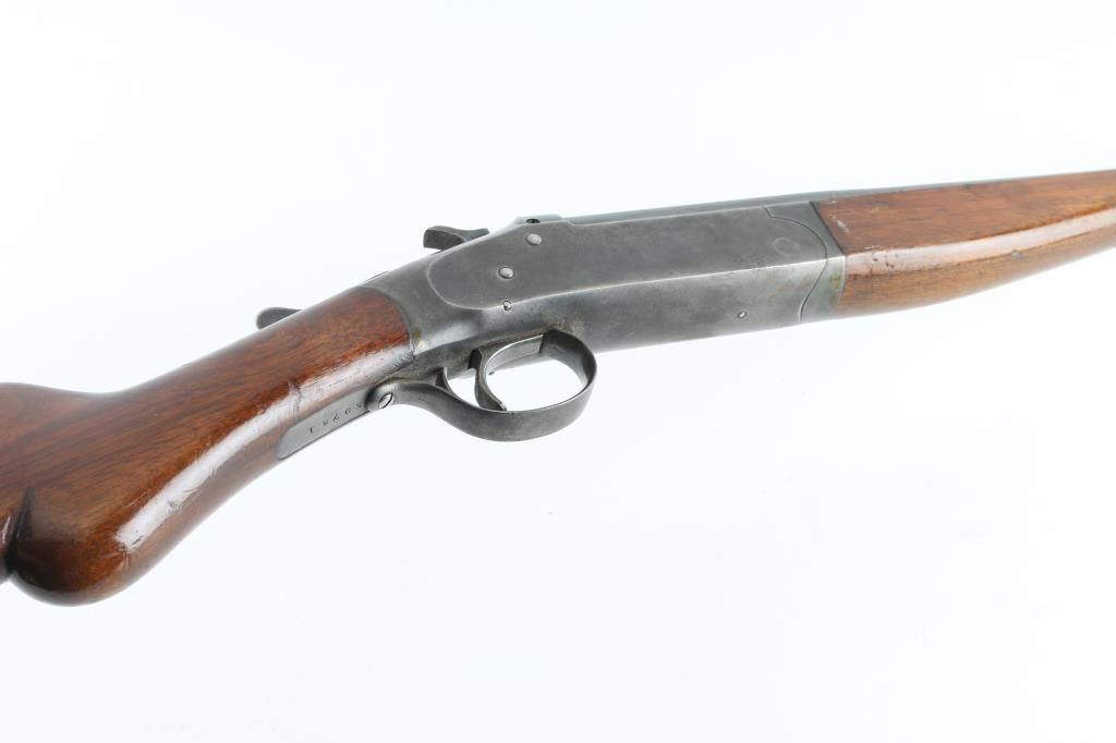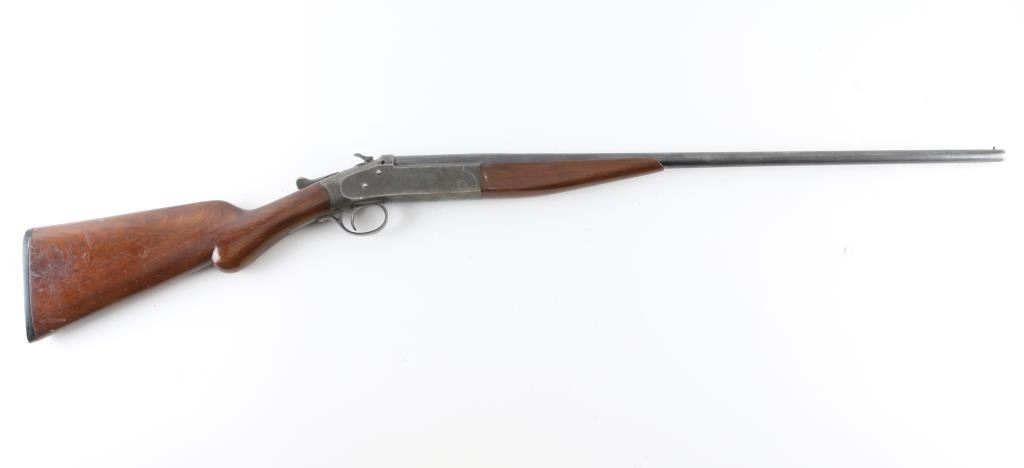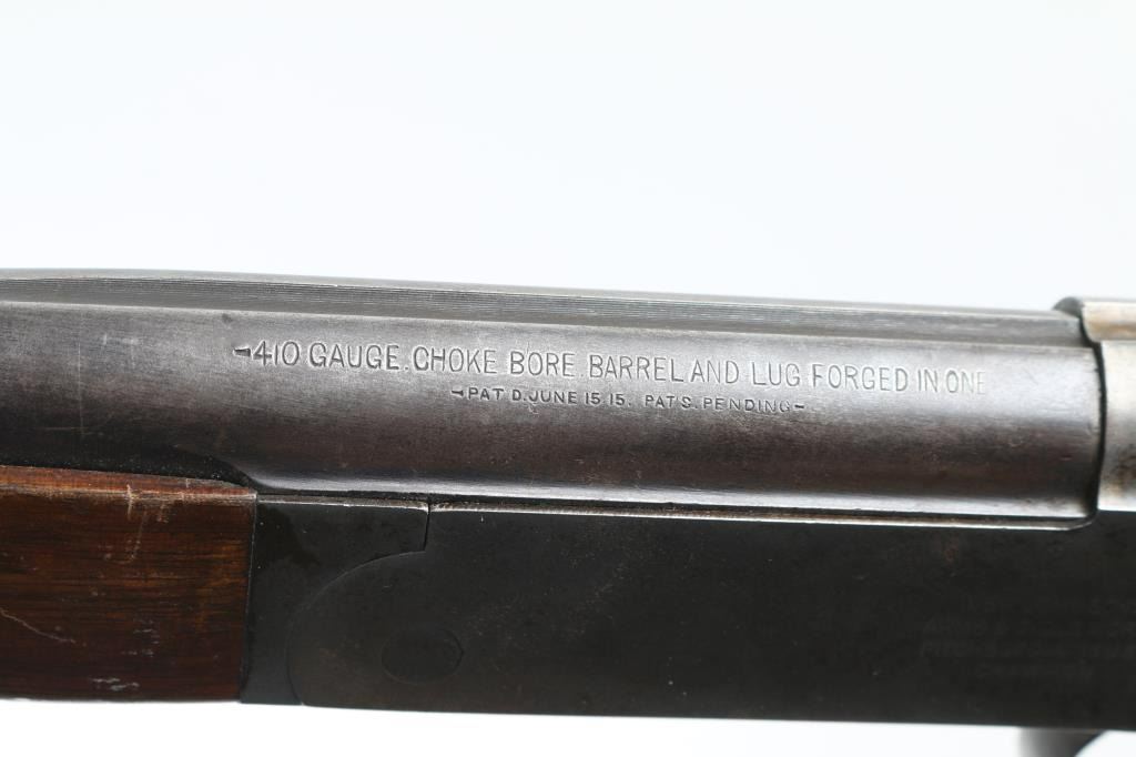 Vintage single barrel break-action shotgun chambered for .410 bore shells, circa 1909-1929. Features a 26" barrel, brass bead front sight, automatic ejector, smooth trigger, knurled hammer spur, knurled top lever, steel receiver, smooth wood splinter forend and semi-pistol grip shoulder stock with "Owls Head" factory buttplate. Shotgun exhibits little remaining finish with the majority of the metal surfaces turned to a gray patina. Action performs well, bore is very good/bright, and wood stocks are sound with numerous scratches/dings. NRA Condition-Good. C& R firearm.