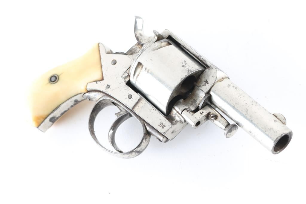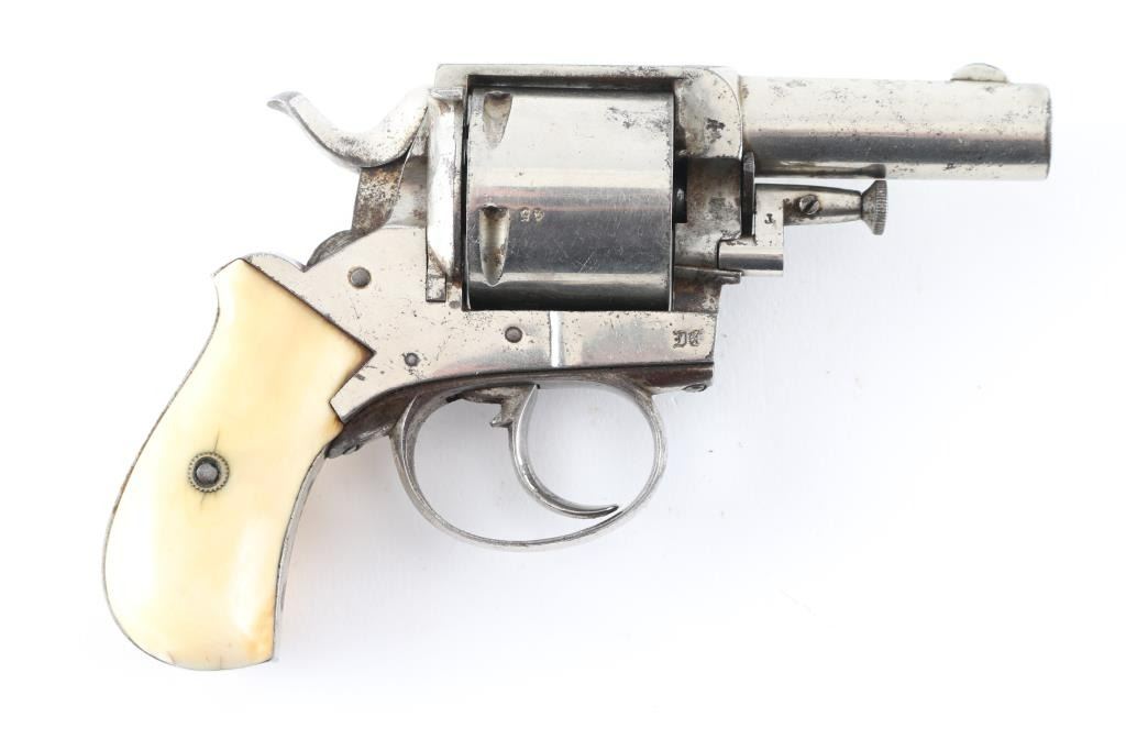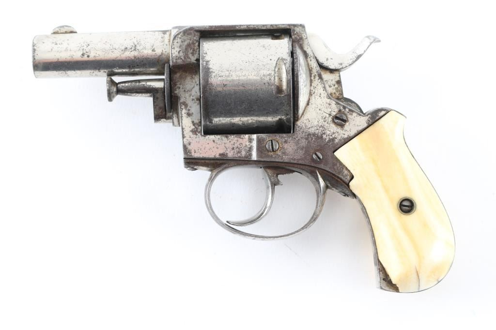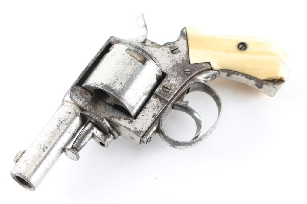 Belgium made copy of the British bulldog revolver circa 1880's. Nickel plated, ivory grips, 2 1/5" barrel. Top strap marked "The British Bulldog", Liege proof on the cylinder, along with "45". Bores, and cylinders are rusty/pitted, action needs work, fires single-action only. The screw for the extractor sleeve is missing. The finish is about 60% with handling loss, flaking, and scattered areas of pitting/rust. The ivory grips have a nice yellow patina, there is a small chip out of the left lower panel. NRA Condition-Fair-Action needs work. Antique Firearm
