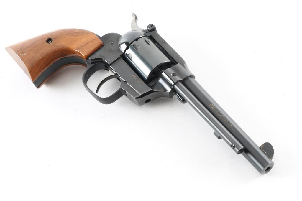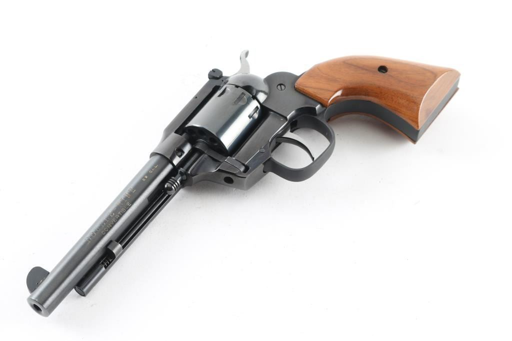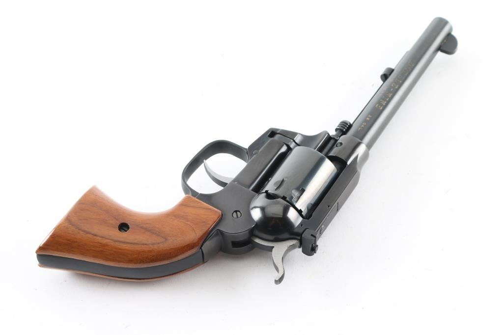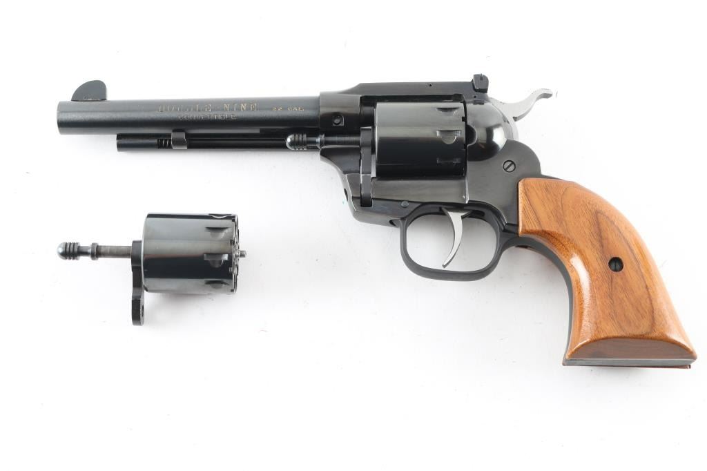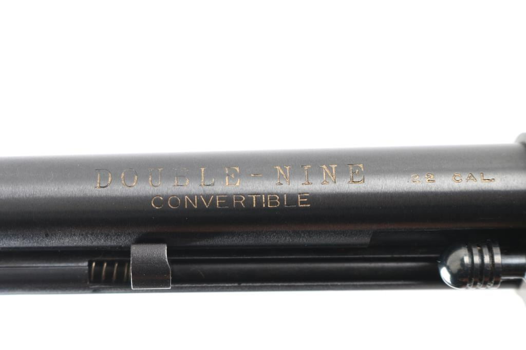 SN:M081022 Made in America this is a Double Action, 9 shot revolver chambered for .22 caliber ammunition circa 1981. Made to look like a single action army it features a 5.5" blued barrel and frame with a blade front sight, adjustable rear sight, serrated hammer spur, smooth trigger, swing out cylinder and two piece smooth wood grips. Double-Nine Convertible is stamped on the left side of the barrel in gold tone lettering. The barrel and frame have a high polish finish while the grip frame is matte finished. Metal finish looks very good. There is a small loss of color in the word Double on the barrel. Wood grips look good with a tiny chip on the right side. Bore looks very good but needs cleaned. Comes with cylinders, and an aftermarket plastic case. Condition is NRA Excellent *Modern Firearm*