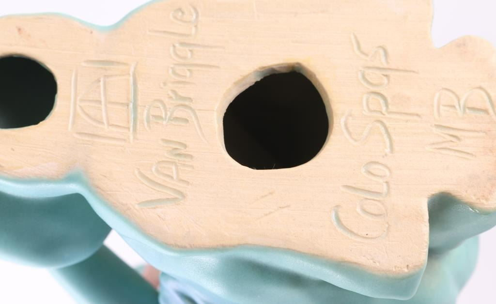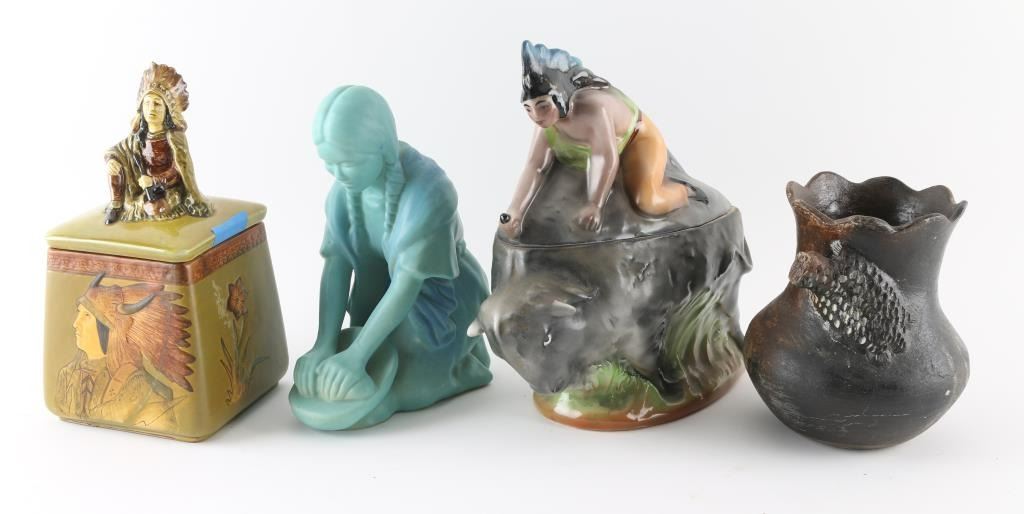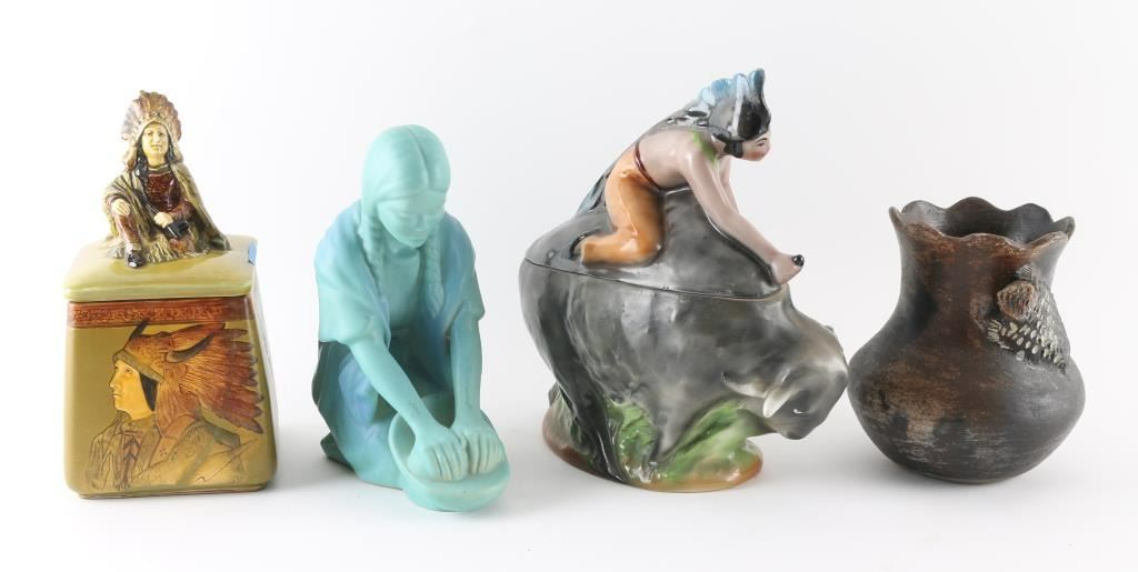 Including Vienna Austrian figural porcelain humidor, depicting indian riding a buffalo. (2) Van Briggle ceramic indian maiden, (3) with brown base with lizard, signed "Ben" at base (4) hand painted porcelain humidor with Indian chief on lid.