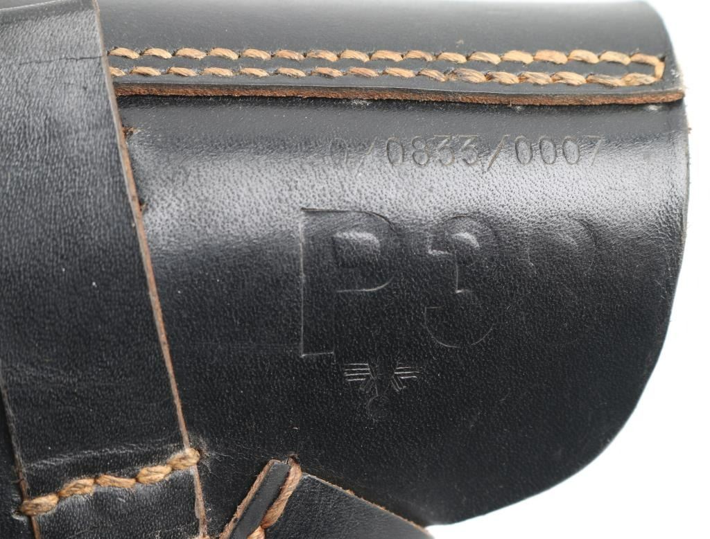 Third Reich era German Police holster for the P-38 Pistol. Soft shell. Black leather construction. Large "P.38" stamped on back, along with 0/0833/0007, with Police Eagle proof. Intact, very good condition.