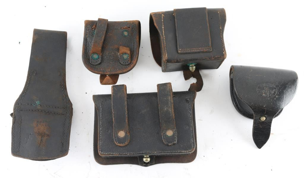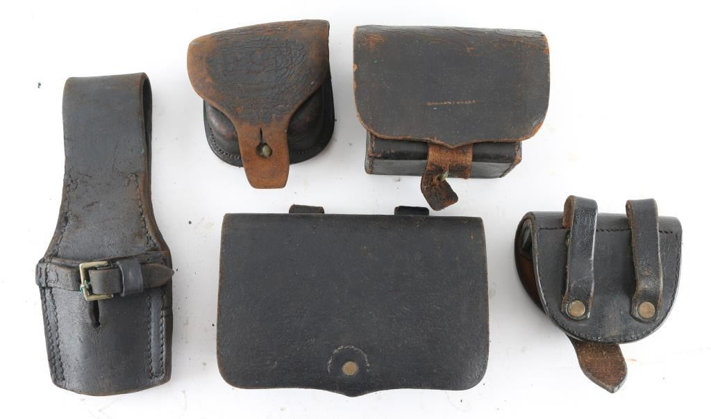 Consisting of 5 pieces. (1.) " R White" US. Ord dept-sub-Inspector marked cap box in very good plus condition. Wool and pick not present. Loops and tab are retained.(2.) Unmarked Officers style cartridge box for revolver. Markings not visible. Good overall. Normal aging. (3.) Leather frog with brass buckle marked "Hiatt" in good condition. (4.) Fuse box marked under flap "U.S.N embossed cap box for musket, fair to poor straps are ripped.(5.) U.S.N embossed cap box for musket, fair to poor. straps ripped or missing.