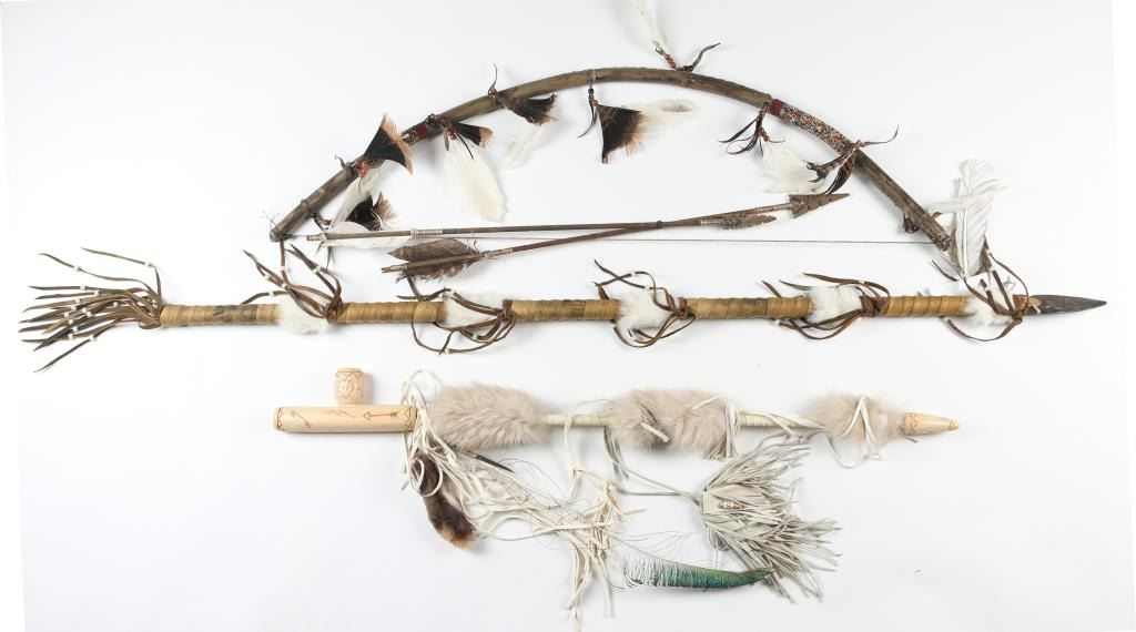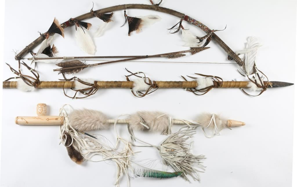 Including a hide and beaded wrapped bow and arrows, a wooden piece pipe, accented with animal fur and leather tassels, and Cherokee buffalo girk. All pieces are contemporary and would make great decorators.