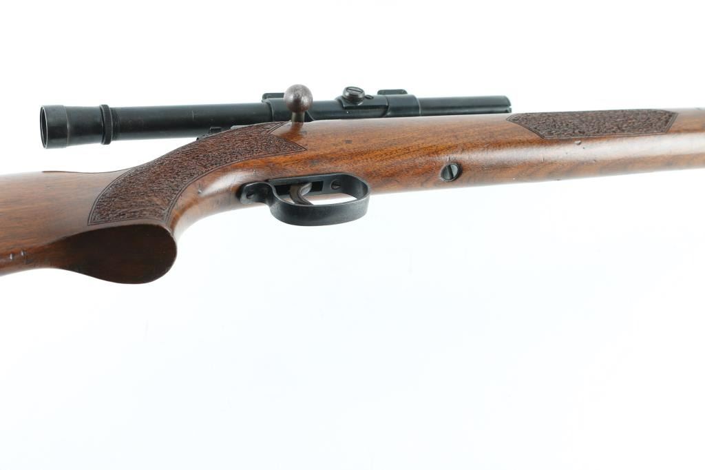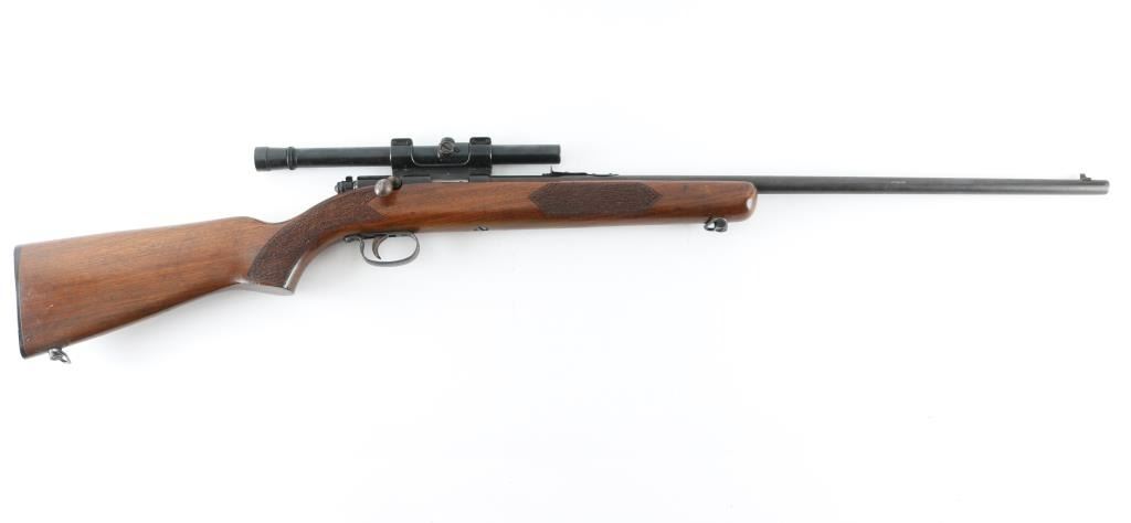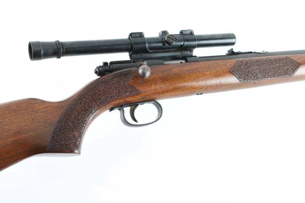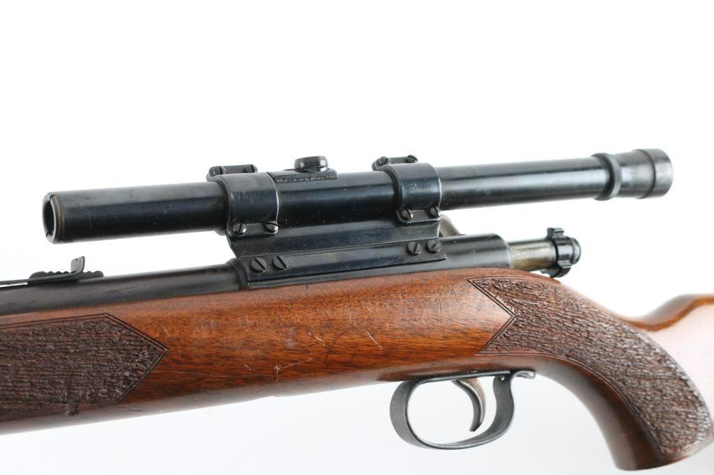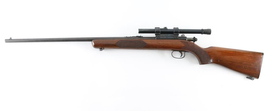 Rifle. Bolt-Action. Single-Shot. Manufactured 1948-1970. Blued steel finish. One piece walnut stock. Chrome bolt. 24" round barrel with adjustable Notch sights. Thumb safety of the rear of bolt. Walnut pistol grip stock has textured grip panels on the pistol grip, and forend, sling swivels. Bore appears excellent. Wood stock is very good with few minor dings/sctraches. Action is crisp/tight. Blued finish has dulled with the lower barrel starting to turn to a brown patina, Mounted with a vintage Weaver B4 scope, clear optics, NRA Condition-Very Good. C&R Firearm