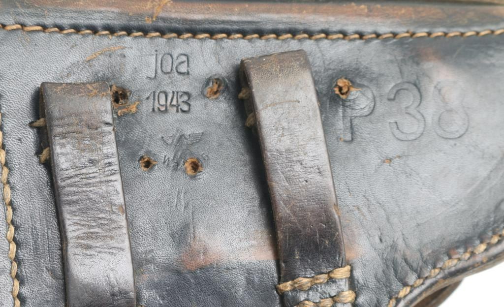 Third Reich era German Military holster for the P-38 Pistol. Hard shell. Black leather construction. Someone has punched 5 small holes in the back of holster. Large "P.38" stamped on back, along with Makers code joa, dated 1943. Waffenamt is present , but one of the holes obscures the numbers Holster is sound with some scuffing, wear. Besides the holes it is in good condition.
