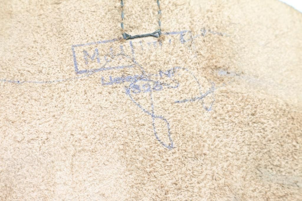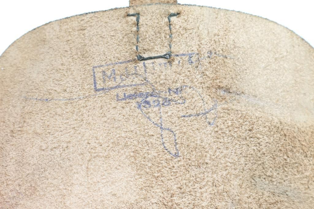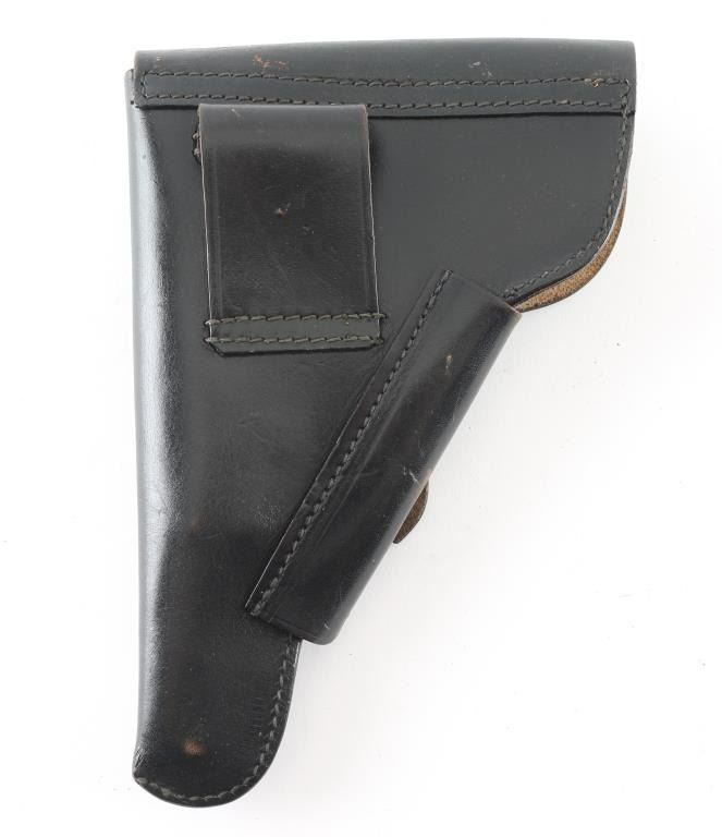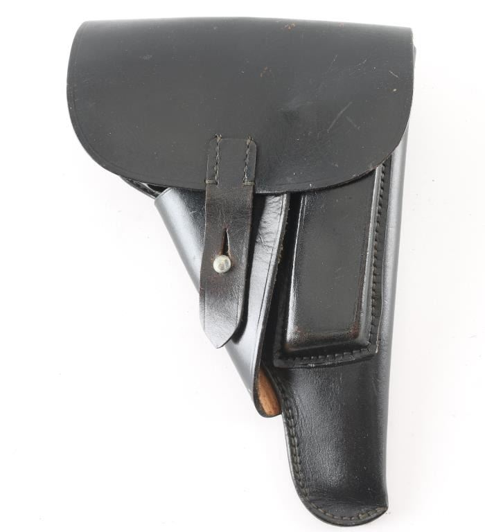 Cold war era East German DDR Police holster for the P-38 Pistol. Soft shell. Black leather construction. Early Mdj marked, date scuffed, unreadable, along manufacturers number 1828. Intact, very good condition.