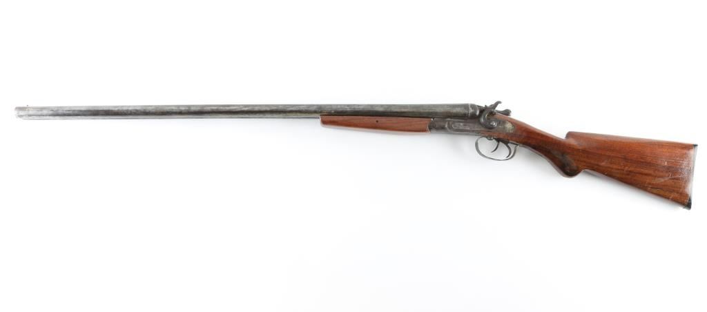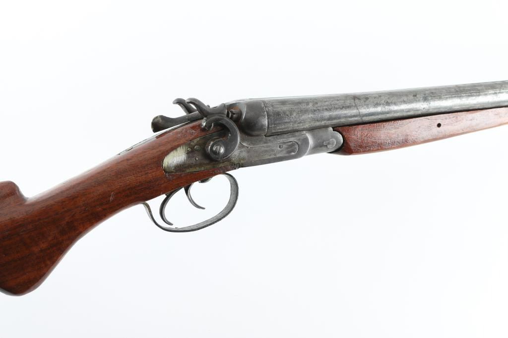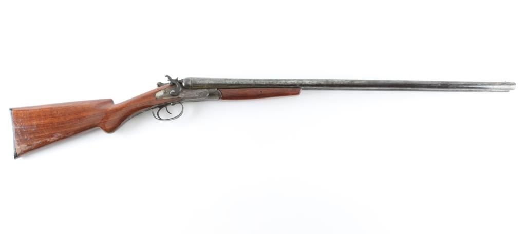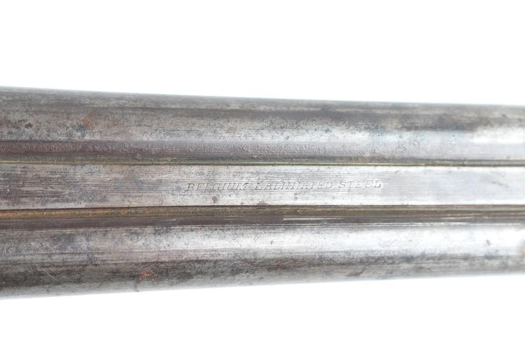 SN: 8307 Belgium made double barrel side by side shotgun chambered for 12 gauge shells, circa 1890's to 1937. Features 30" "Belgium Laminated Steel" barrels with raised solid rib, brass bead front sight, exposed hammers, extractor, smooth top lever, double triggers, smooth wood forend and pistol grip shoulder stock with serrated plastic buttplate. Forearm is a replacement. Bores are poor, rusted/pitted. Action works. Metal finish has turned a gray patina, with spots of rust, traces of blue throughout, Wood has been varnished. Buttplate not original to gun. Basically a wall hanger. NRA Condition-Poor. C&R Firearm