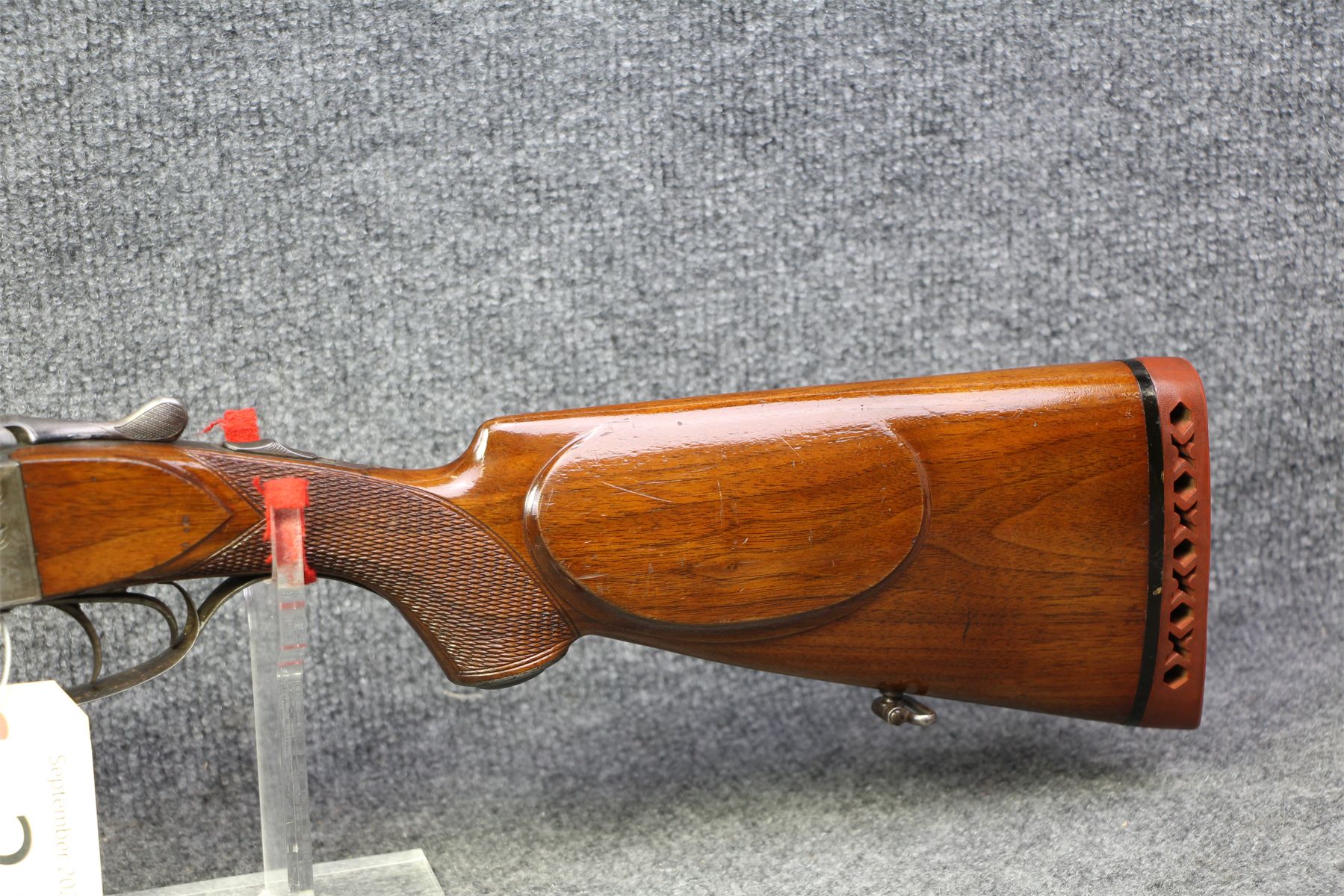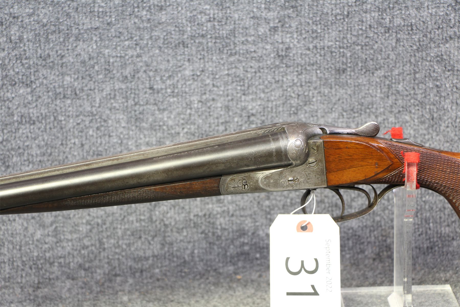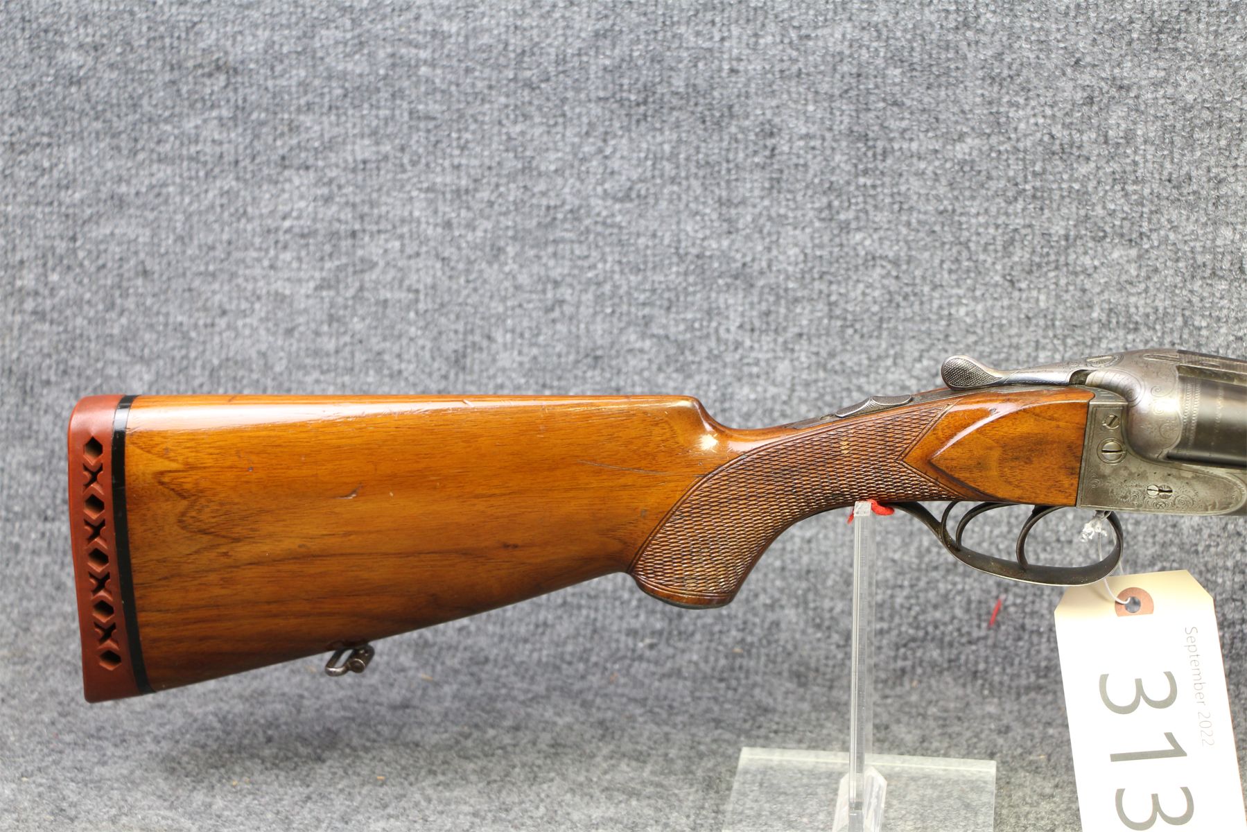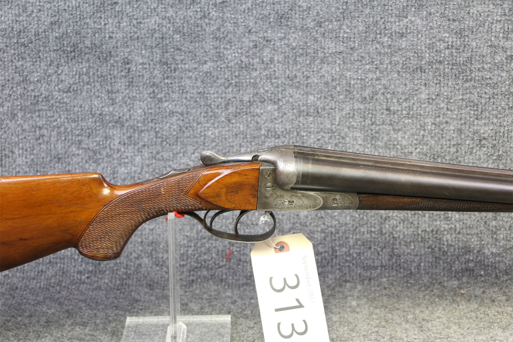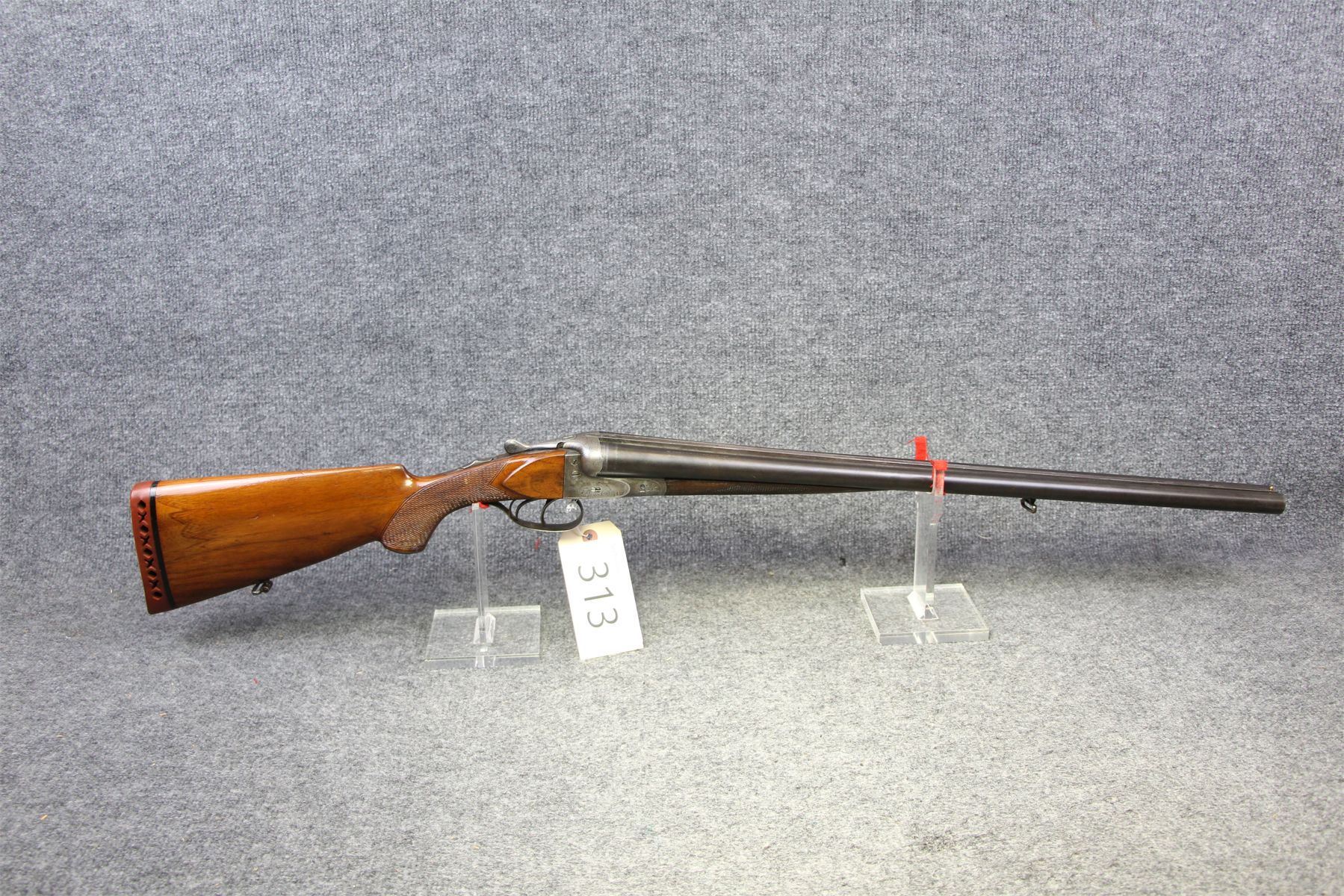 Barrels made by Krupp. Has been re-stocked. Intricate engraving and has some slight damage. Some dings and minor handling marks. Small dent in left barrel.