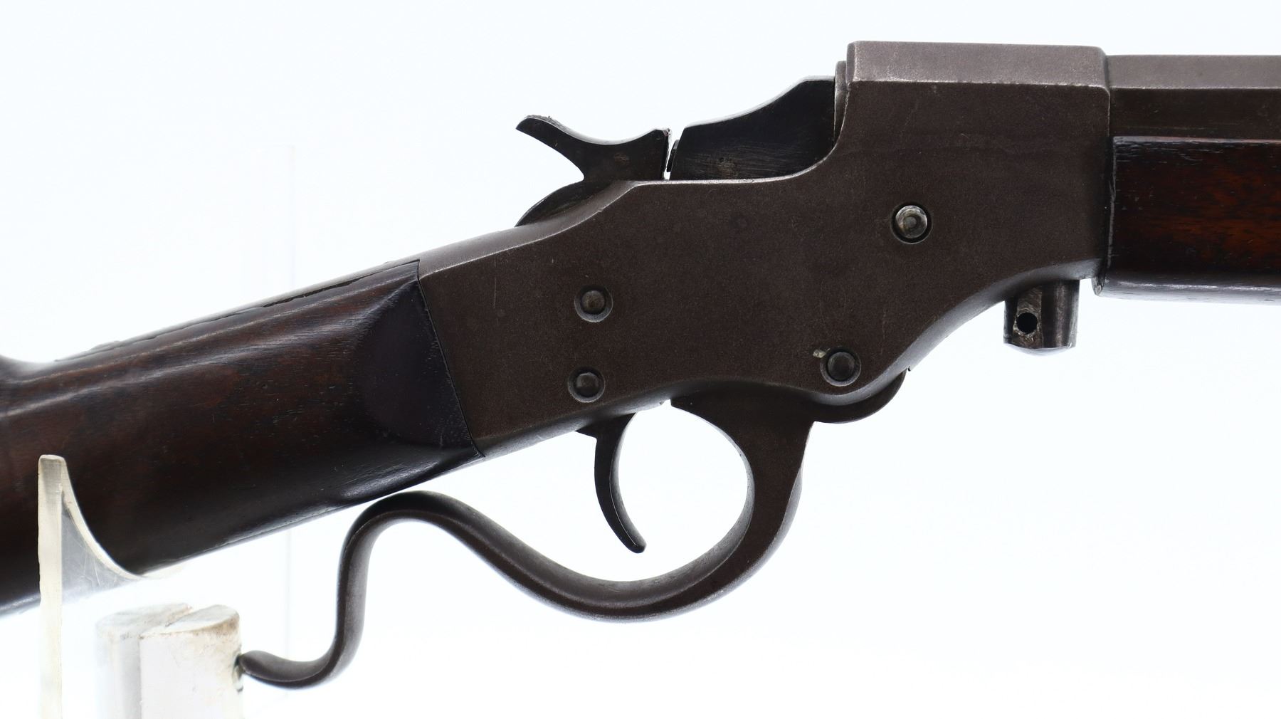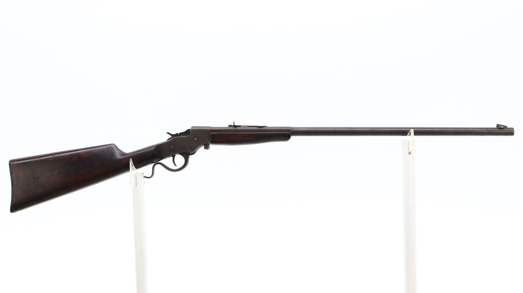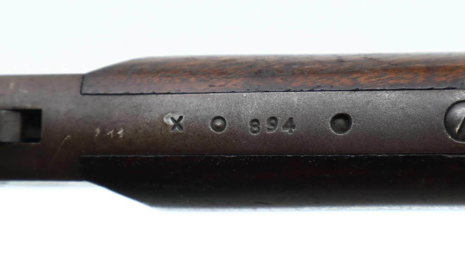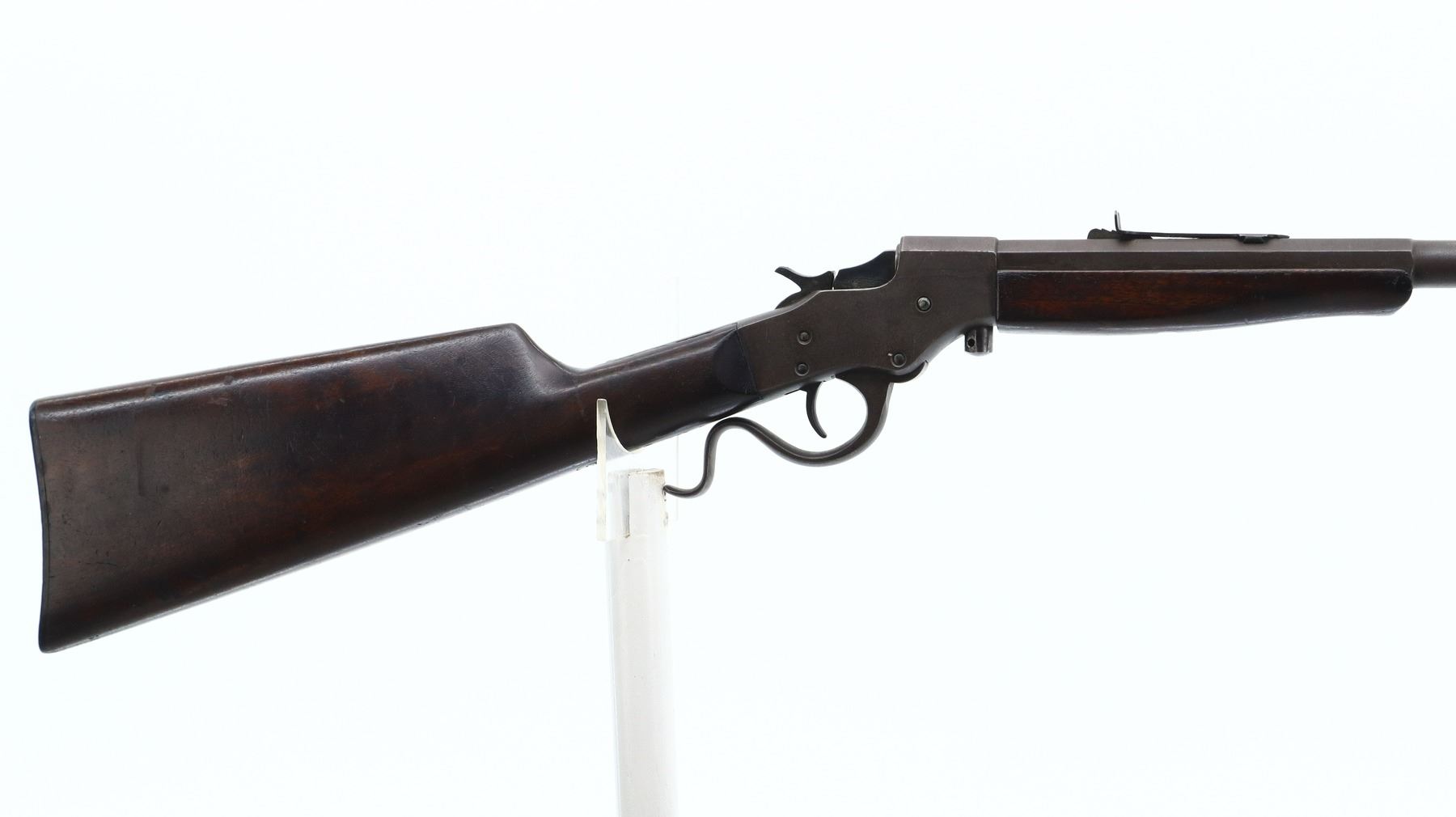4/10, STEVENS, MODEL: FAVORITE , CALIBER:32 LONG RF, BORE IS POOR, PITTED WORN. BLADE FRONT SIGHT, ADJUSTABLE U NOTCHED REAR SIGHT, 1/3RD OCTAGON 2/3RD ROUND BARREL, CHECKERED SPUR HAMMER. TWO PIECE SMOOTH WOOD STOCKS, STRAIGHT GRIP, CHECKERED BLACK POLYMER BUTT PLATE, MISSING TAKE DOWN RING. METAL FINISH TURNING BROWN WITH LIGHT PITTING, RUST SPECKLES, HANDLING MARKS AND WEAR. STOCKS SHOW MARKS, SCRATCHES AND WEAR. , ACTION: SINGLE SHOT DROP BLOCK RIFLE, BARREL LENGTH: 24", SERIAL # X894, CONDITION: 4/10, CLASS: CANADIAN NON RESTRICTED