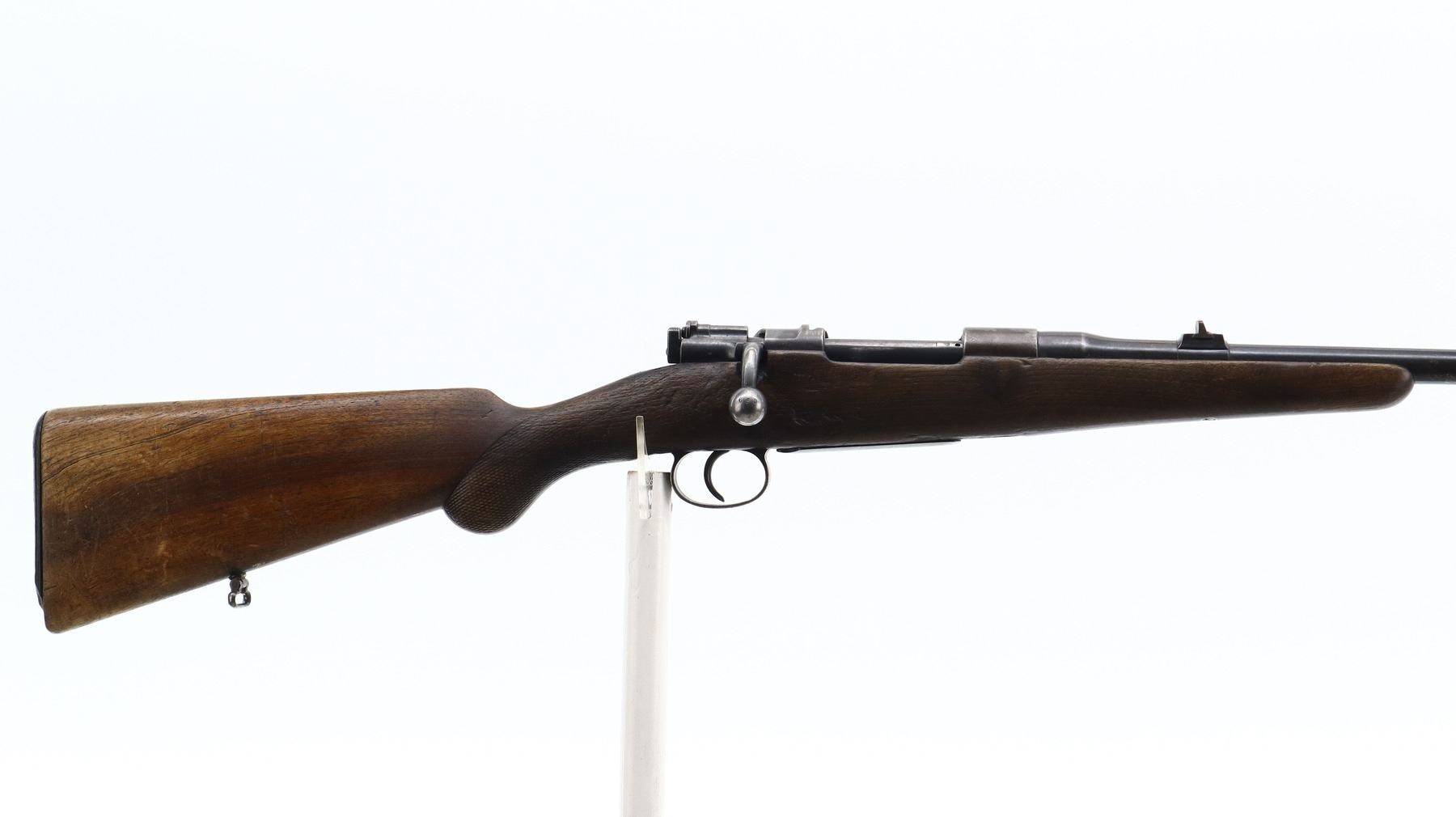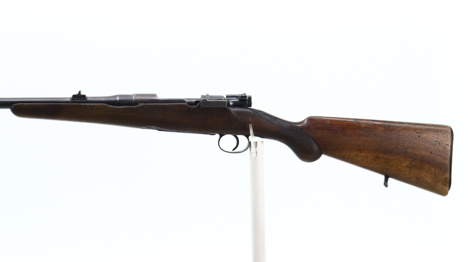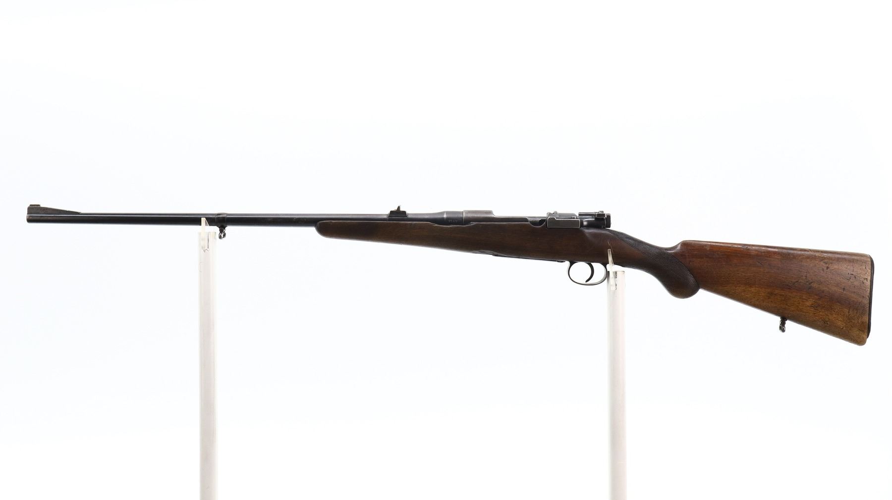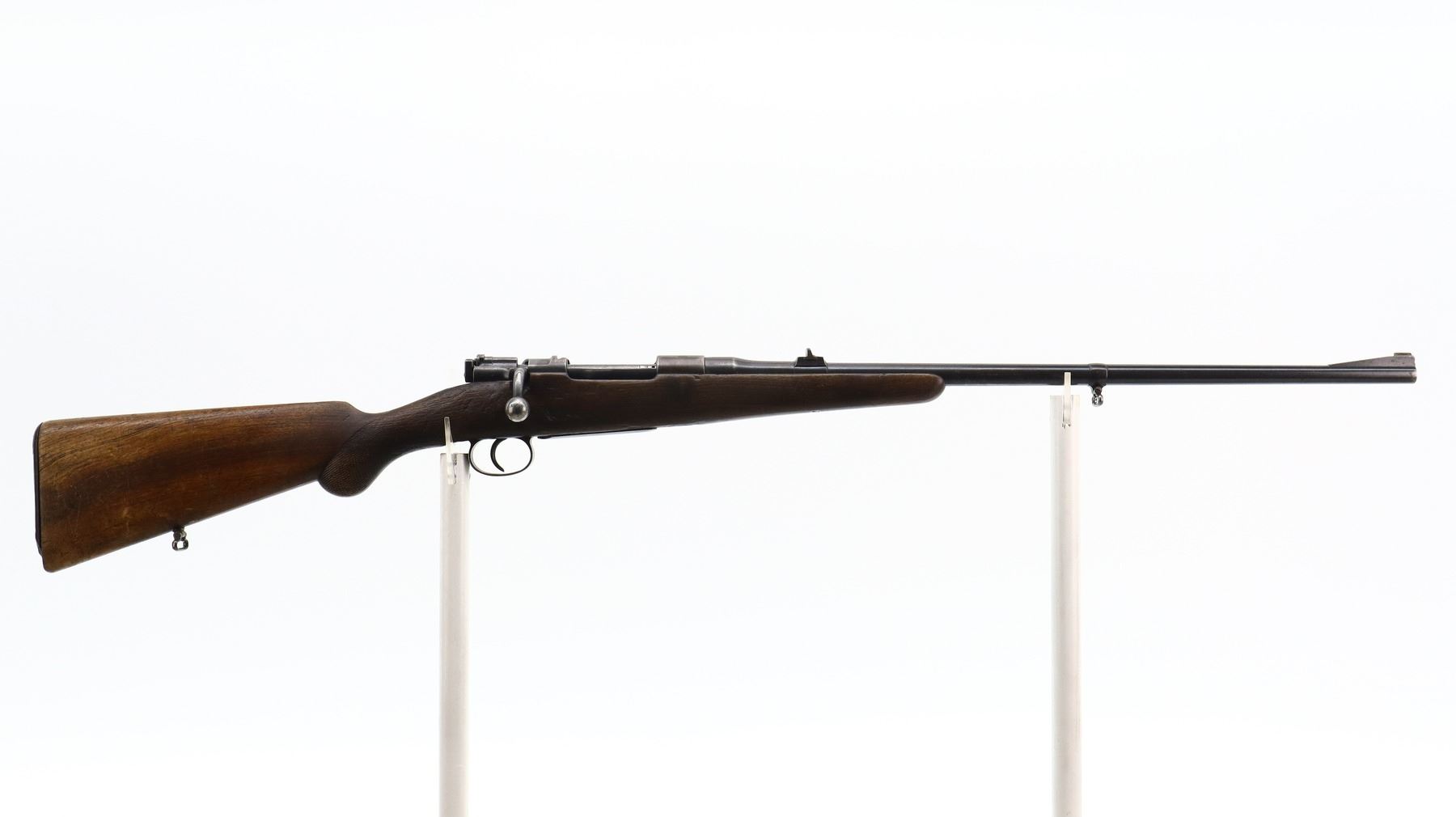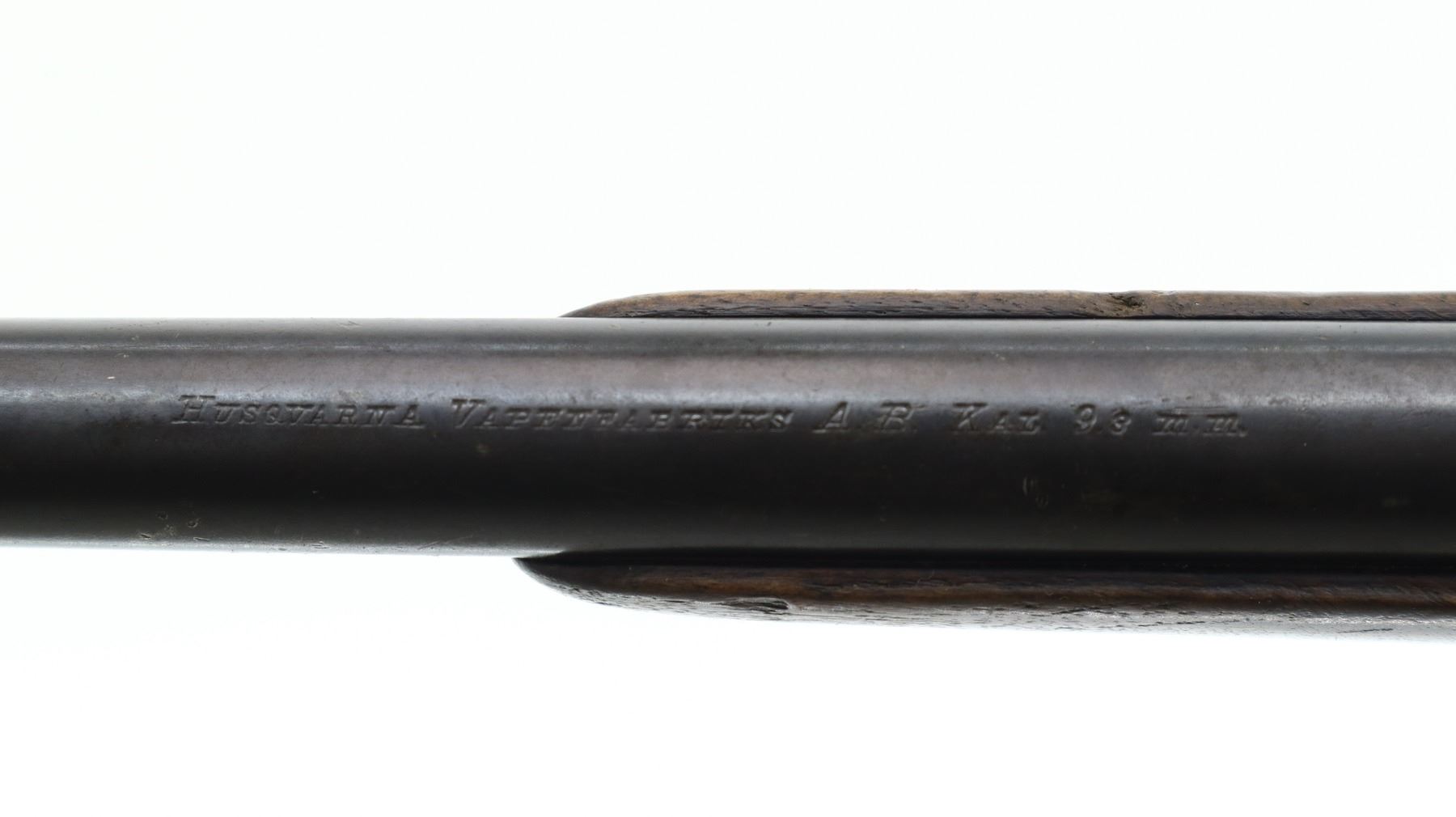 3+/10, HUSQVARNA, MODEL: SMALL RING SPORTER, CALIBER:9.3 X 57, BORE IS FAIR, WORN, LIGHT PITTING. BLADE FRONT SIGHT WITH RAMP, REPAIRED U NOTCHED REAR SIGHT, BLUED FINISH, TURNED DOWN BOLT HANDLE. ONE PIECE WOOD STOCK, FOREND CHIPPED, CHECKERED PISTOL GRIP, GROOVED BLACK POLYMER BUTT PLATE CHIPPED AT TOE, SLING SWIVELS. METAL FINISH SHOWS SOME LIGHT RUST SPECKLES, SCRATCHES, HANDLING MARKS AND WEAR. STOCK SHOWS MARKS, SCRATCHES AND WEAR. , ACTION: BOLT ACTION RIFLE, BARREL LENGTH: 24", SERIAL # 1587, CONDITION: 3+/10, CLASS: CANADIAN NON RESTRICTED