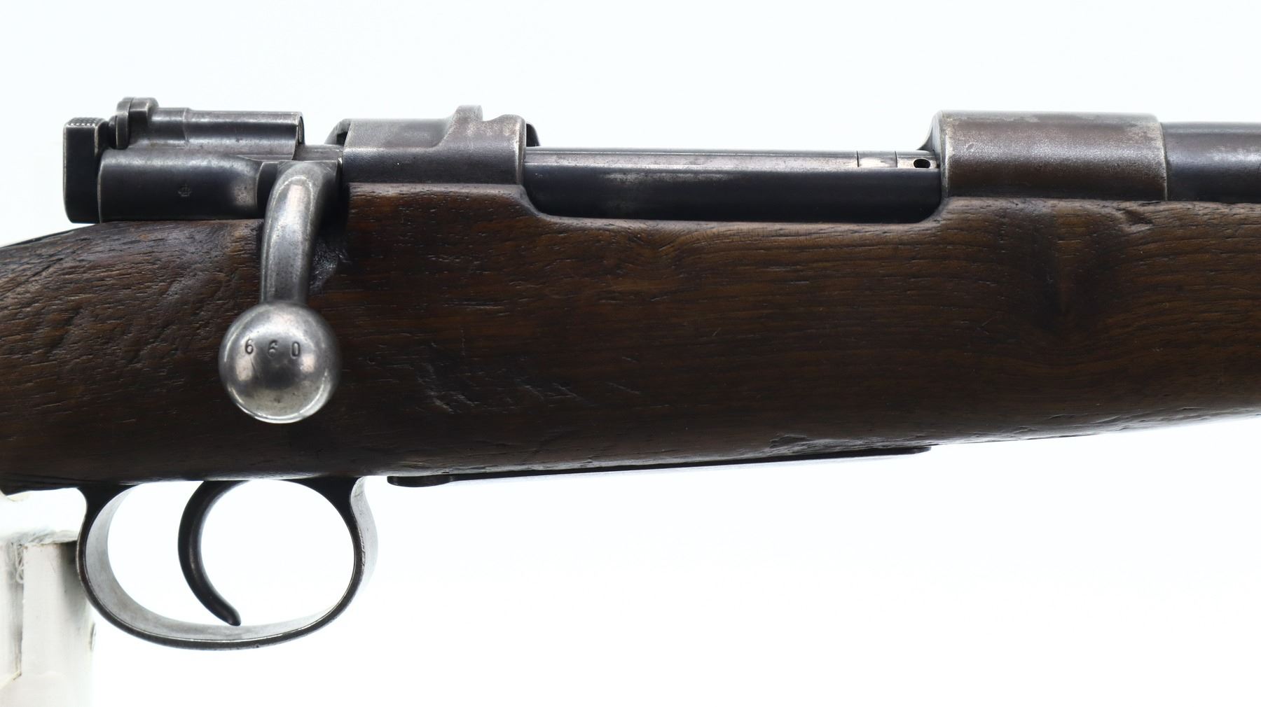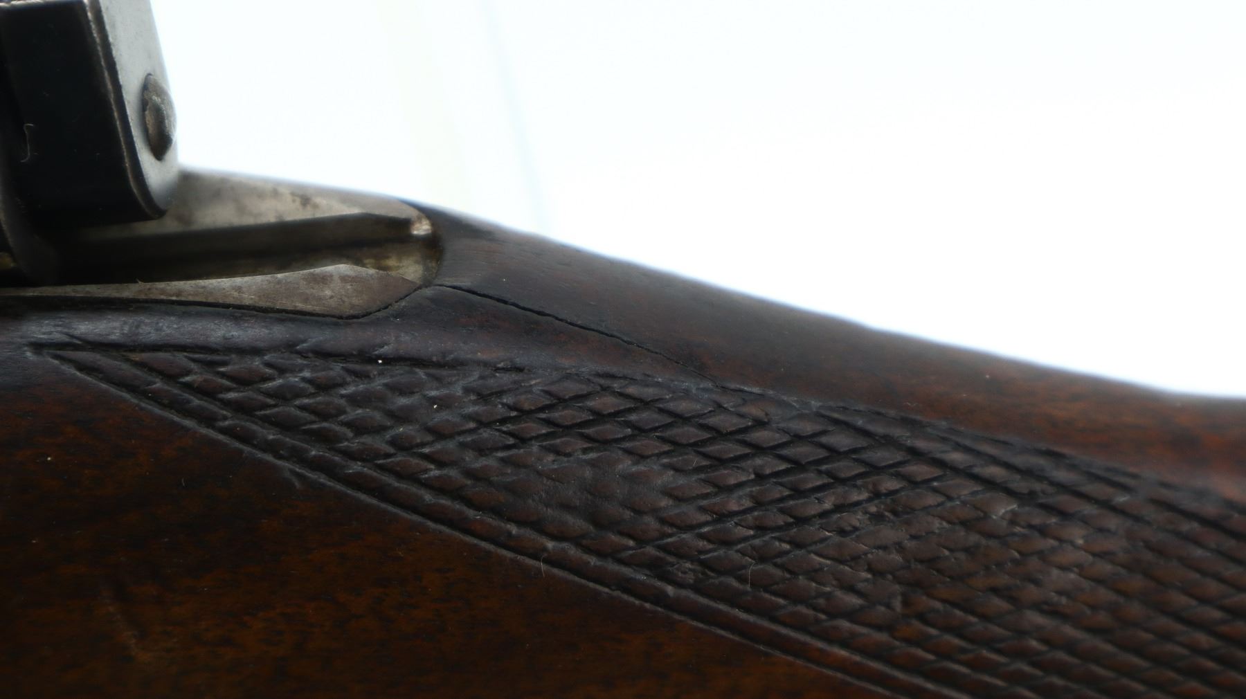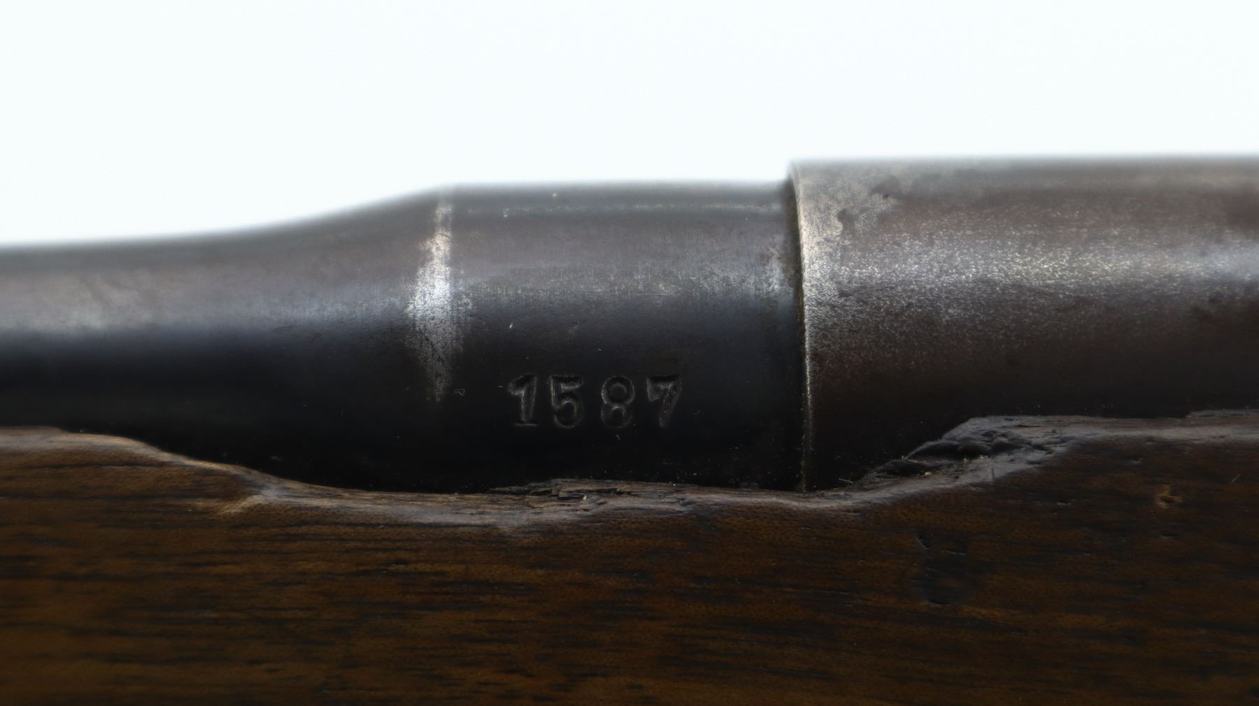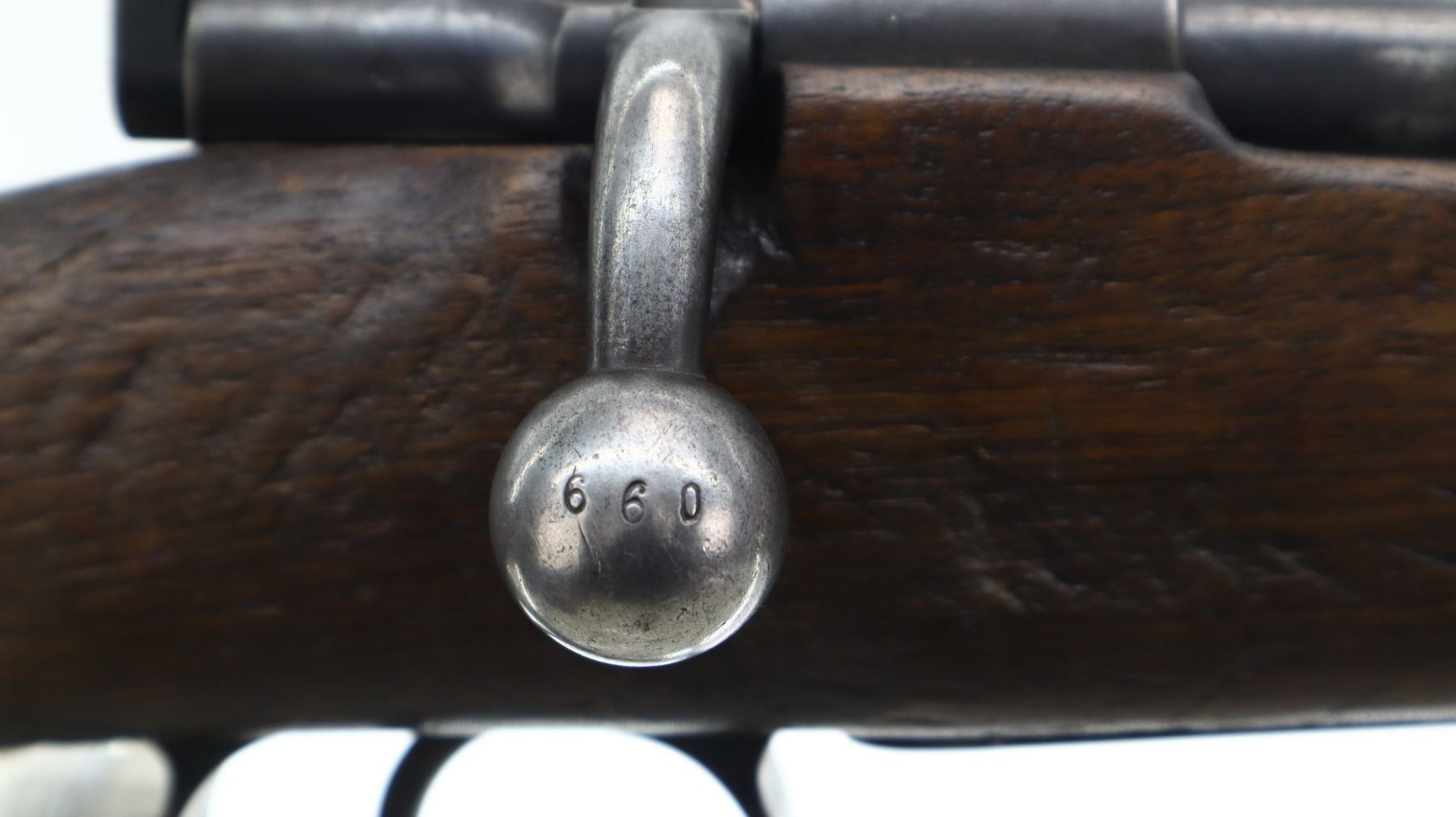 3+/10, HUSQVARNA, MODEL: SMALL RING SPORTER, CALIBER:9.3 X 57, BORE IS FAIR, WORN, LIGHT PITTING. BLADE FRONT SIGHT WITH RAMP, REPAIRED U NOTCHED REAR SIGHT, BLUED FINISH, TURNED DOWN BOLT HANDLE. ONE PIECE WOOD STOCK, FOREND CHIPPED, CHECKERED PISTOL GRIP, GROOVED BLACK POLYMER BUTT PLATE CHIPPED AT TOE, SLING SWIVELS. METAL FINISH SHOWS SOME LIGHT RUST SPECKLES, SCRATCHES, HANDLING MARKS AND WEAR. STOCK SHOWS MARKS, SCRATCHES AND WEAR. , ACTION: BOLT ACTION RIFLE, BARREL LENGTH: 24", SERIAL # 1587, CONDITION: 3+/10, CLASS: CANADIAN NON RESTRICTED